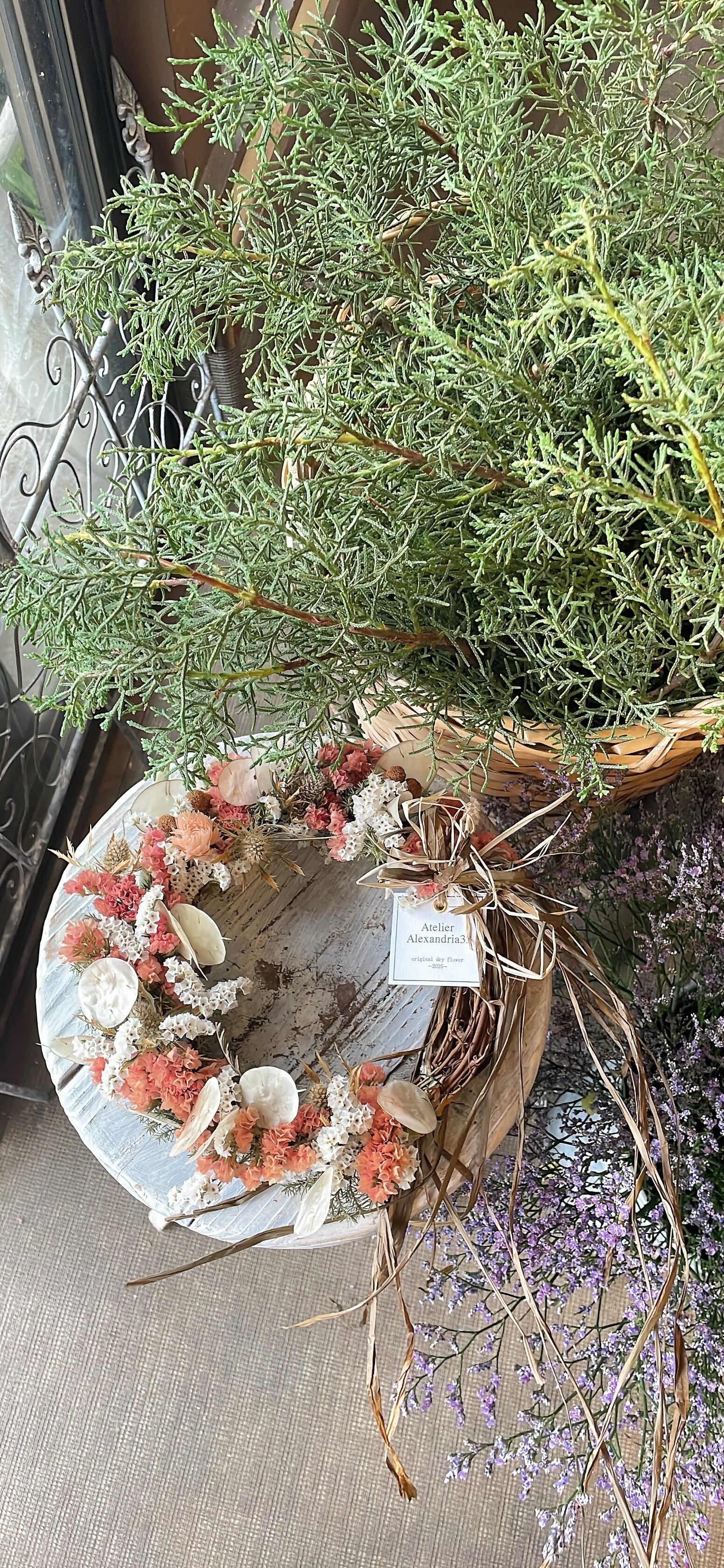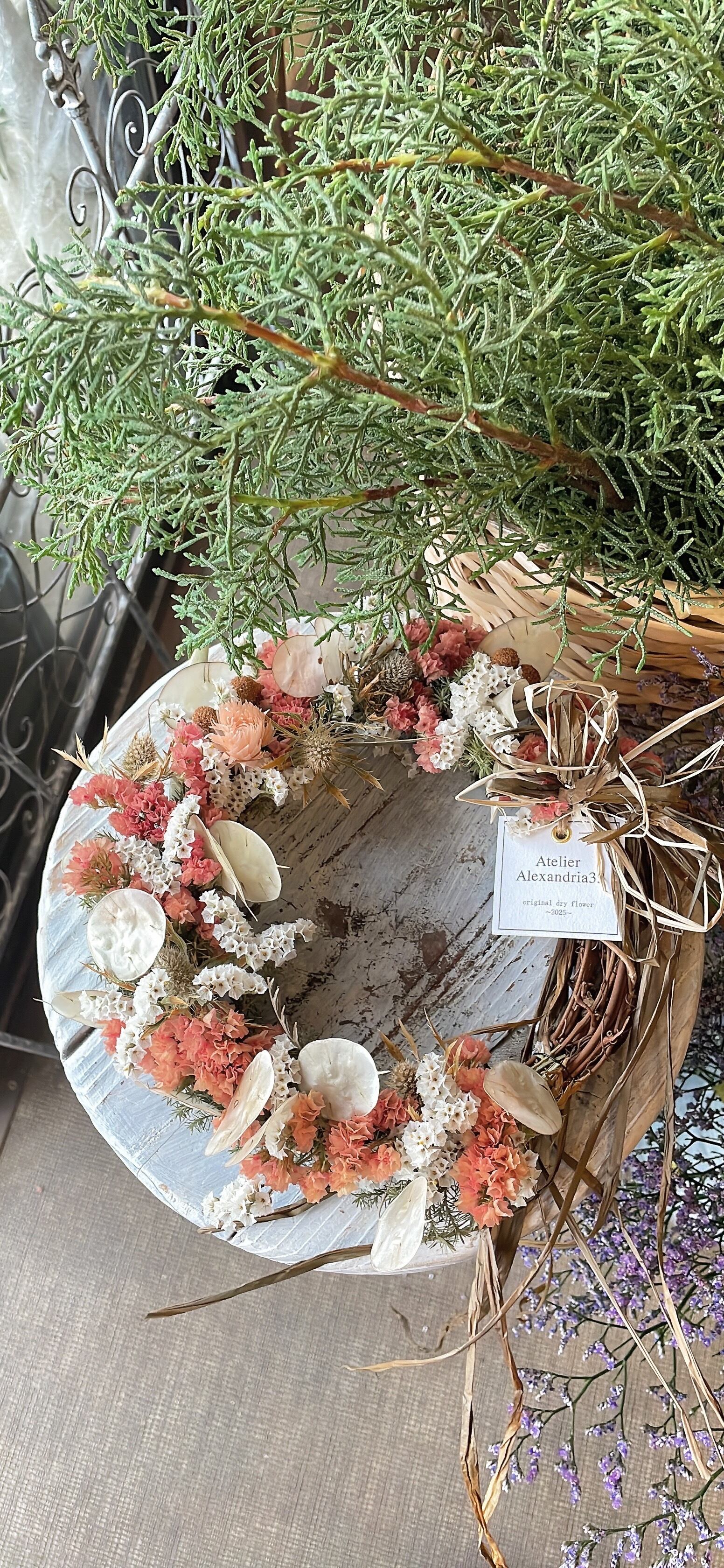 ドライフラワーの特性を活かしたこのリースは、長期間にわたってその美しさを楽しむことができ、インテリアとしてはもちろん、