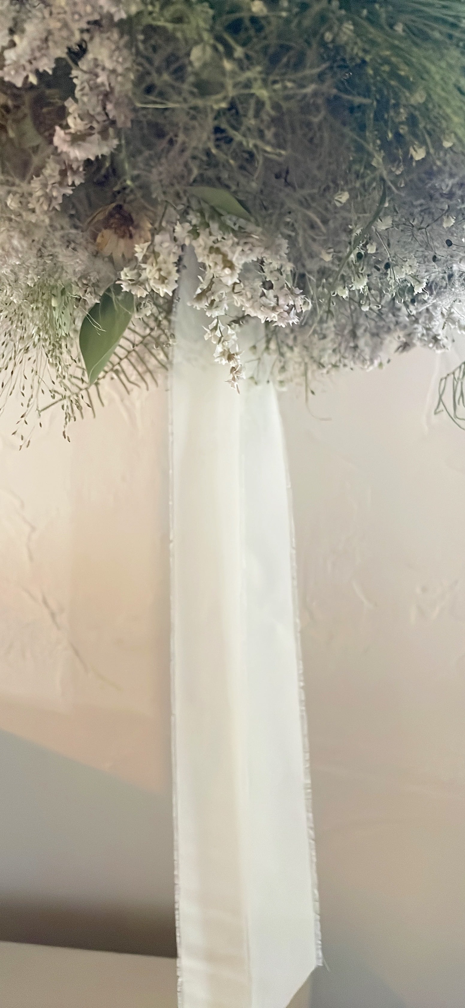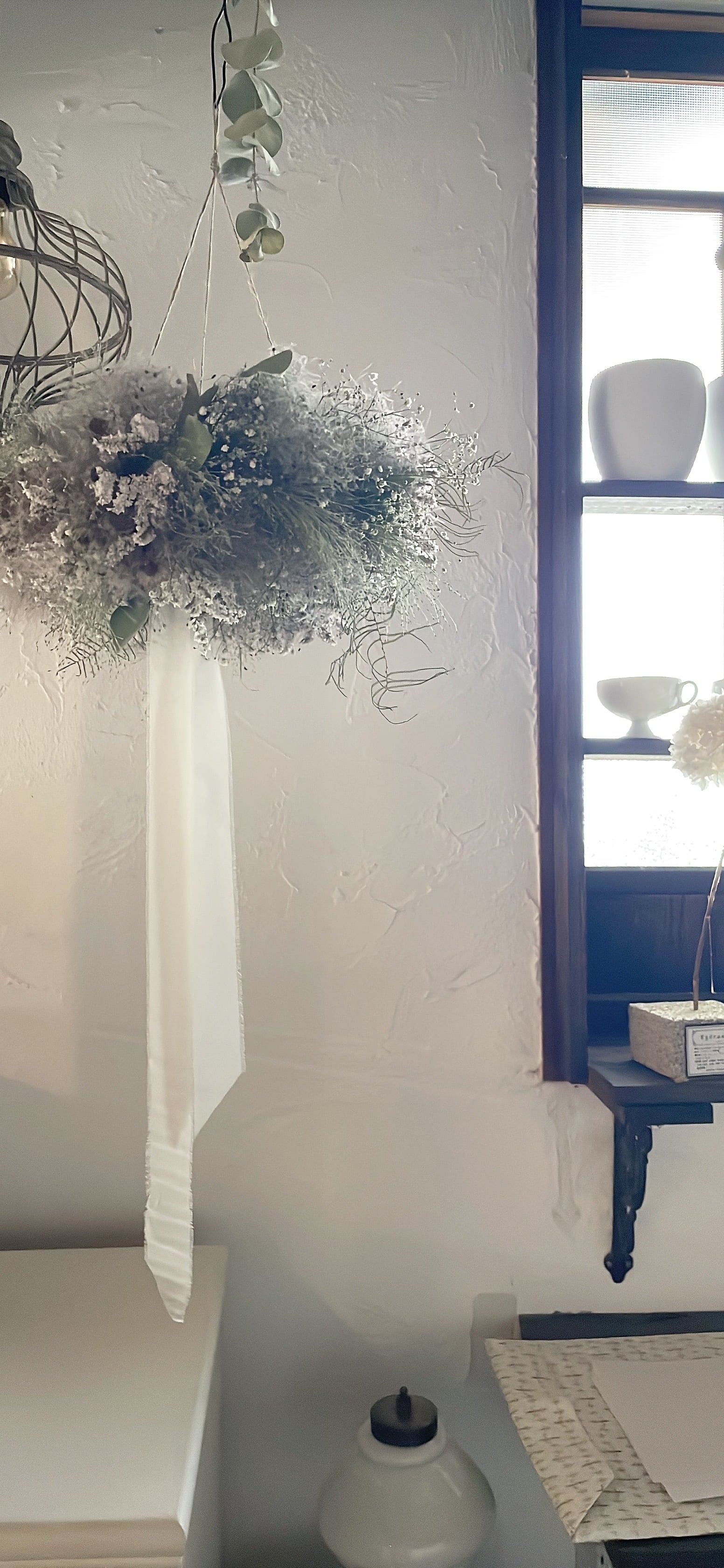 ドライフラワーの特性を活かしたこのフライングリースは、長期間にわたってその美しさを楽しむことができ、インテリアとしてはもちろん、特別な贈り物としても大変喜ばれる存在となります。スモークツリーの風合いが、さまざまなシーンで柔らかな彩りを添えます。