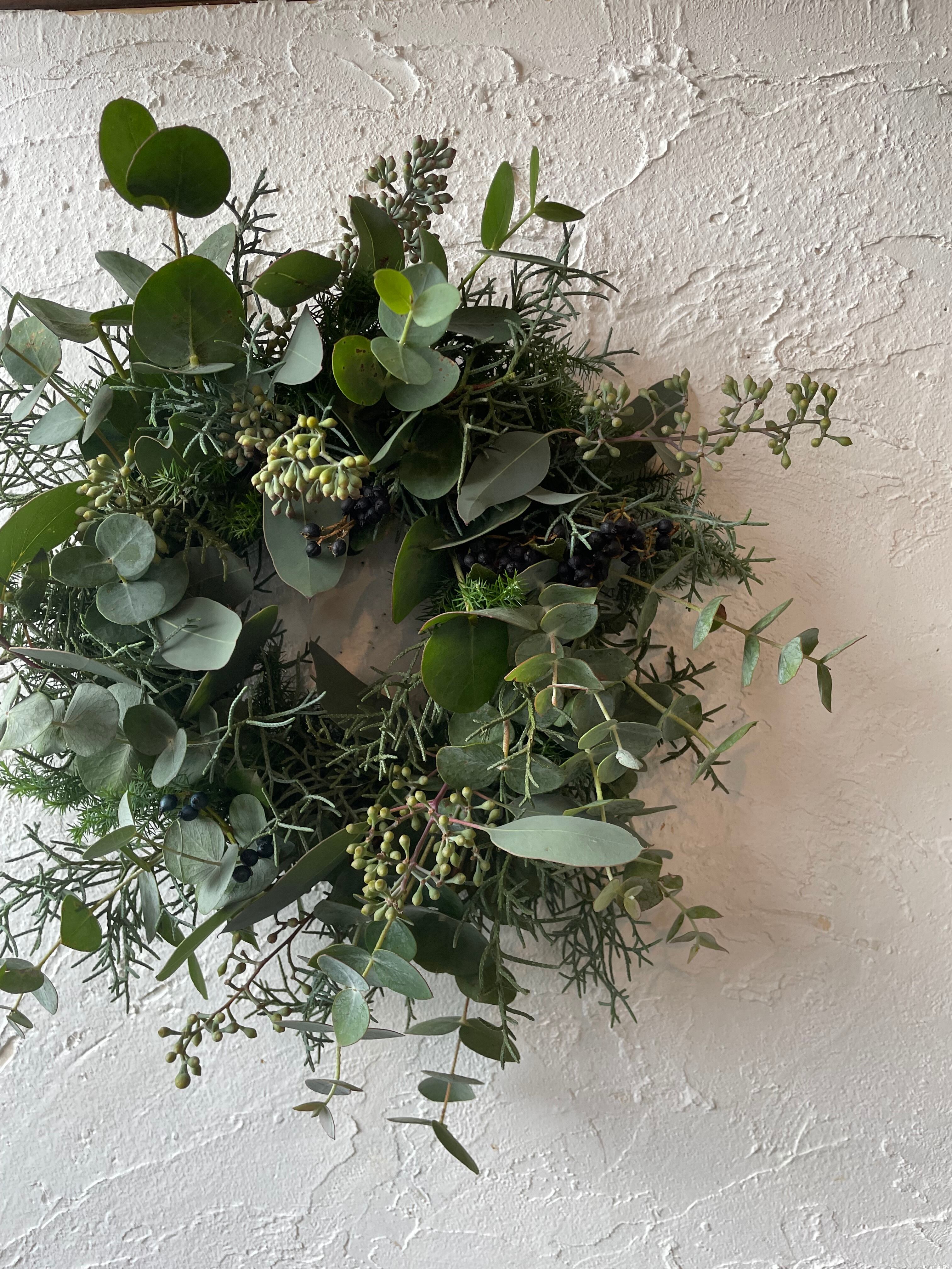 ワークショップにて製作させていただきましたユーカリや実物、グリーンを使ったリース