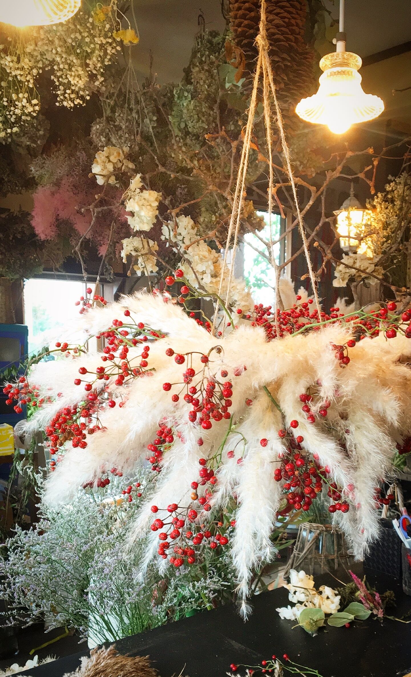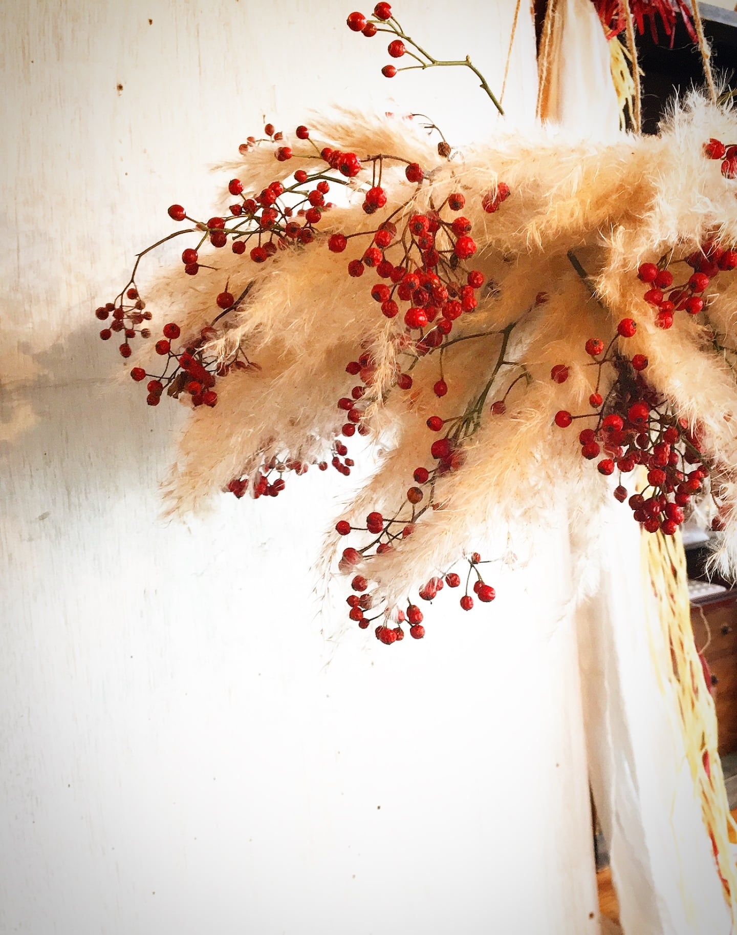 Flying wreath of wild roses and pampas野薔薇の実とパンパスのフライングリース