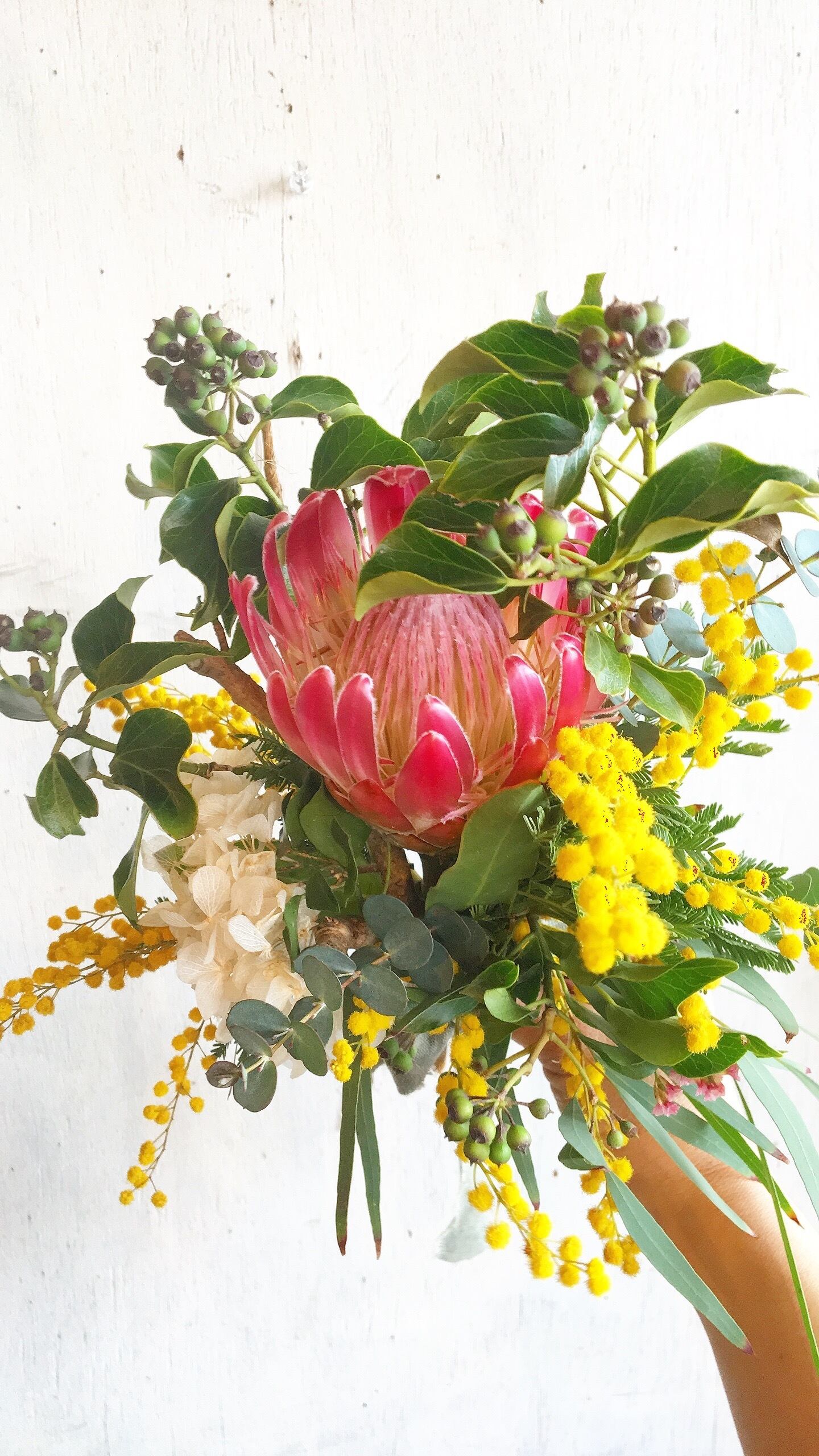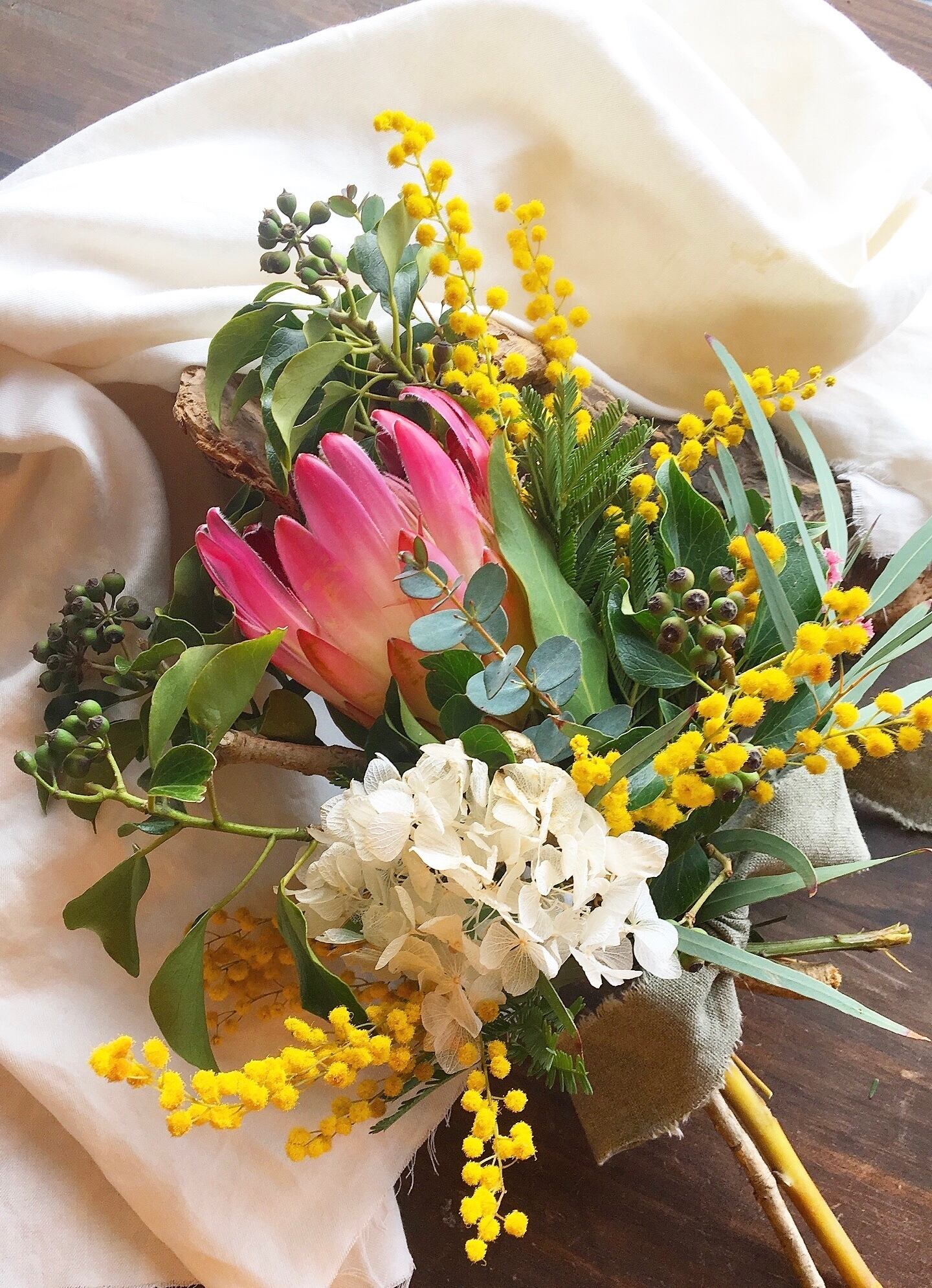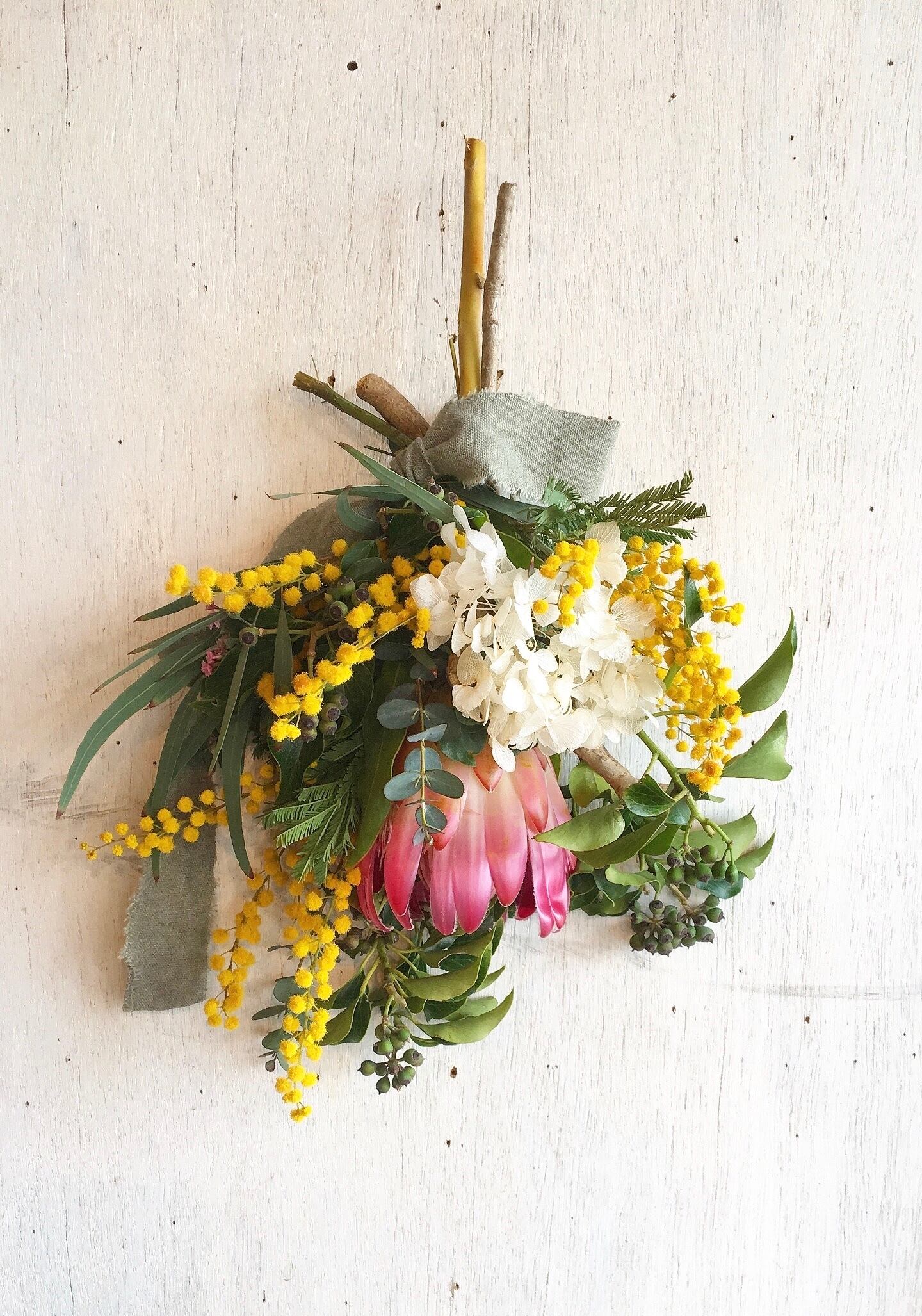 〜プロテアとミモザのブーケスワッグ〜