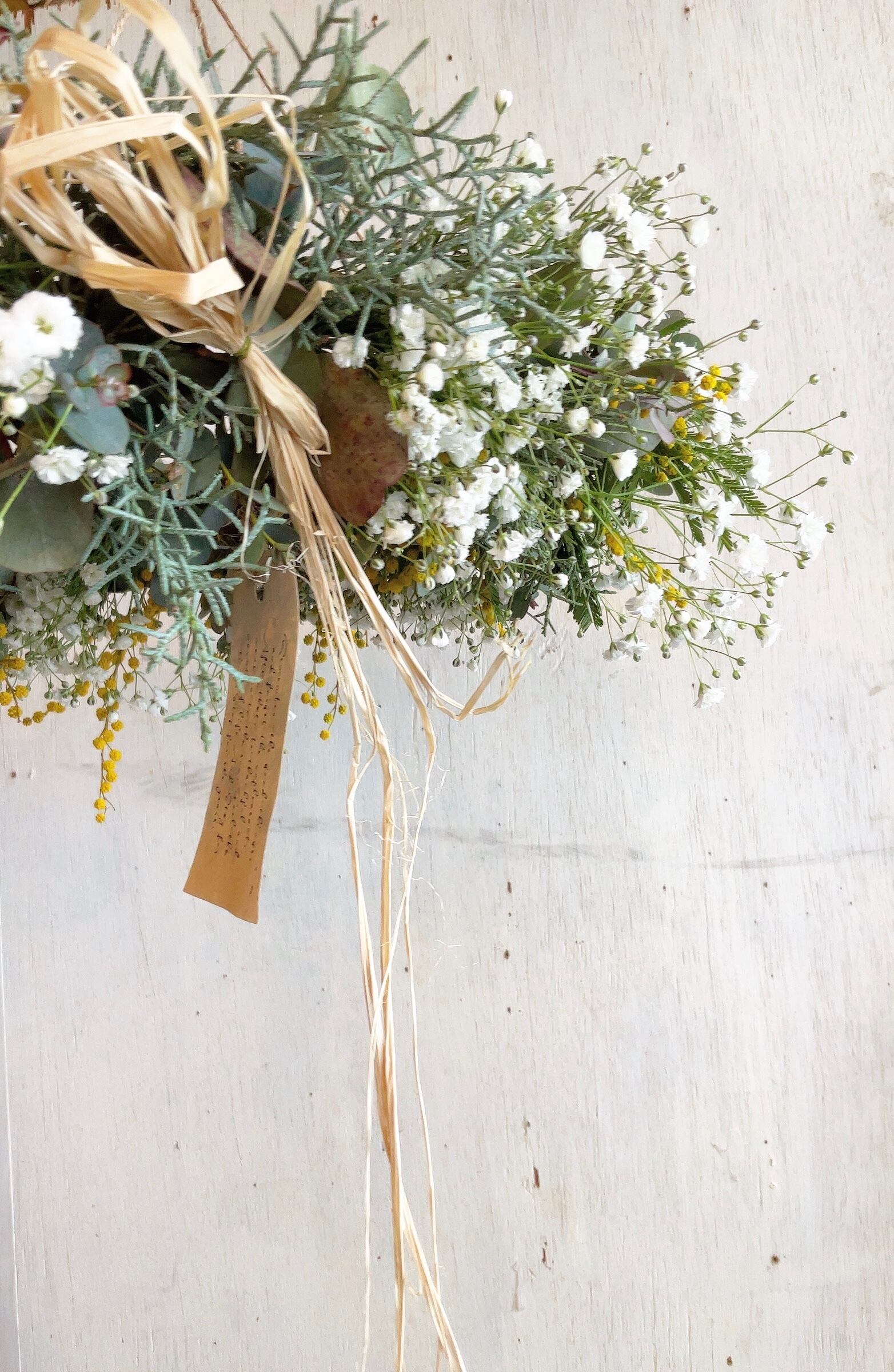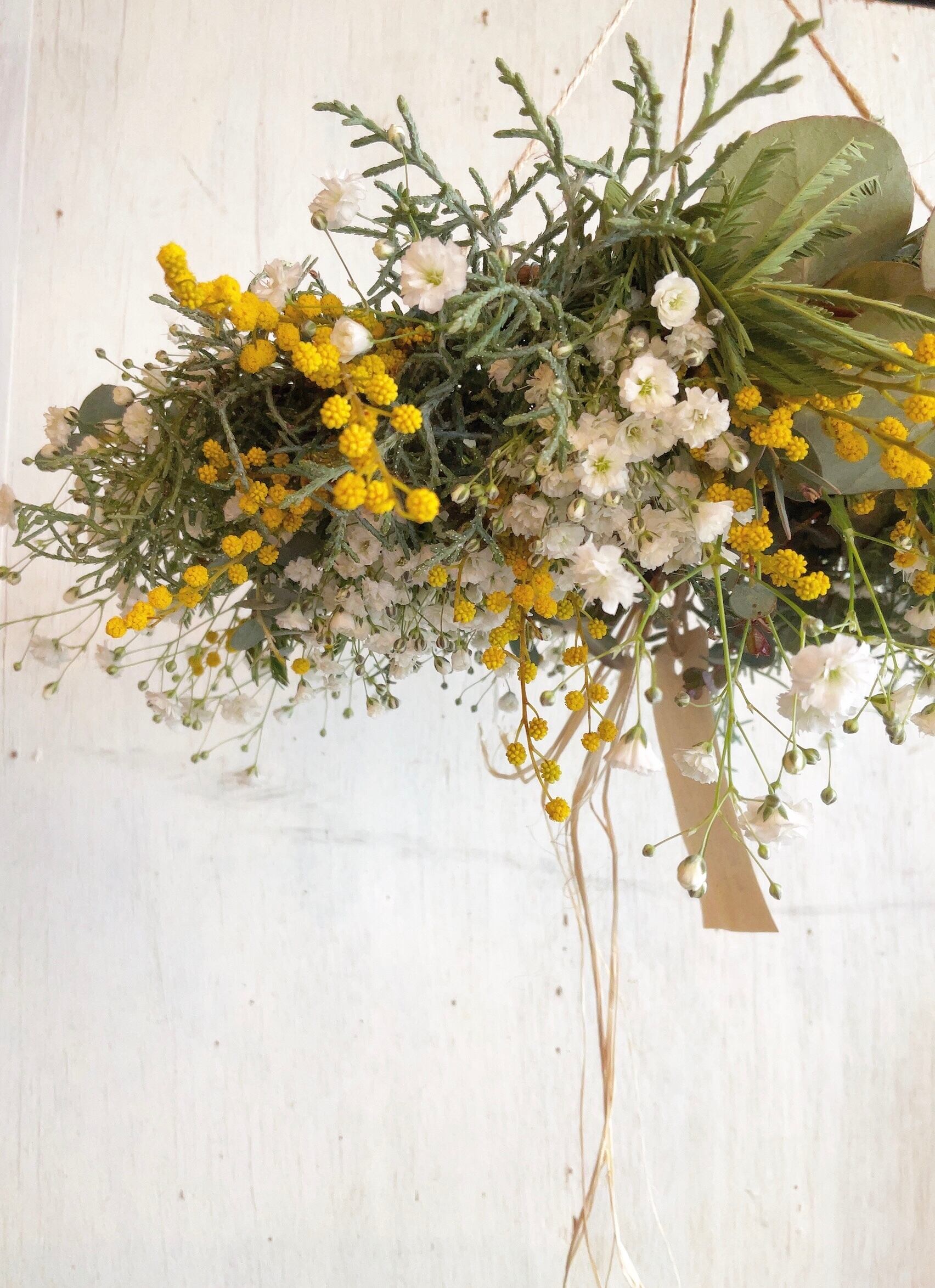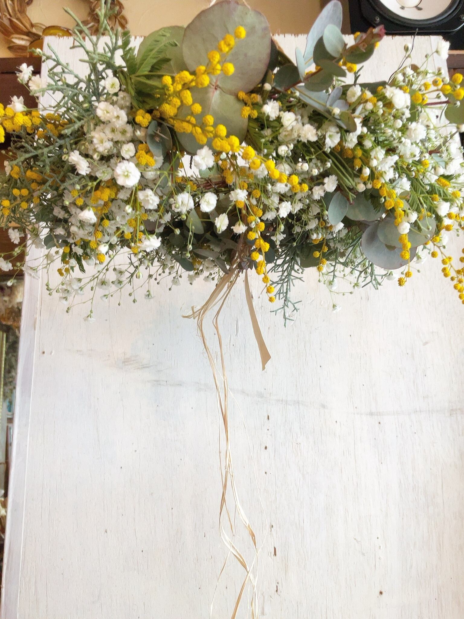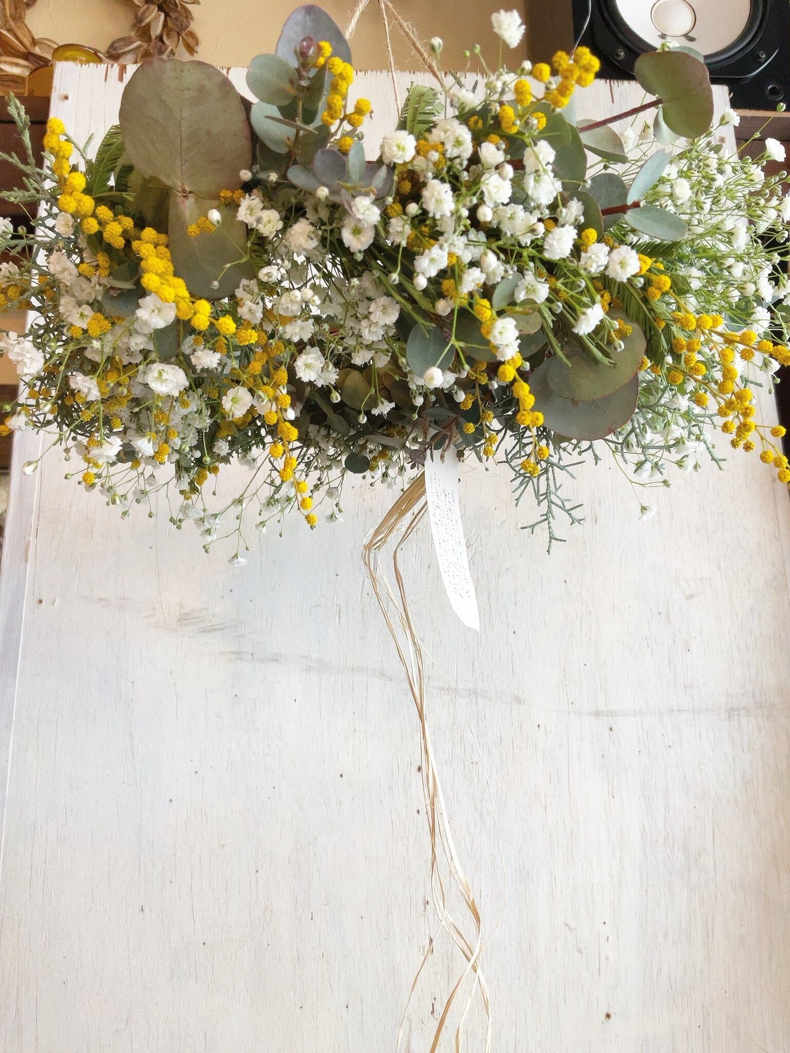 〜煌めくかすみ草とミモザ、ユーカリのフライングリース