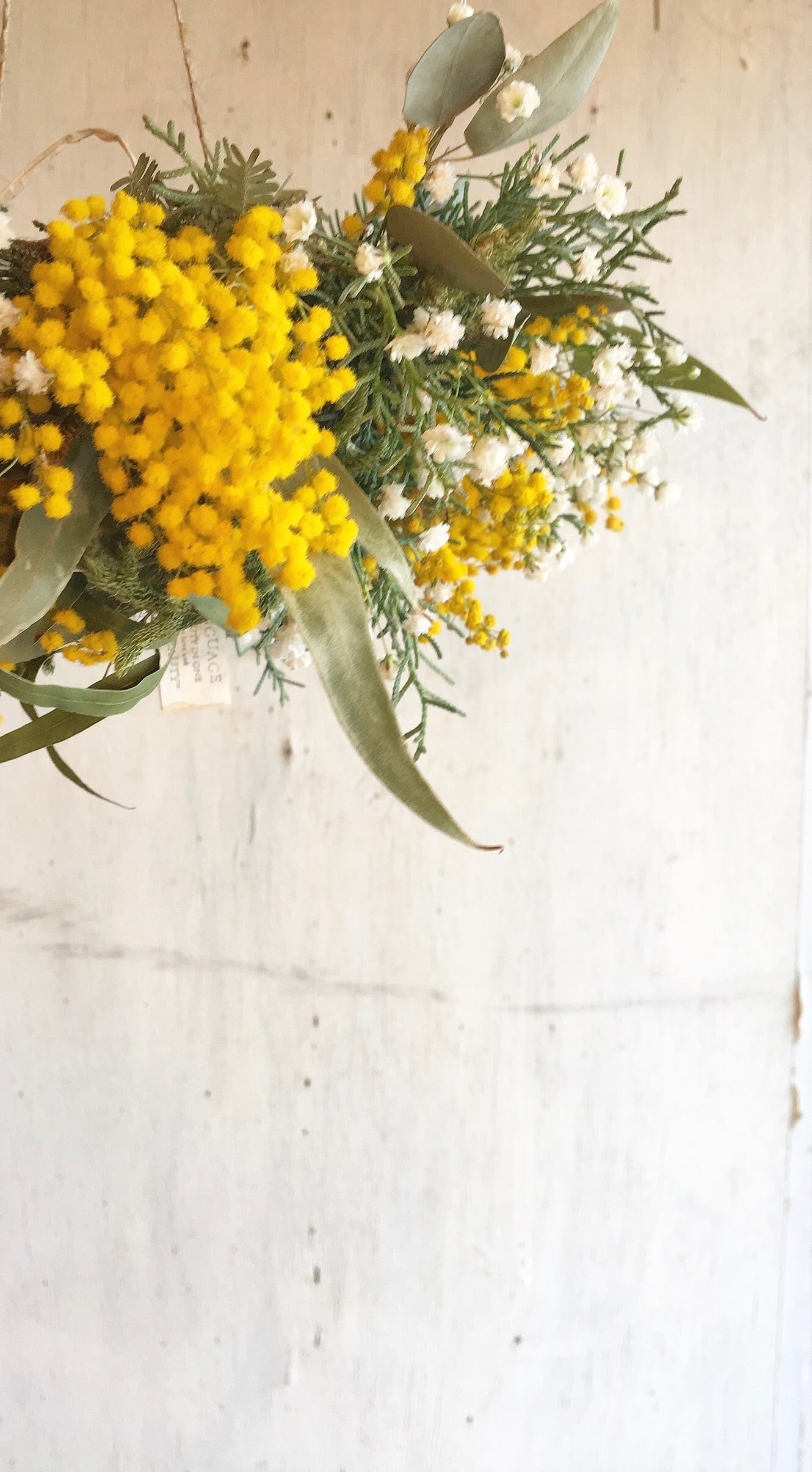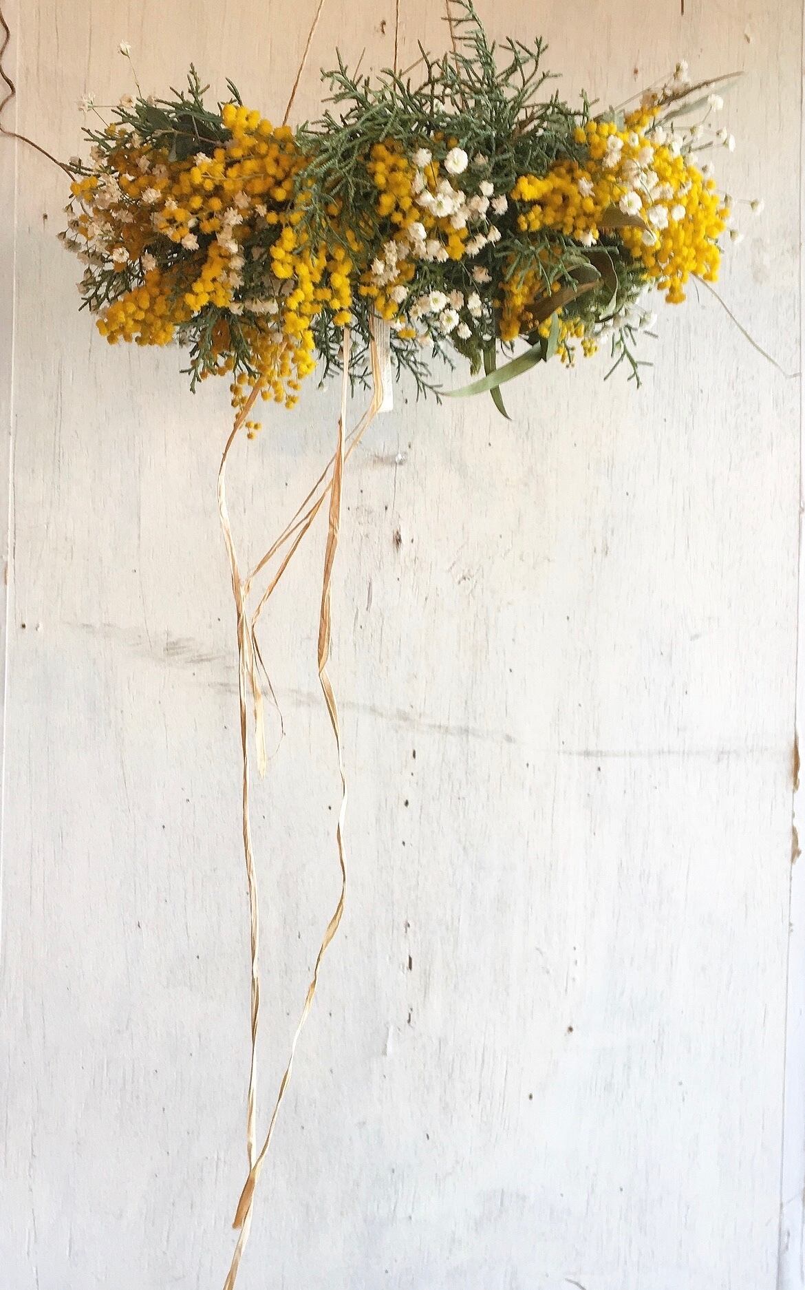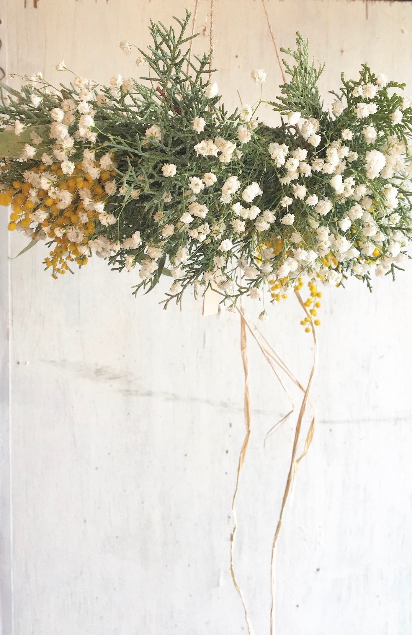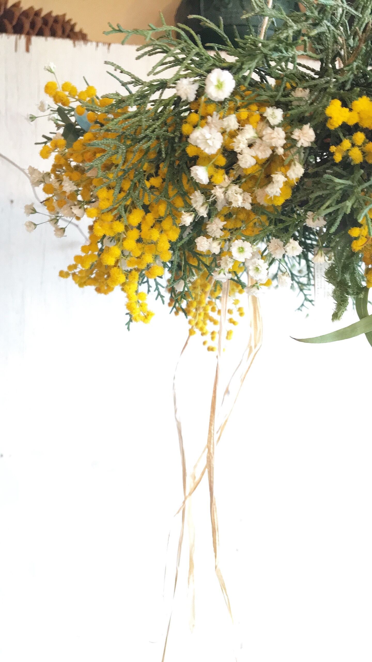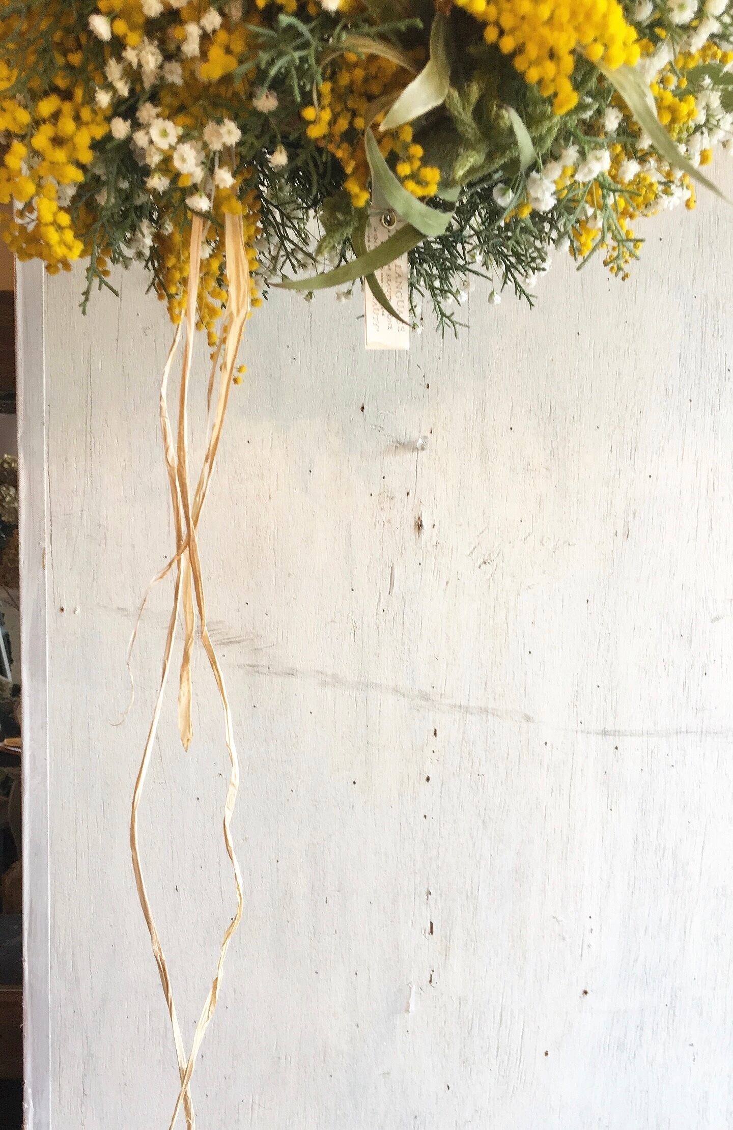 感じるミモザとかすみ草のフライングリース〜ドライフラワーリース