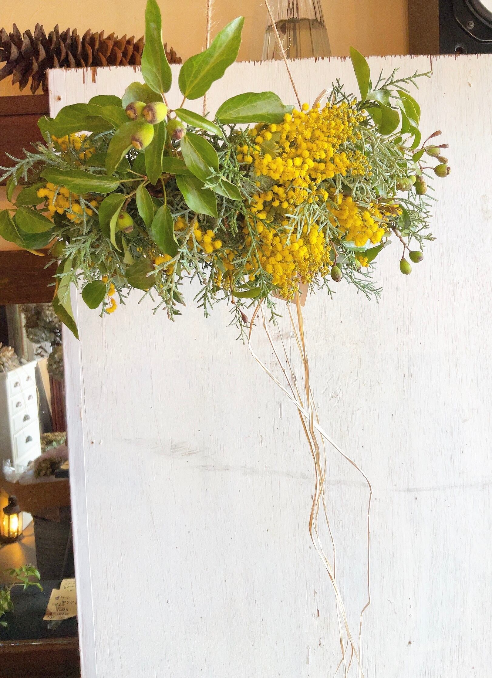 〜春風感じるミモザとかすみ草のフライングリース〜ドライフラワーリース