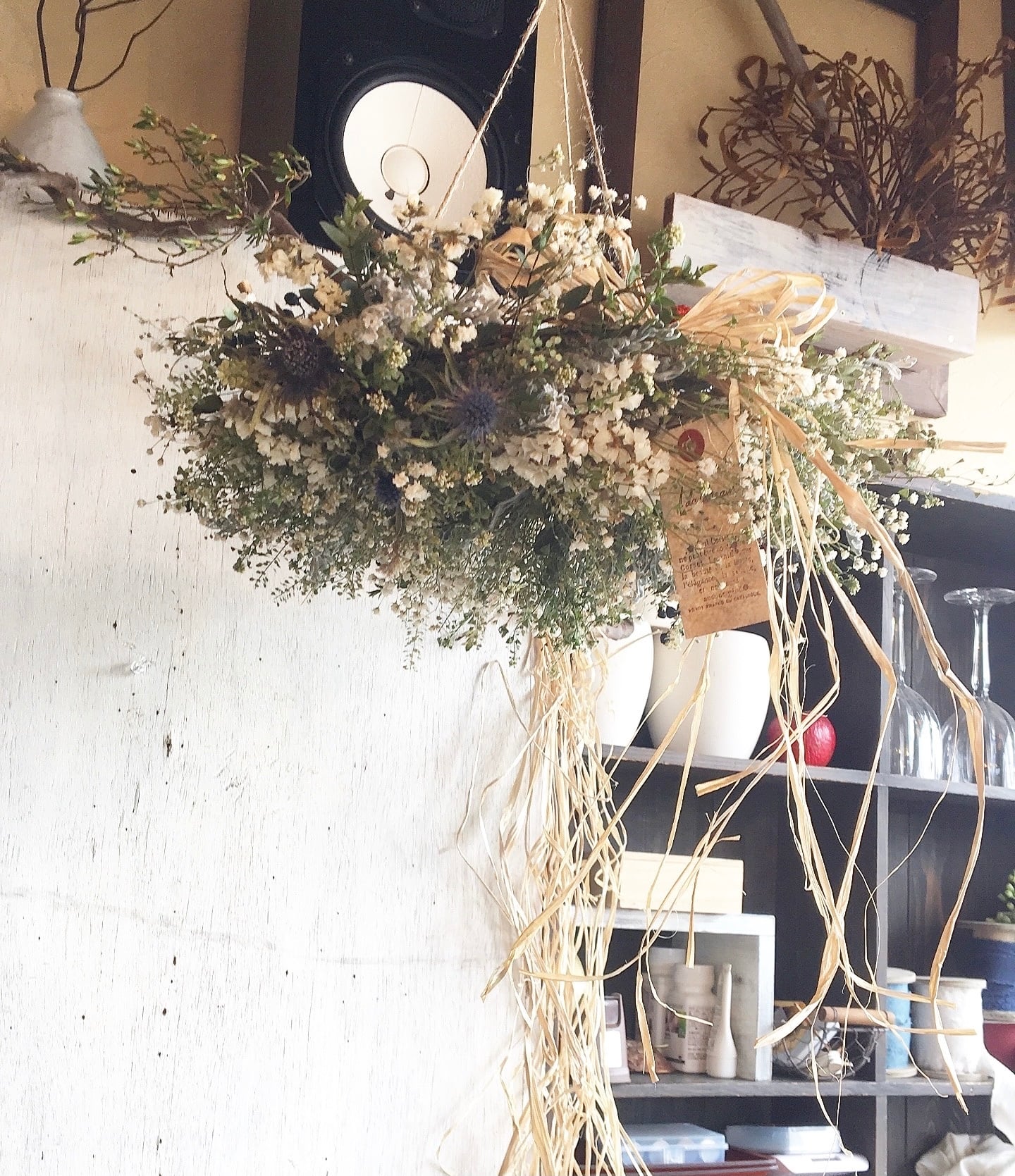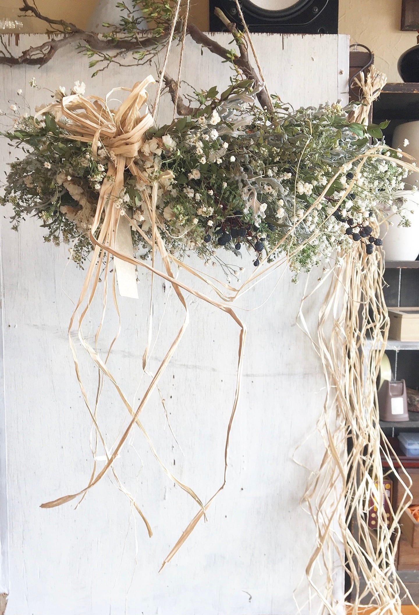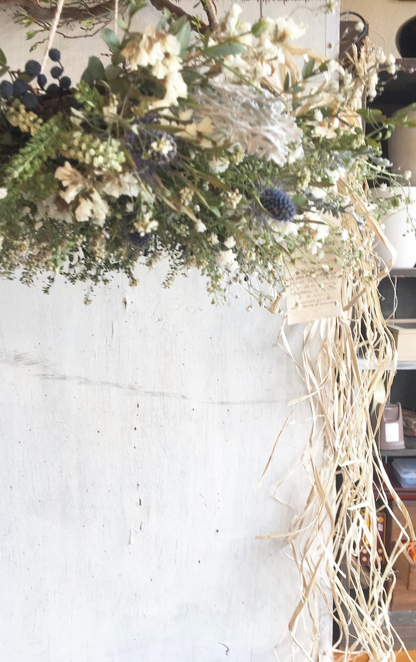 #ドライフラワーリース #かすみ草 #ミモザ #フライングリース #インテリア #北欧 #アンティーク #おうち時間 #カフェ #カフェインテリア #ブライダル #ウエルカムフラワー #かすみ草