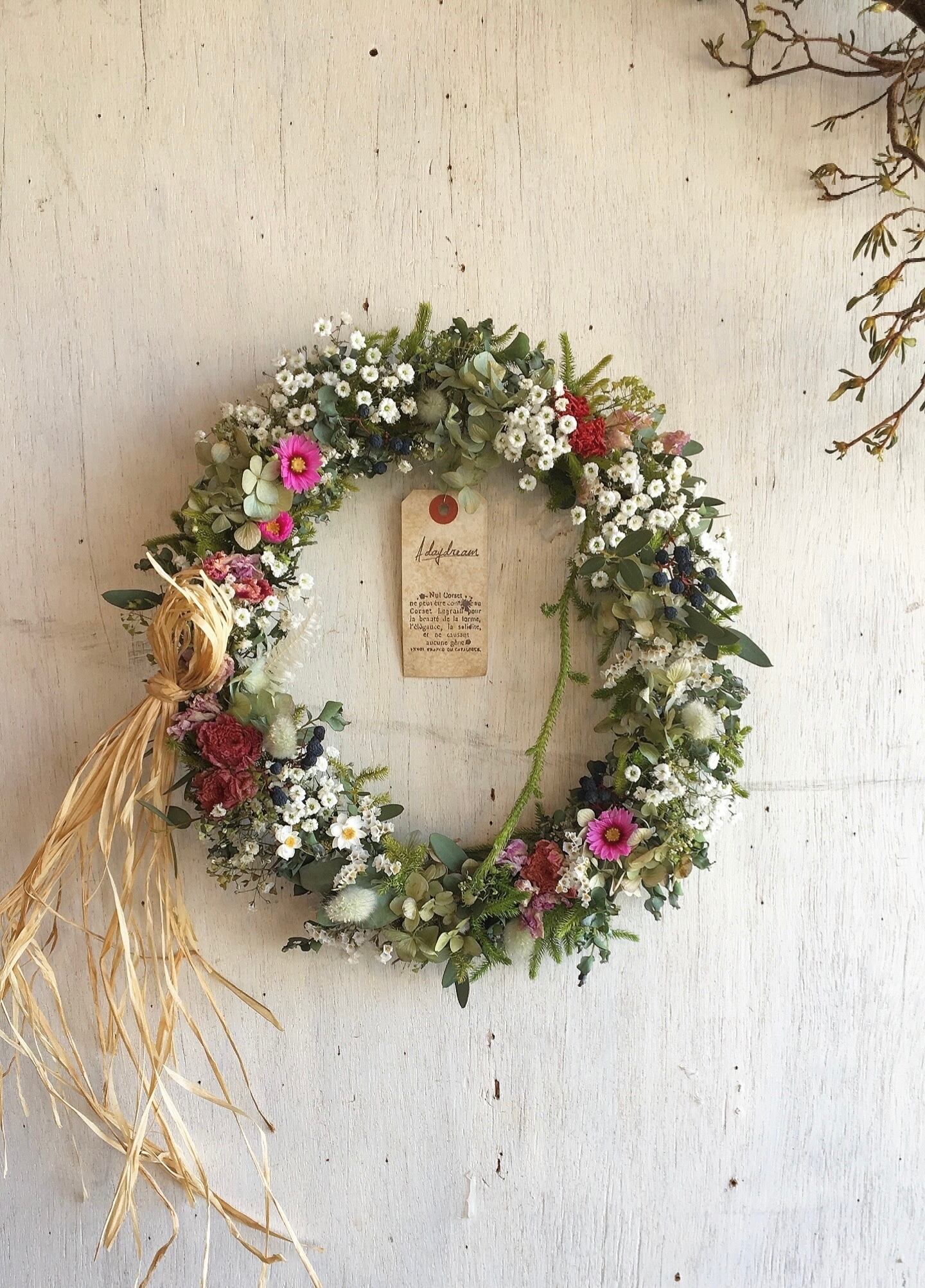 小花やラナンキュラスでアンティークな風合いのドライフラワーリース