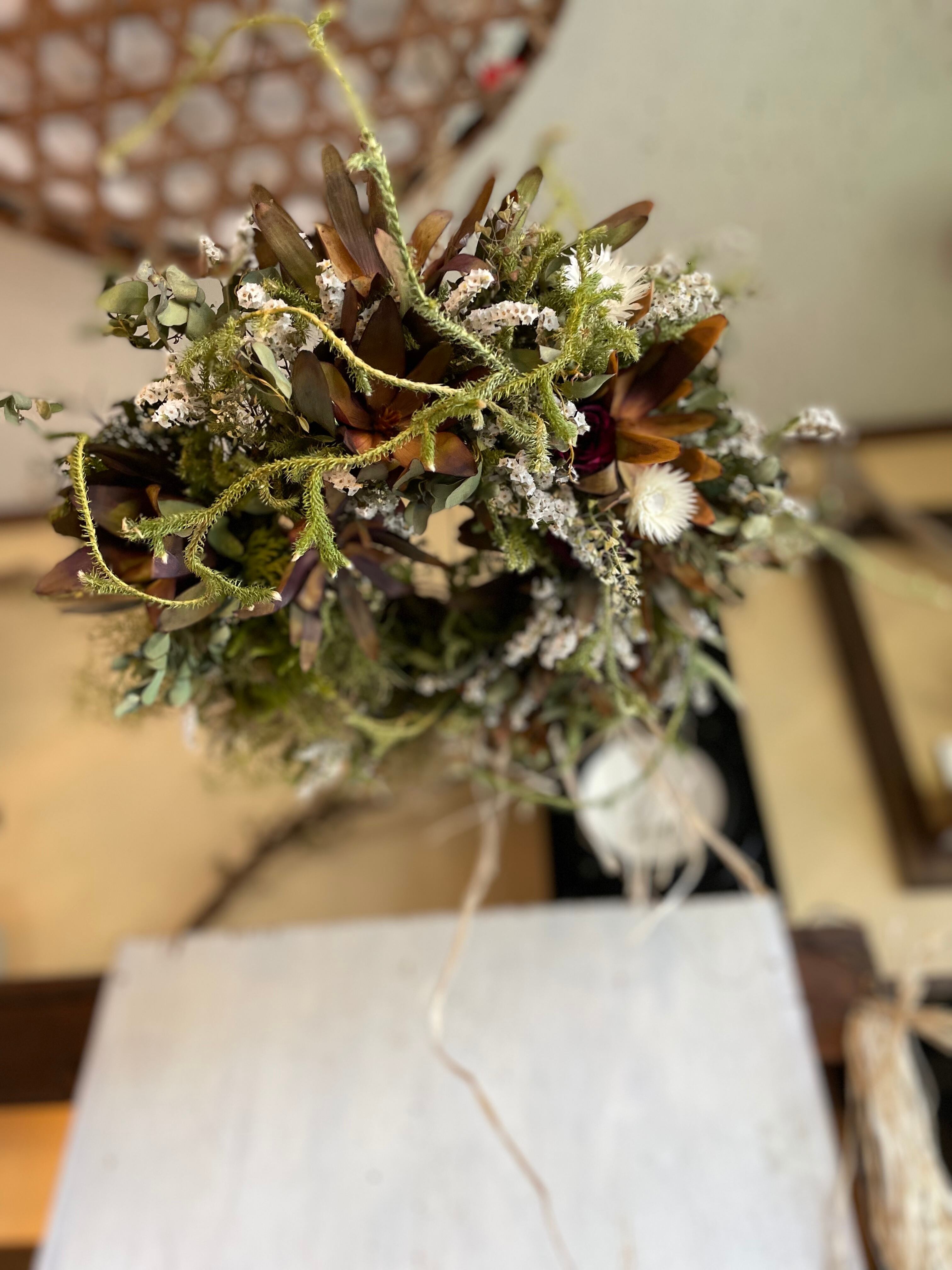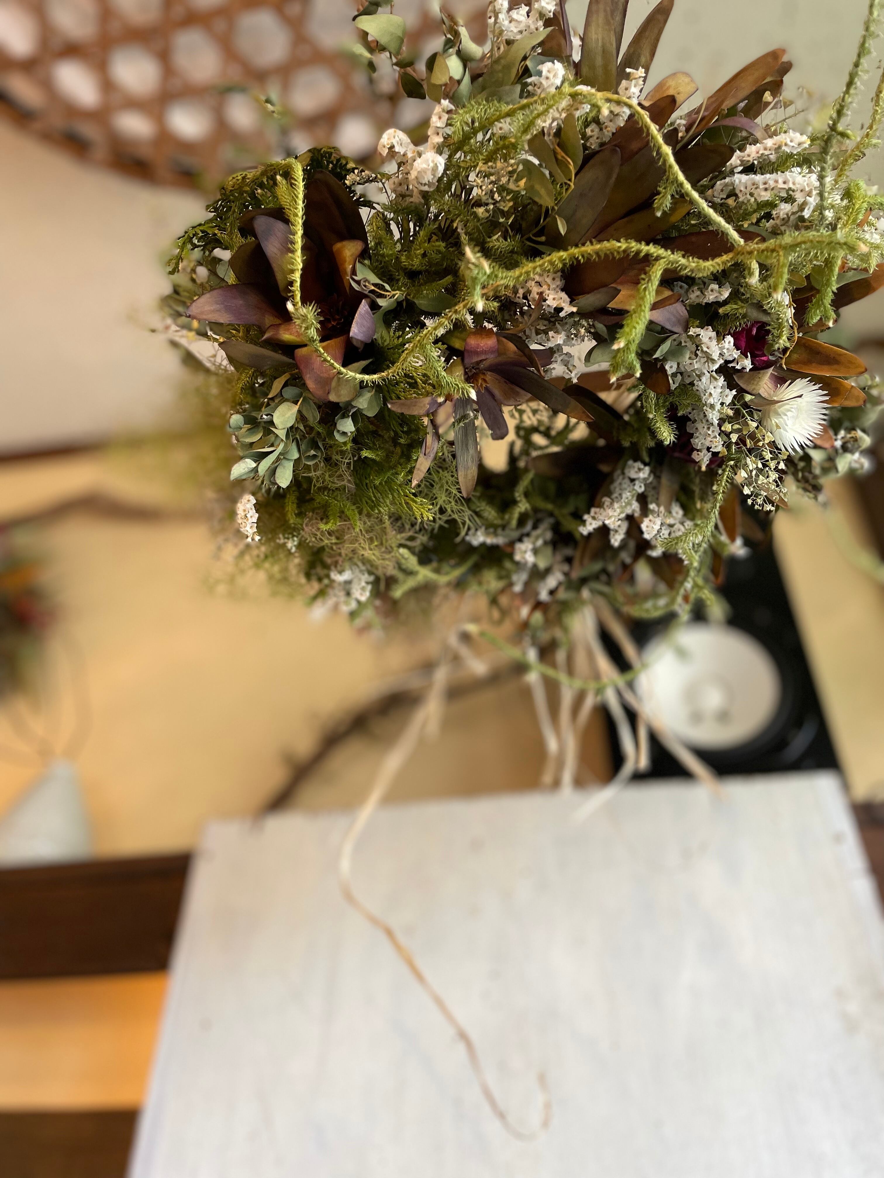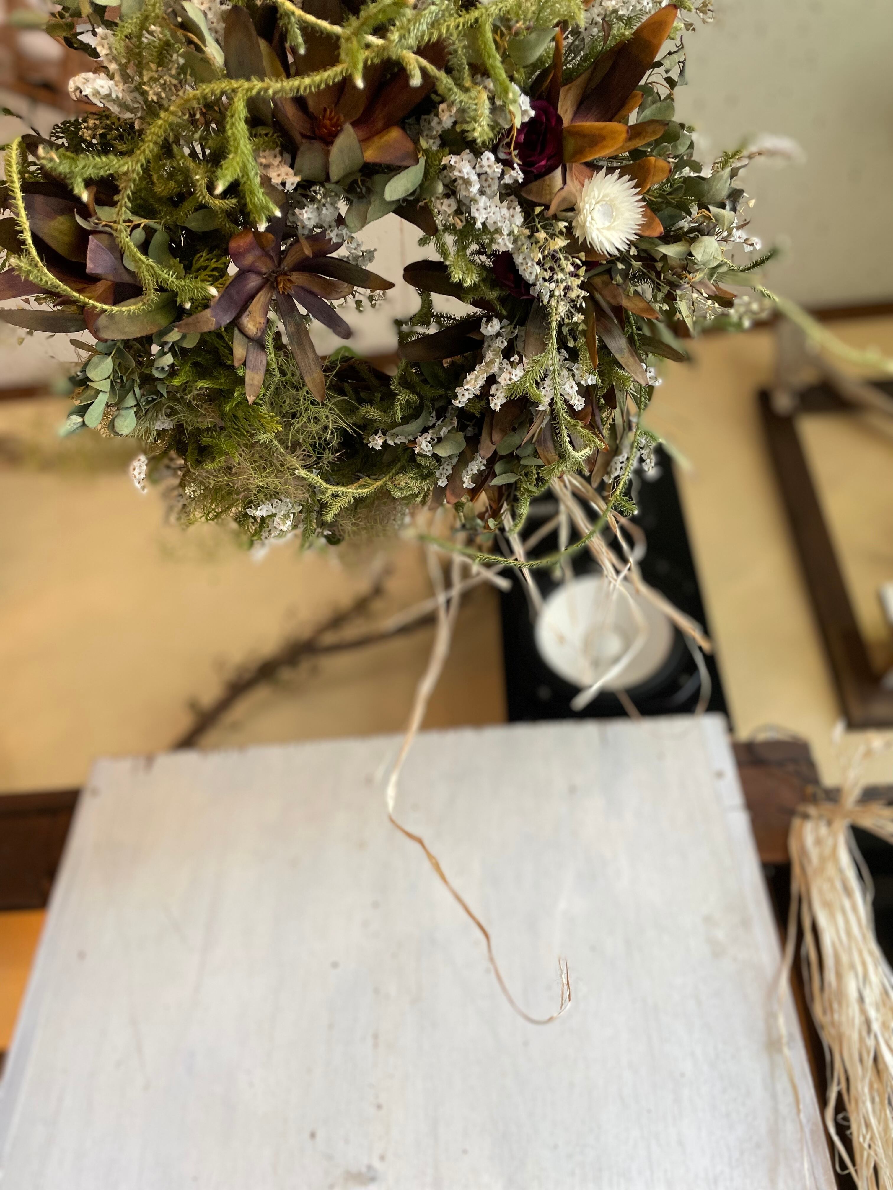 〜リューカデンドロンとスモークツリーのフライングリース〜ドライフラワーリース