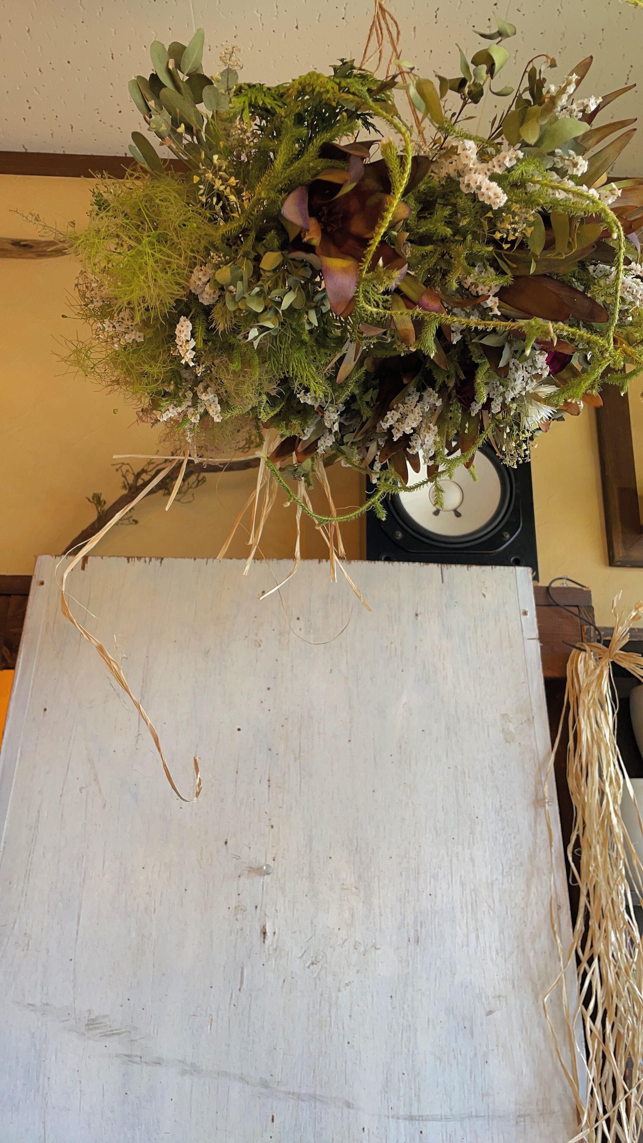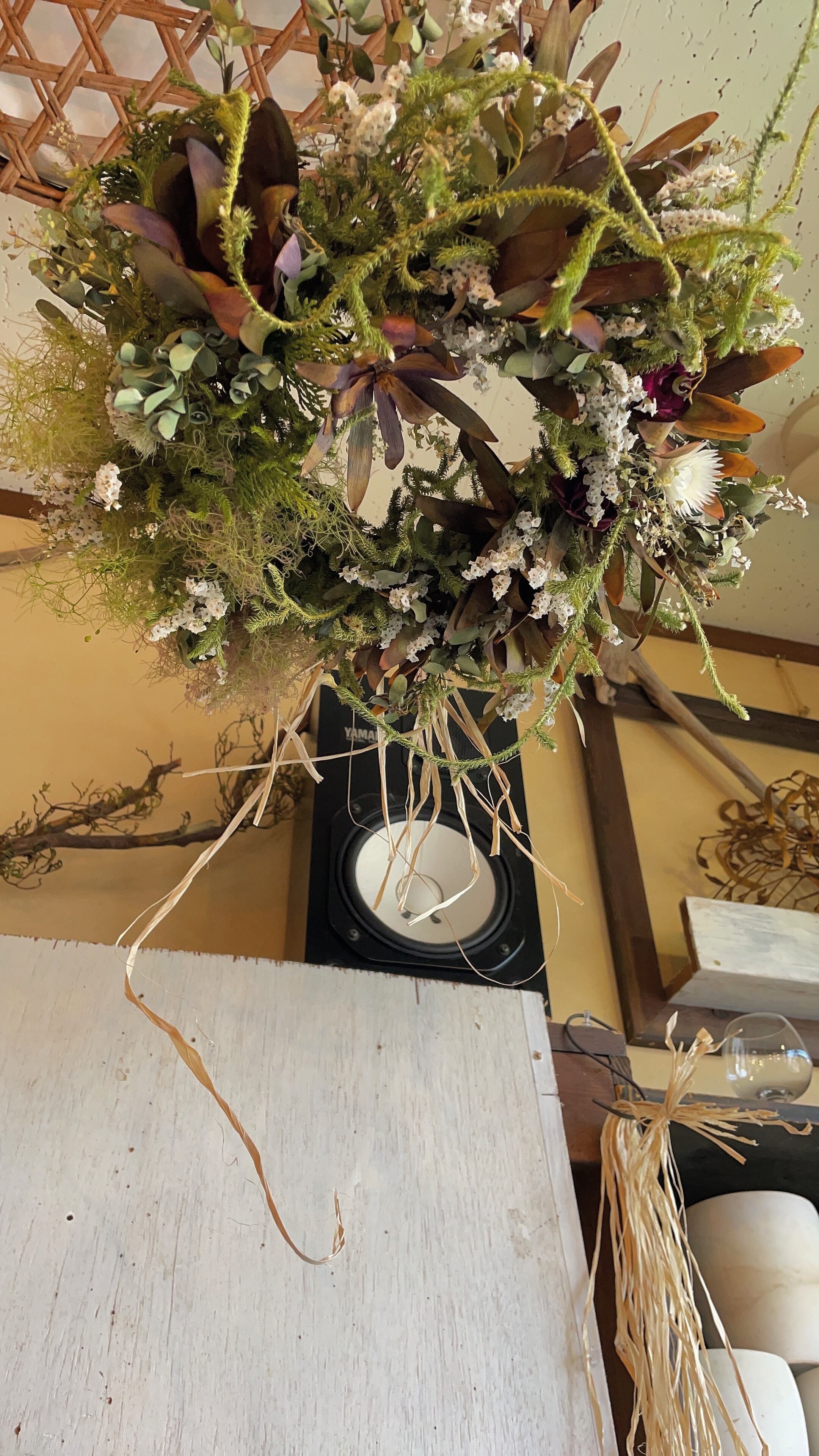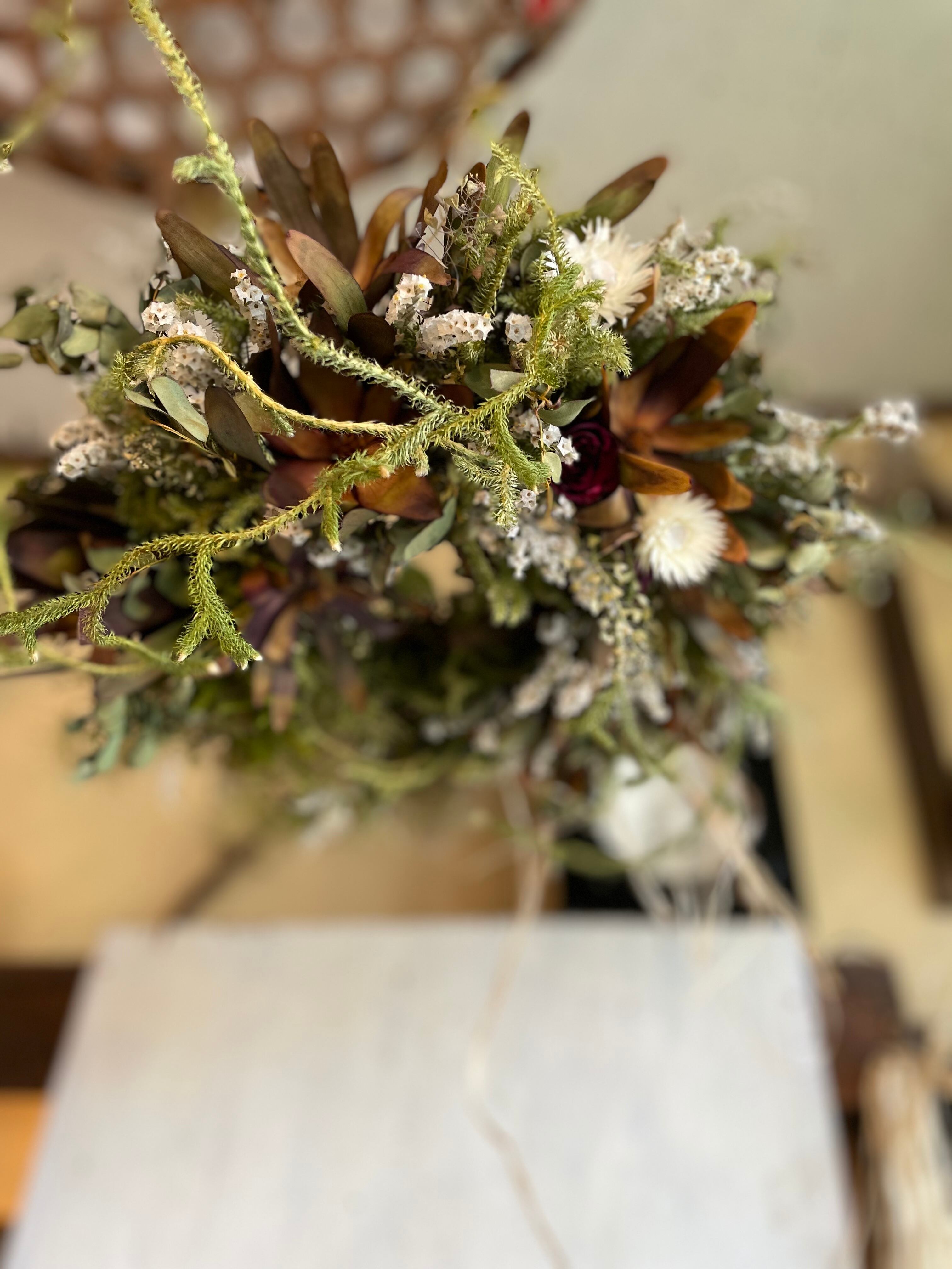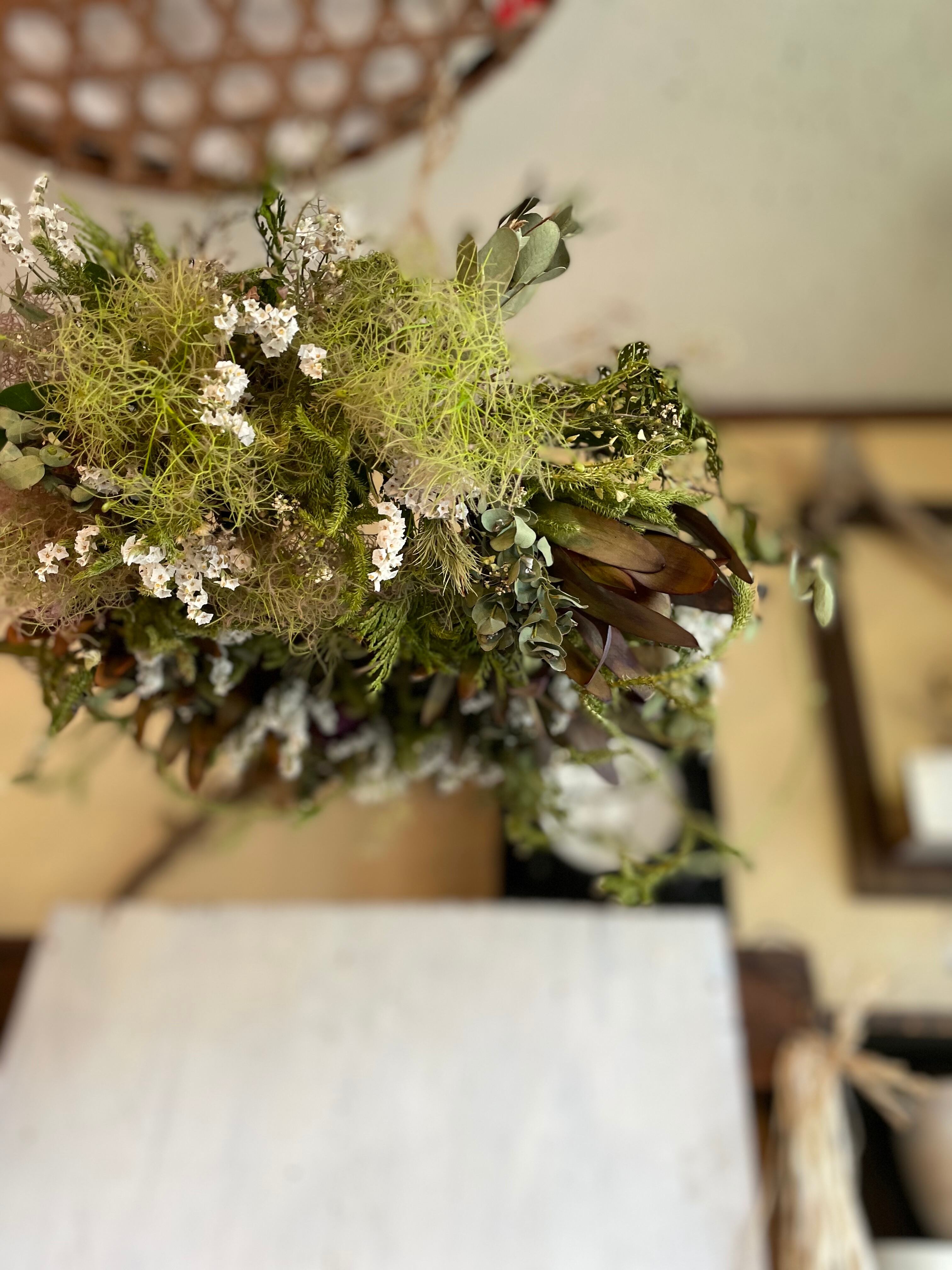 〜リューカデンドロンとスモークツリーのフライングリース〜ドライフラワーリース
