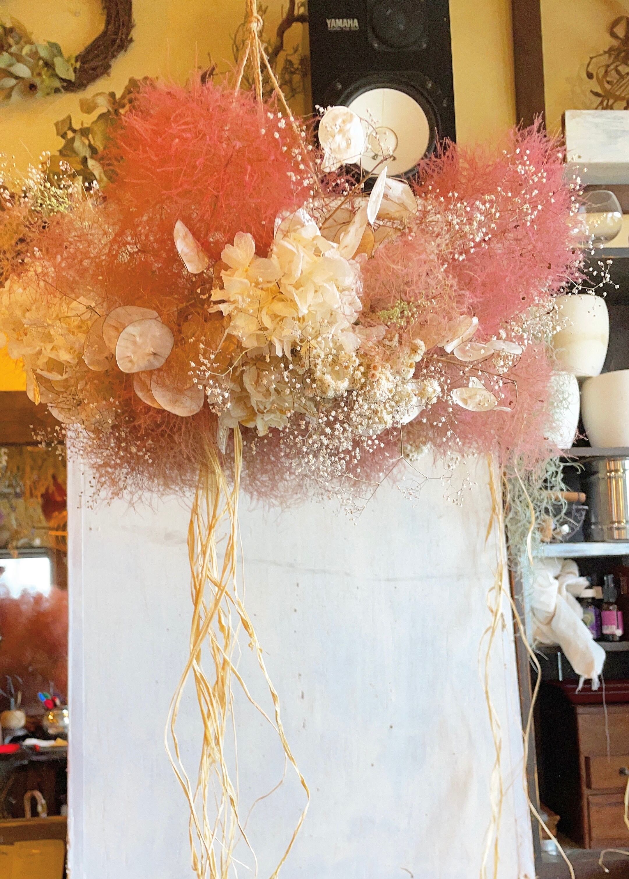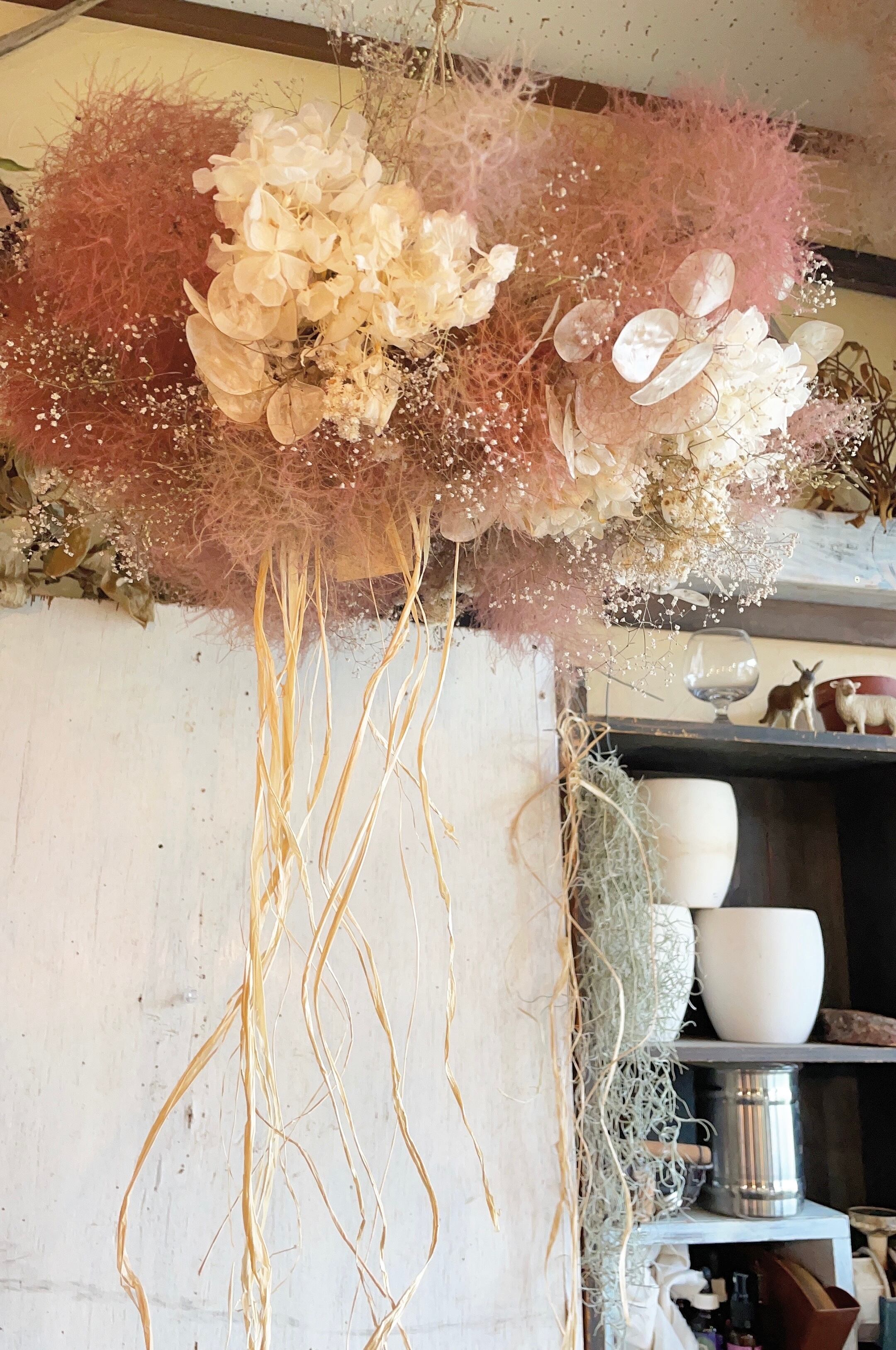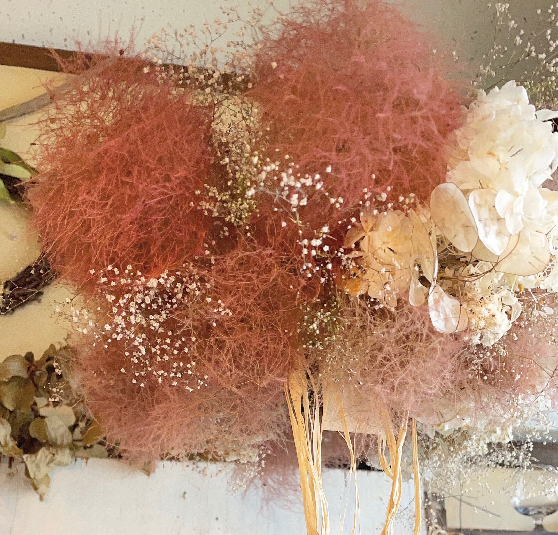 〜スモークツリーとルナリア、ホワイトあじさいの大きなフライングリース〜