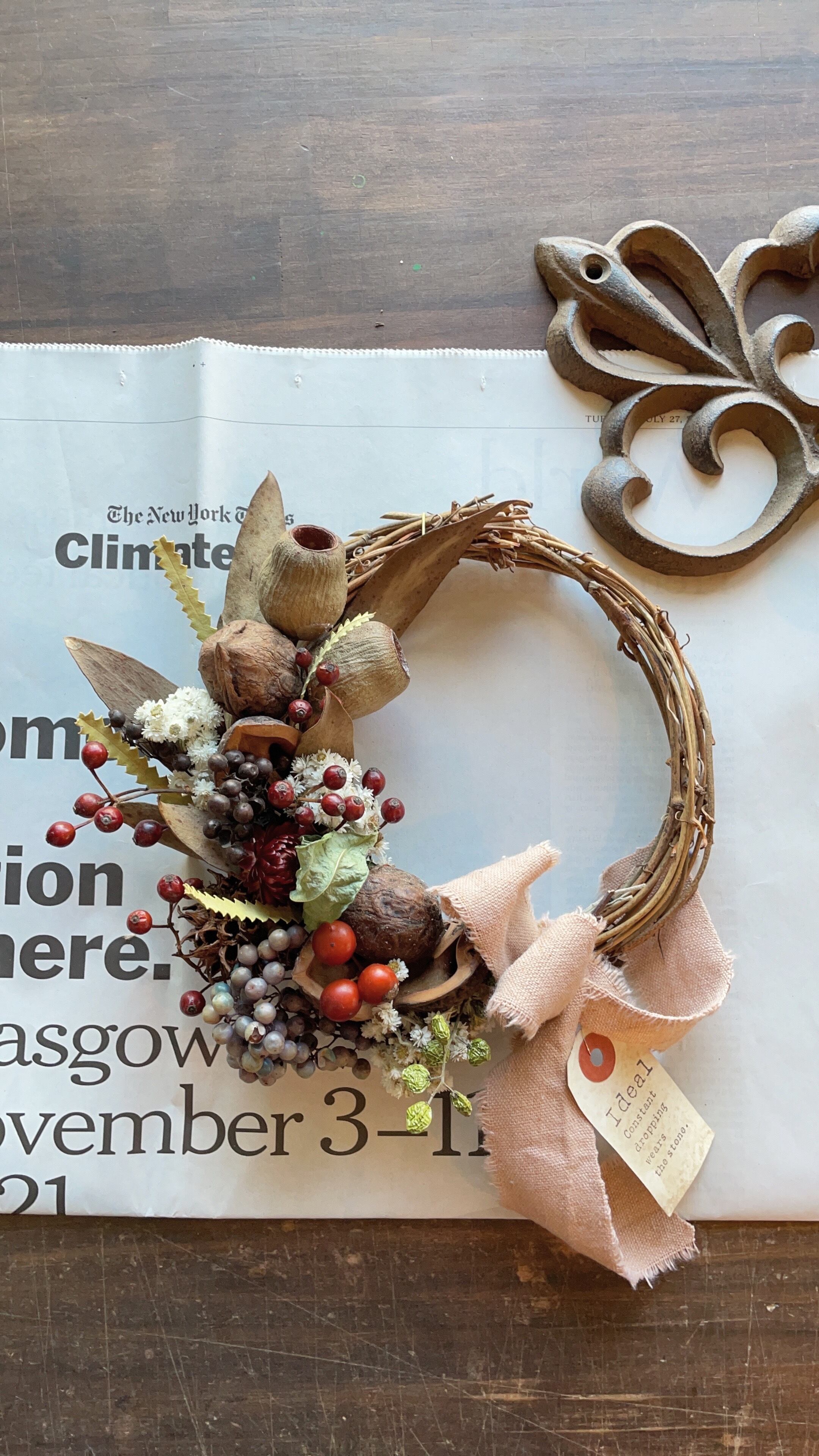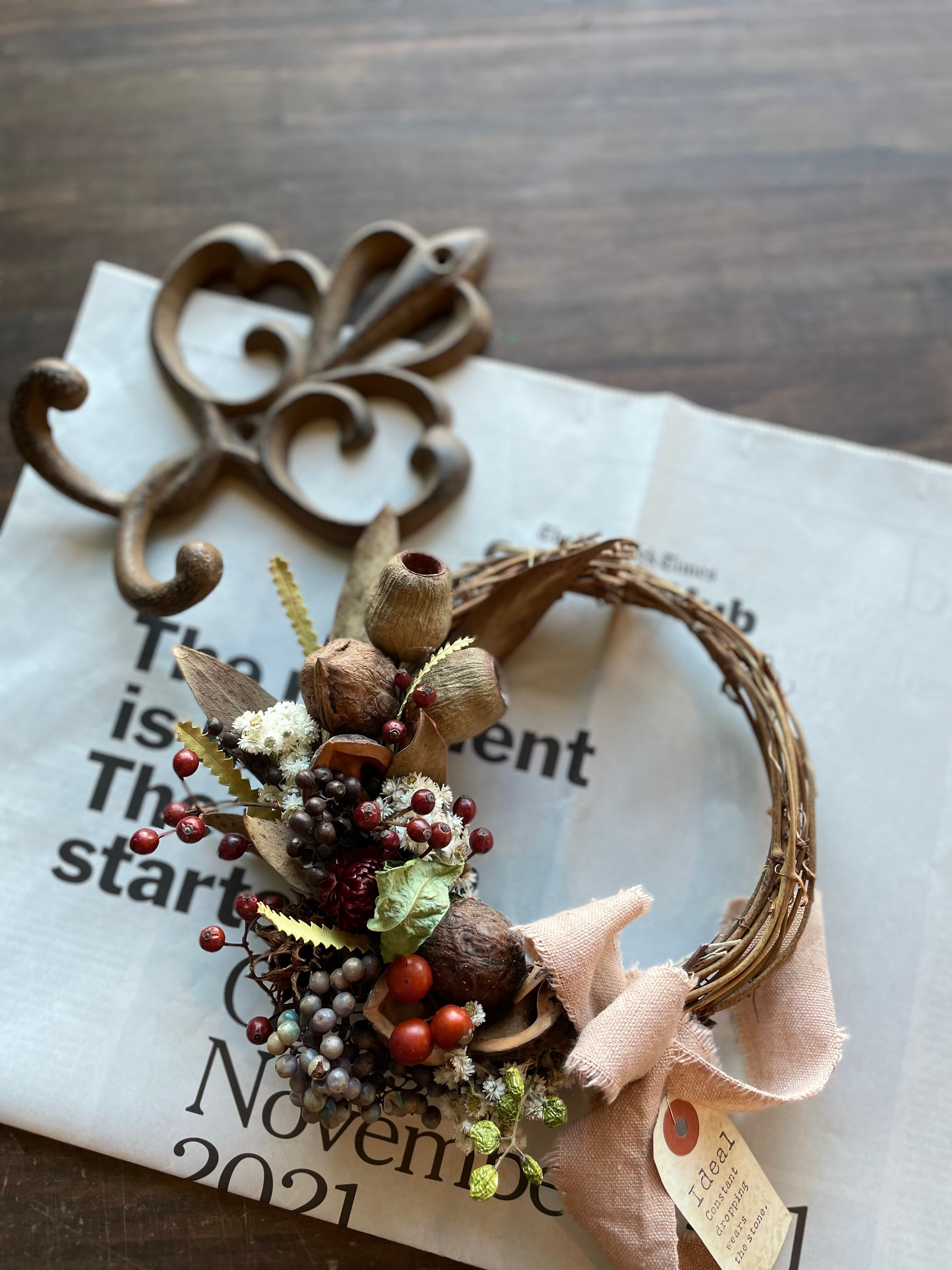 〜焼き菓子のようなナッツとベリーのごろっとしたハーフリース〜ドライフラワーリース