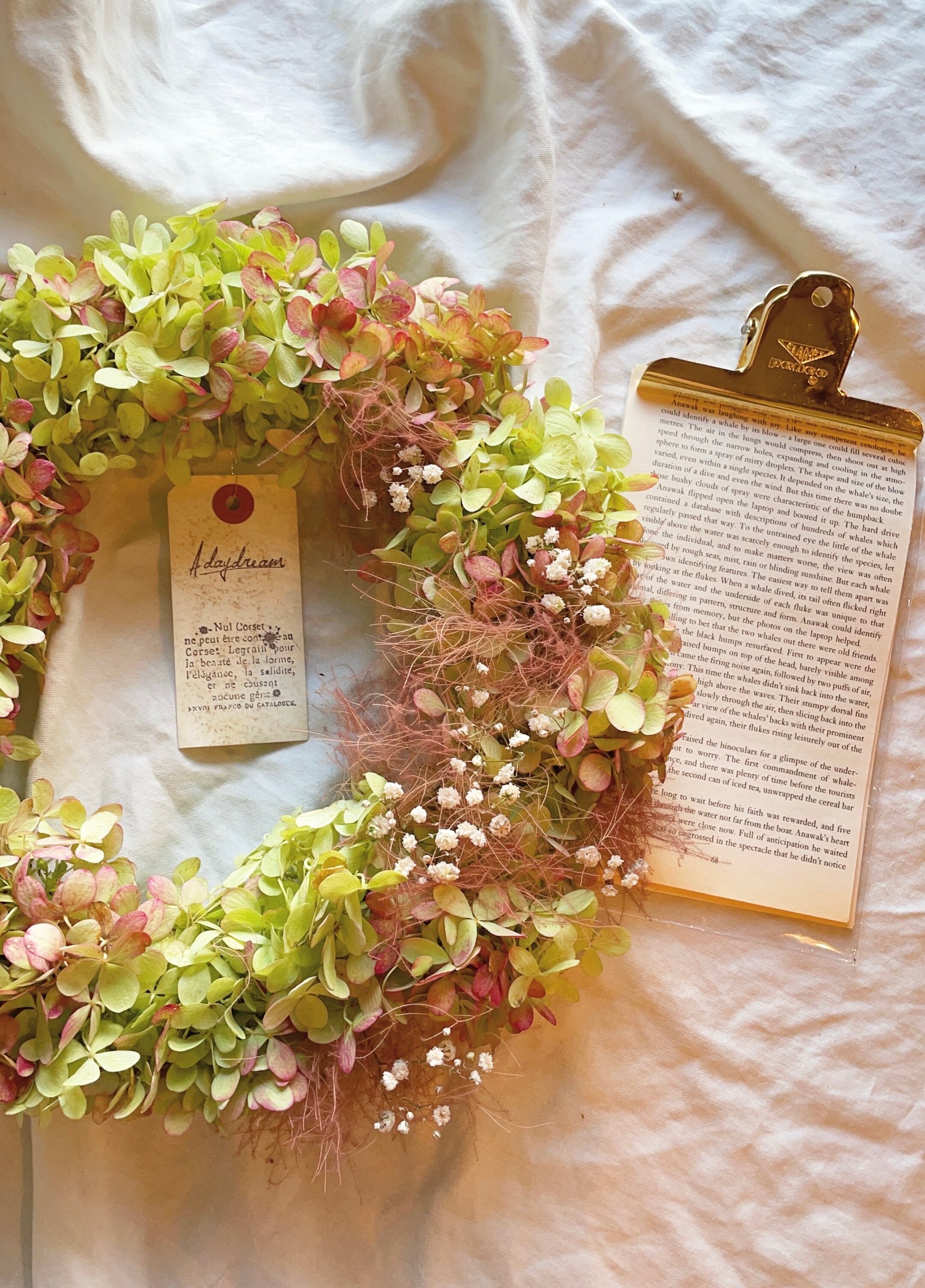 〜みなづきあじさいとスモークツリーのアンティークリース〜ドライフラワーリース