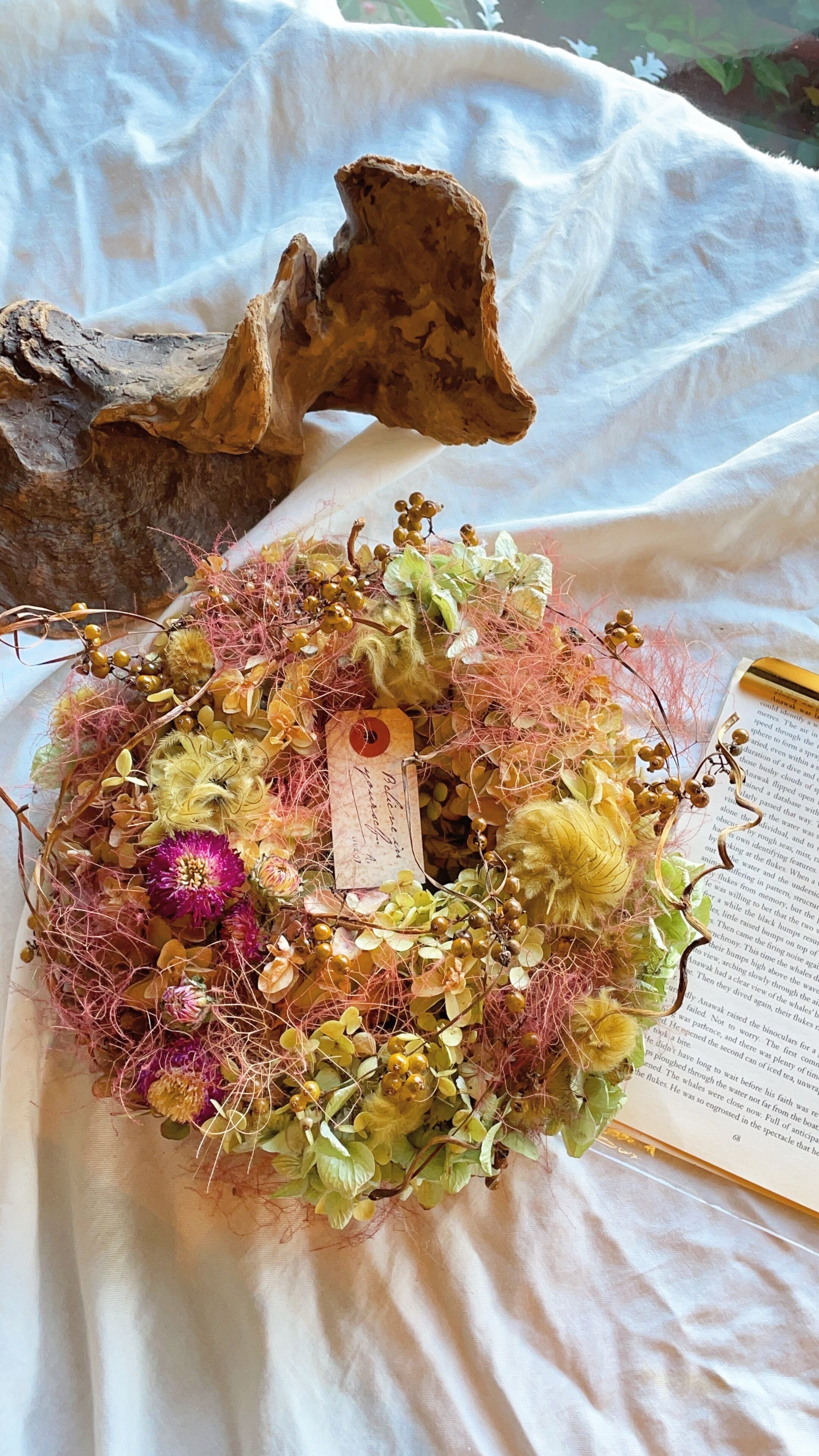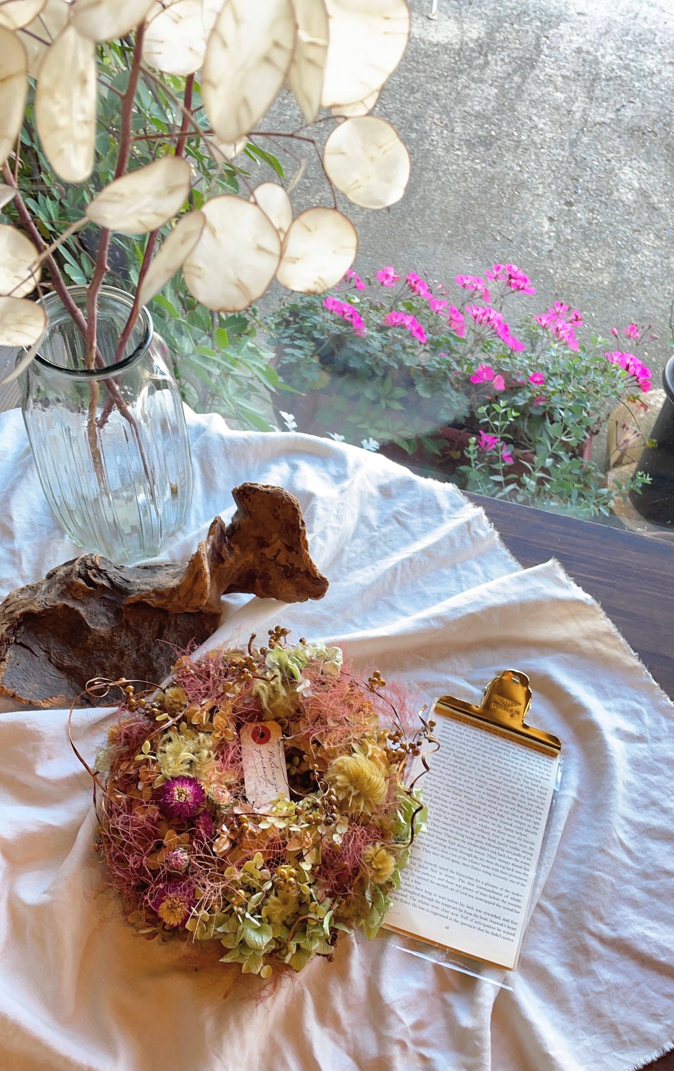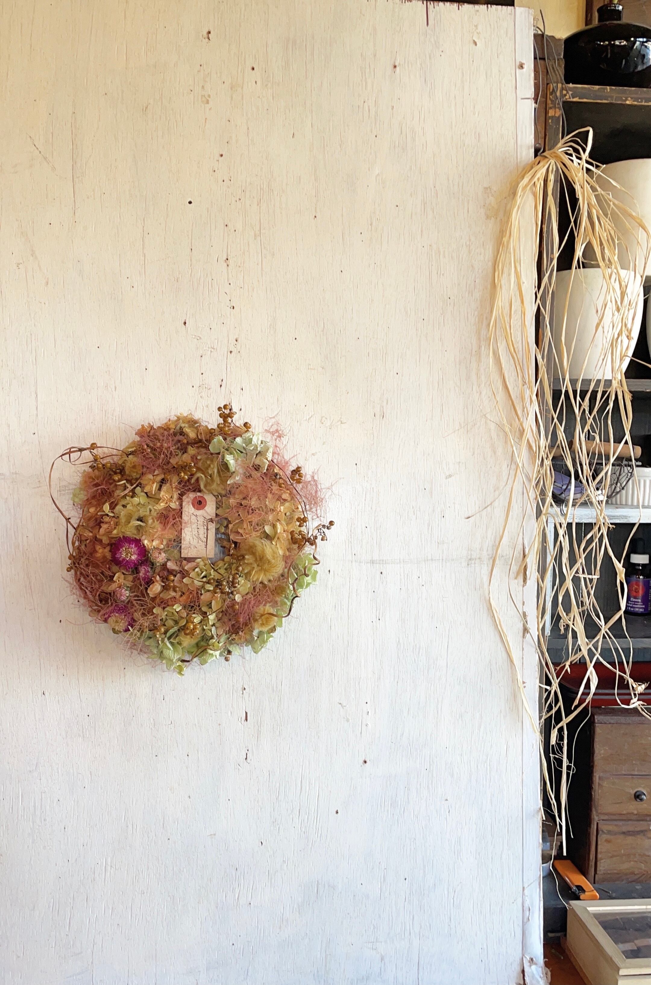 カシワバアジサイとスモークツリーのオータムリース○ドライフラワーリース