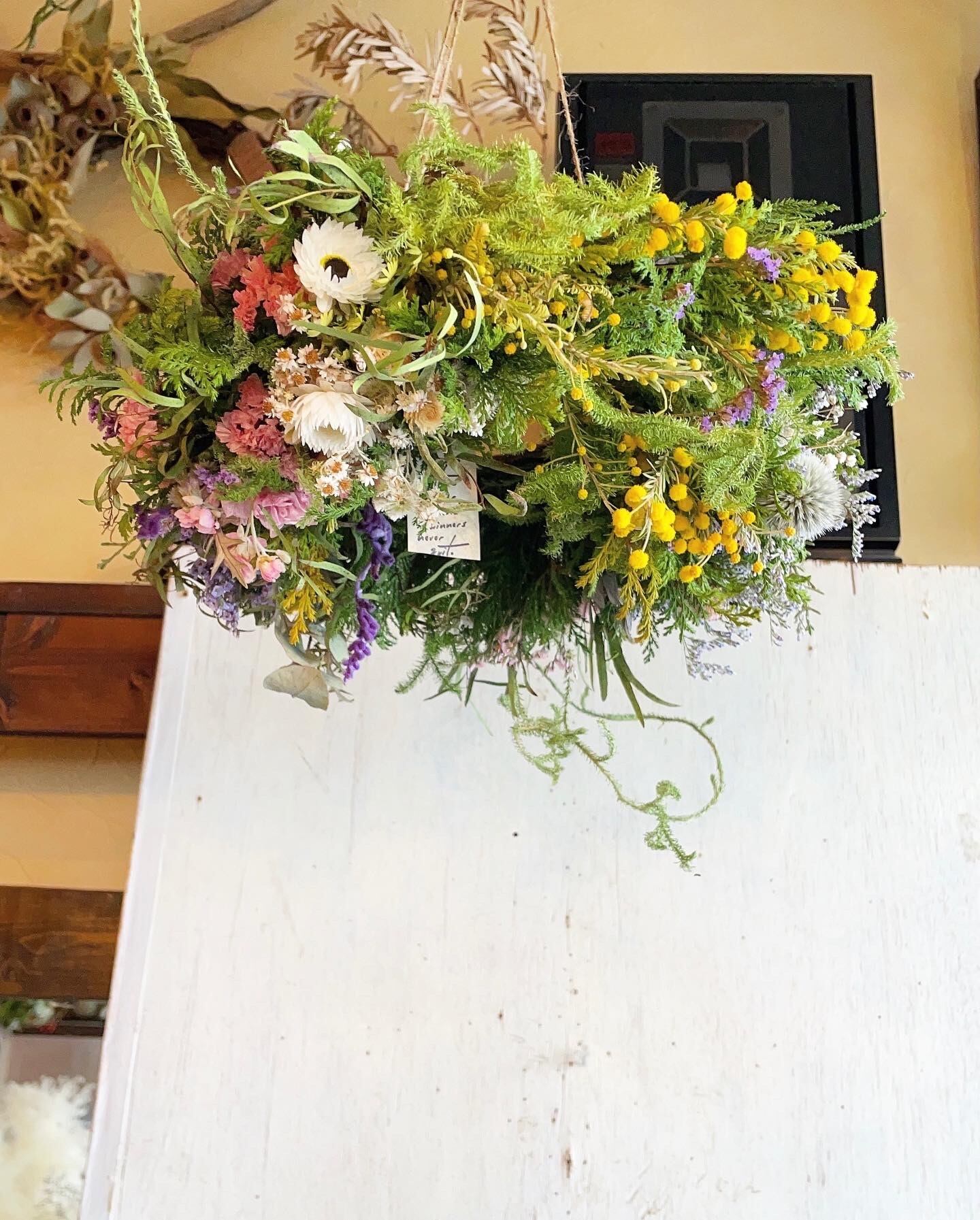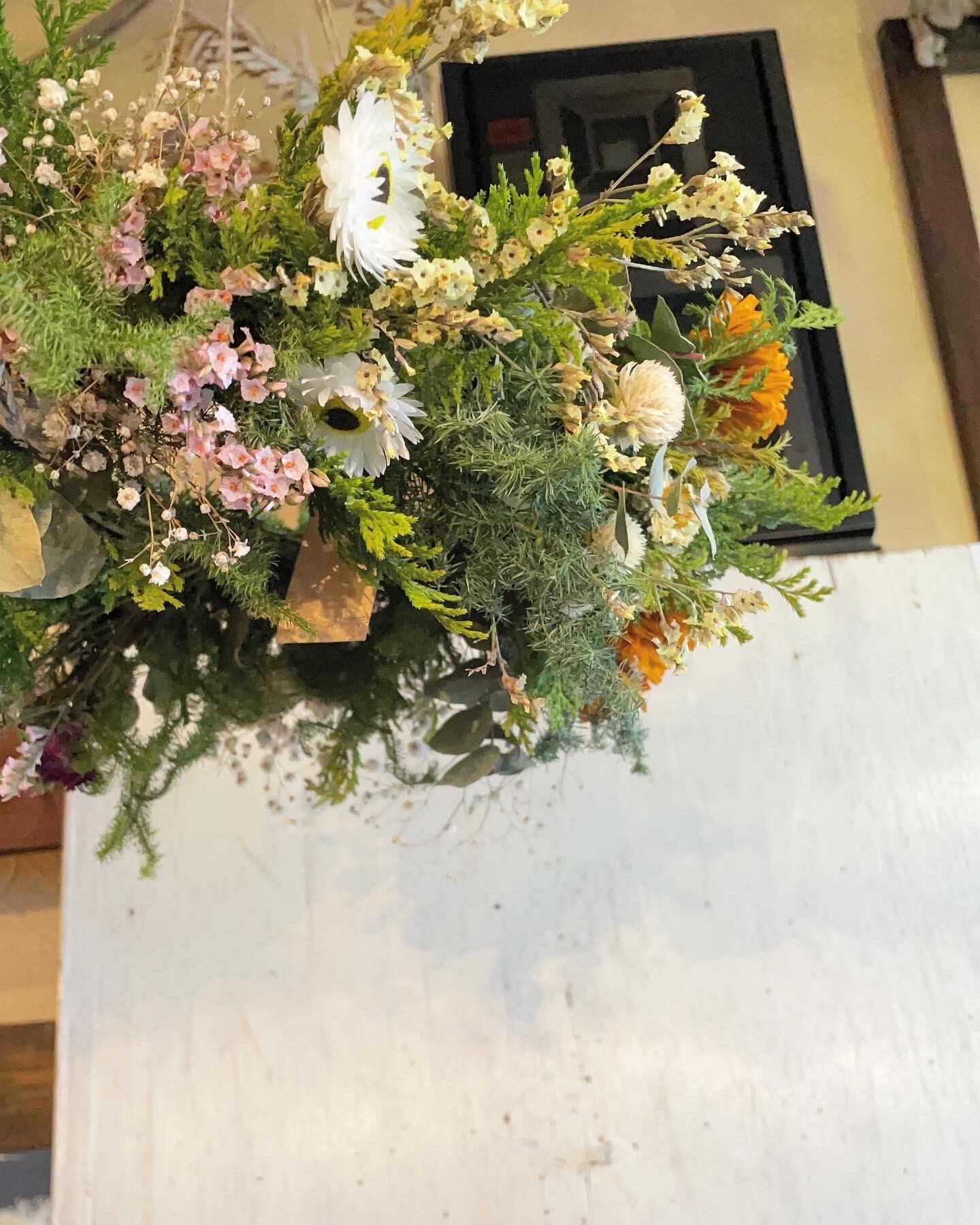 ※フライングリースの写真はなかなか難しくどこまで伝わるかわかりませんがたっぷりと花材を使用しており、大変ボリュームのある作品です。