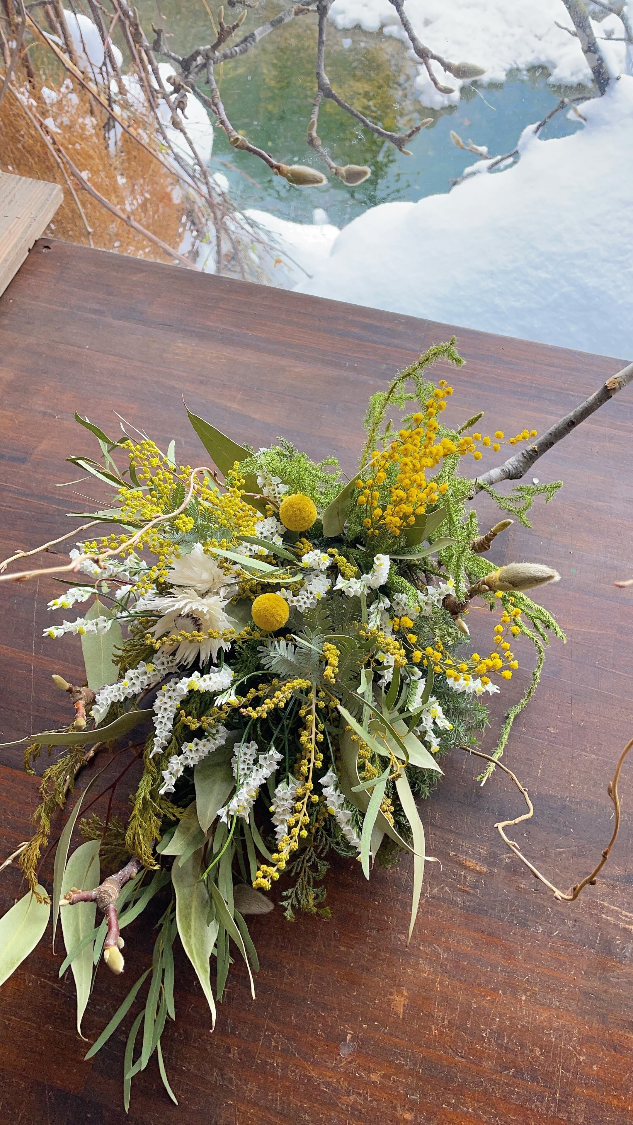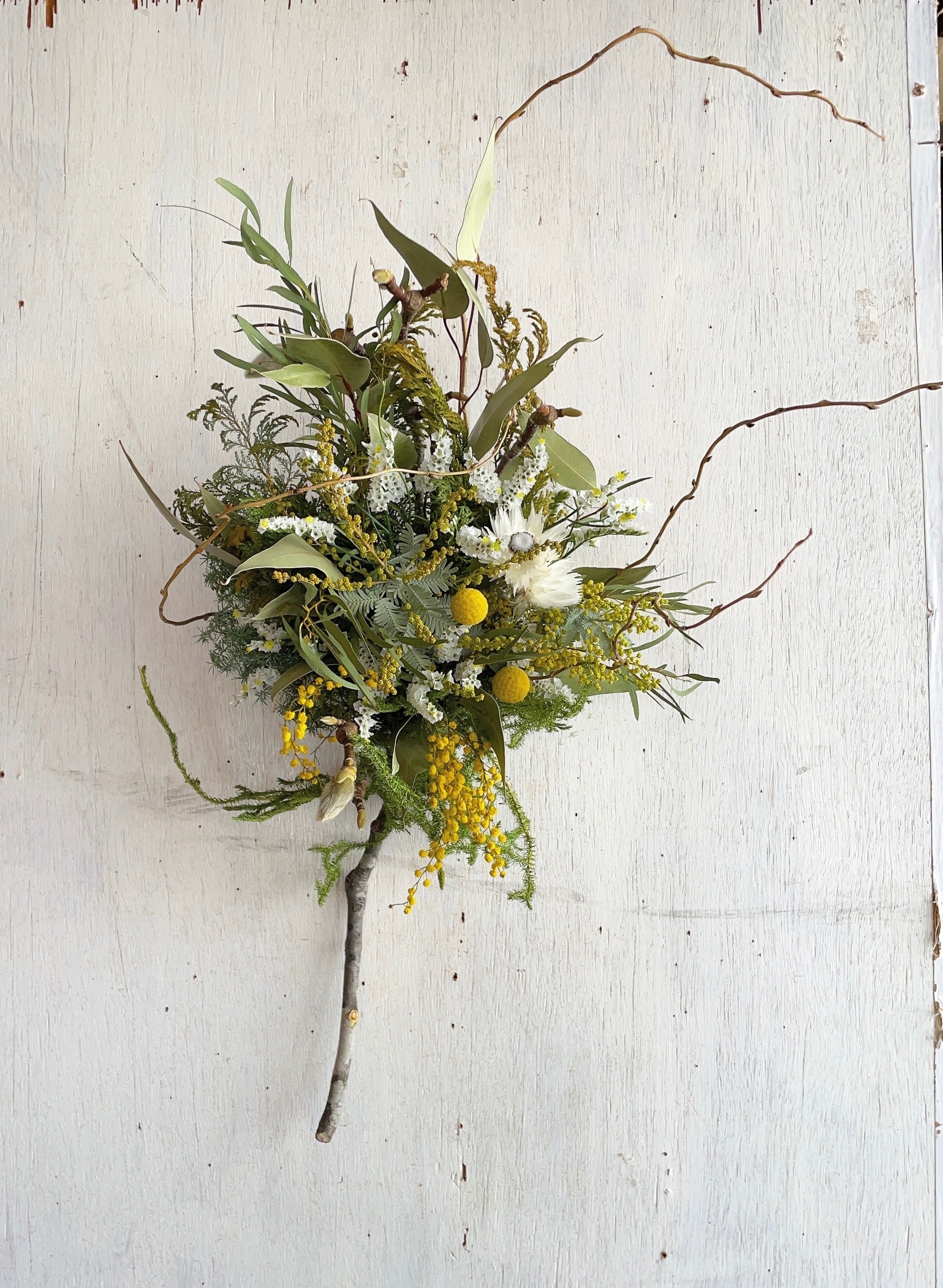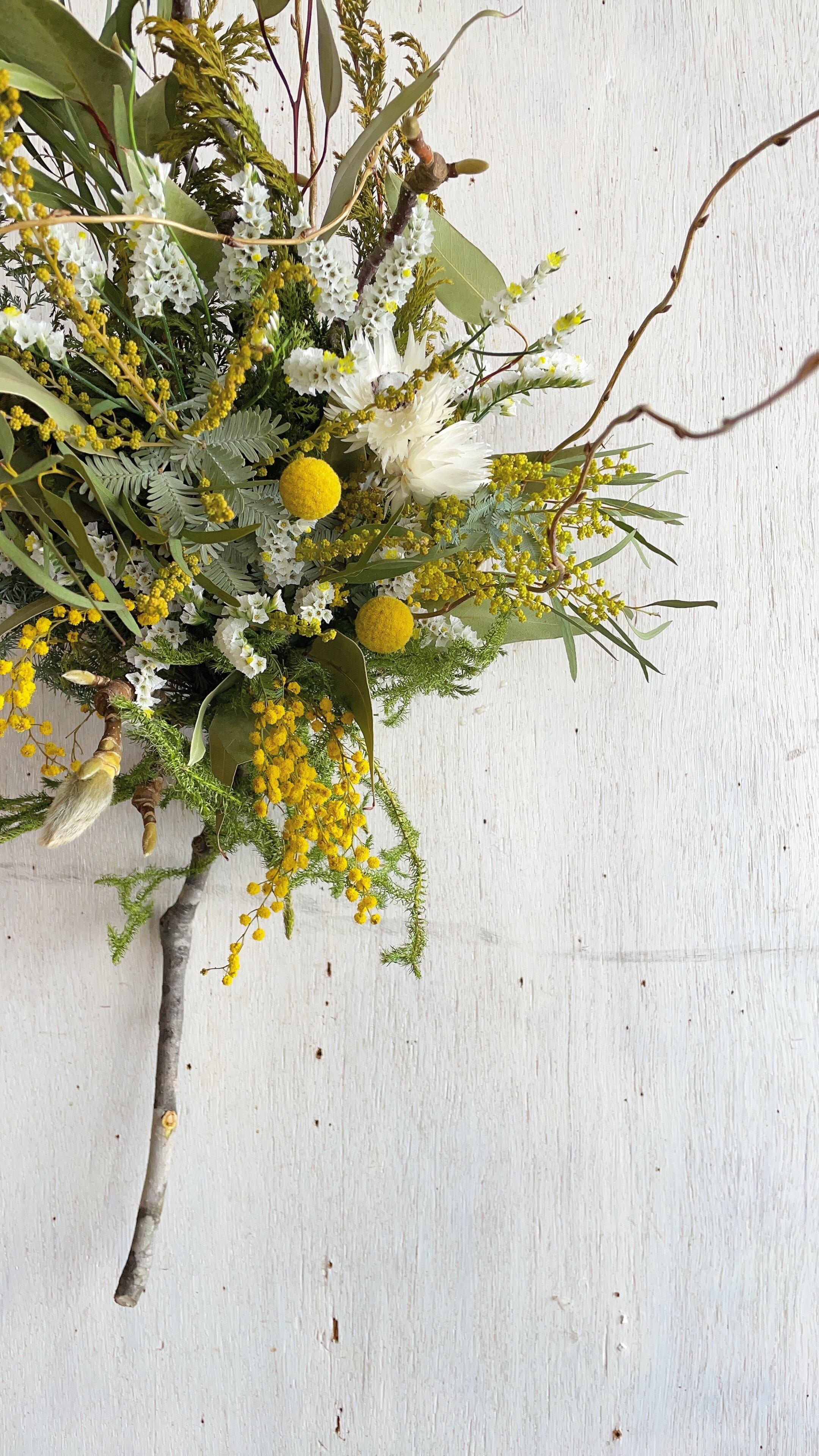 〜春を呼ぶミモザとこぶしの枝のスワッグ〜ドライフラワースワッグ