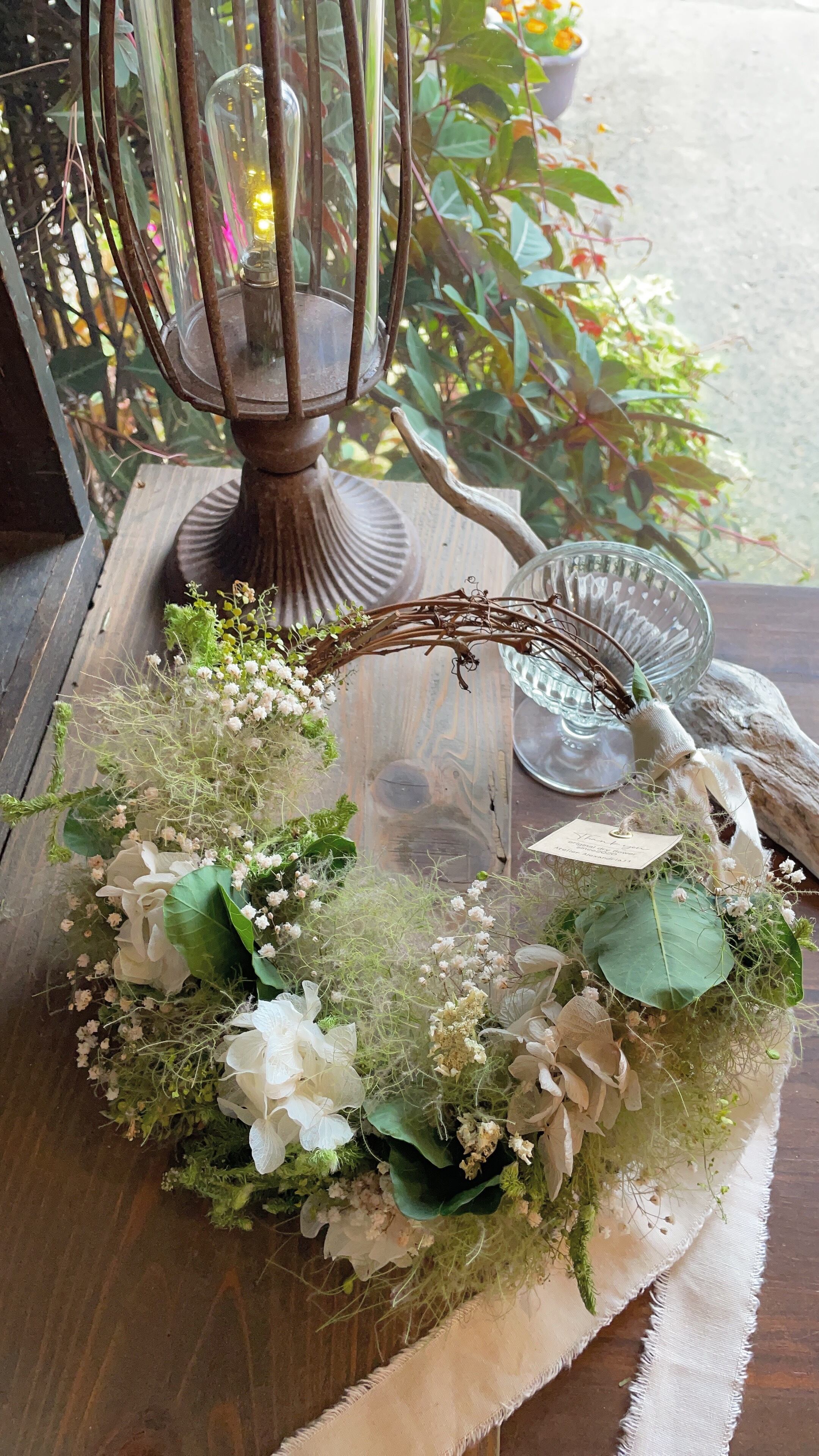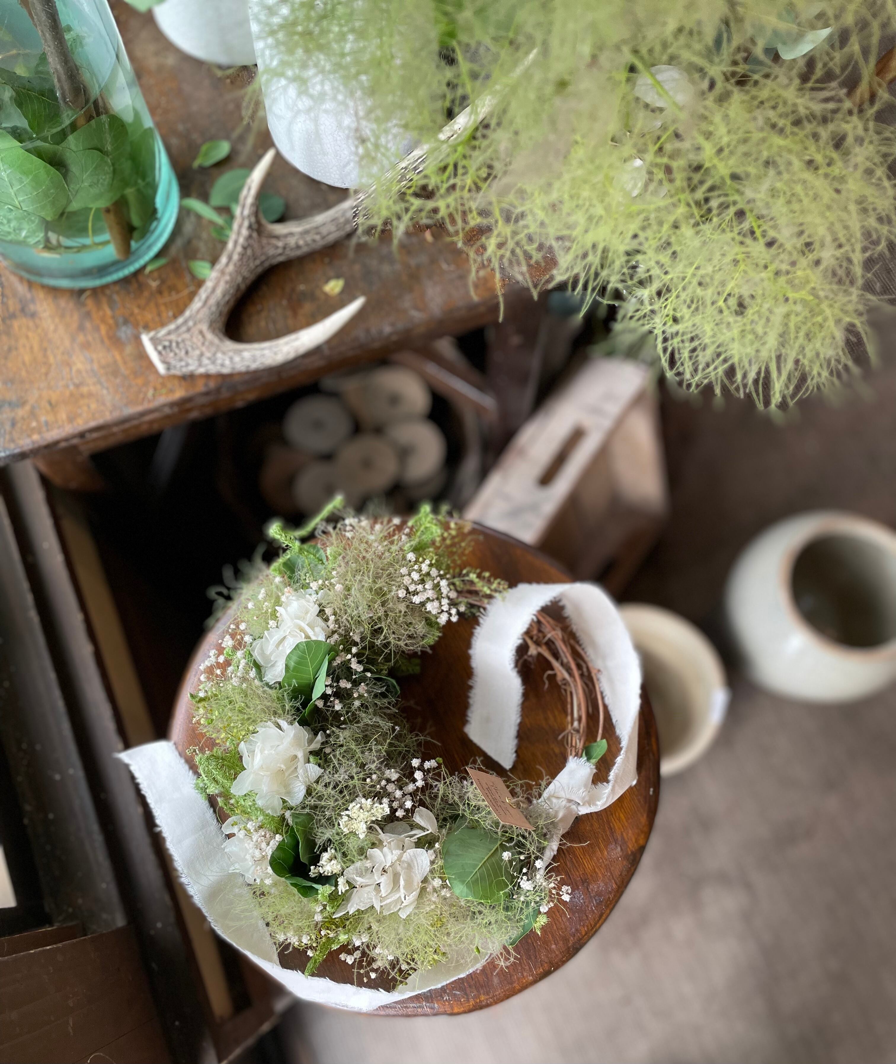 *スモークツリーとホワイトあじさいのハーフリース○ドライフラワーリース