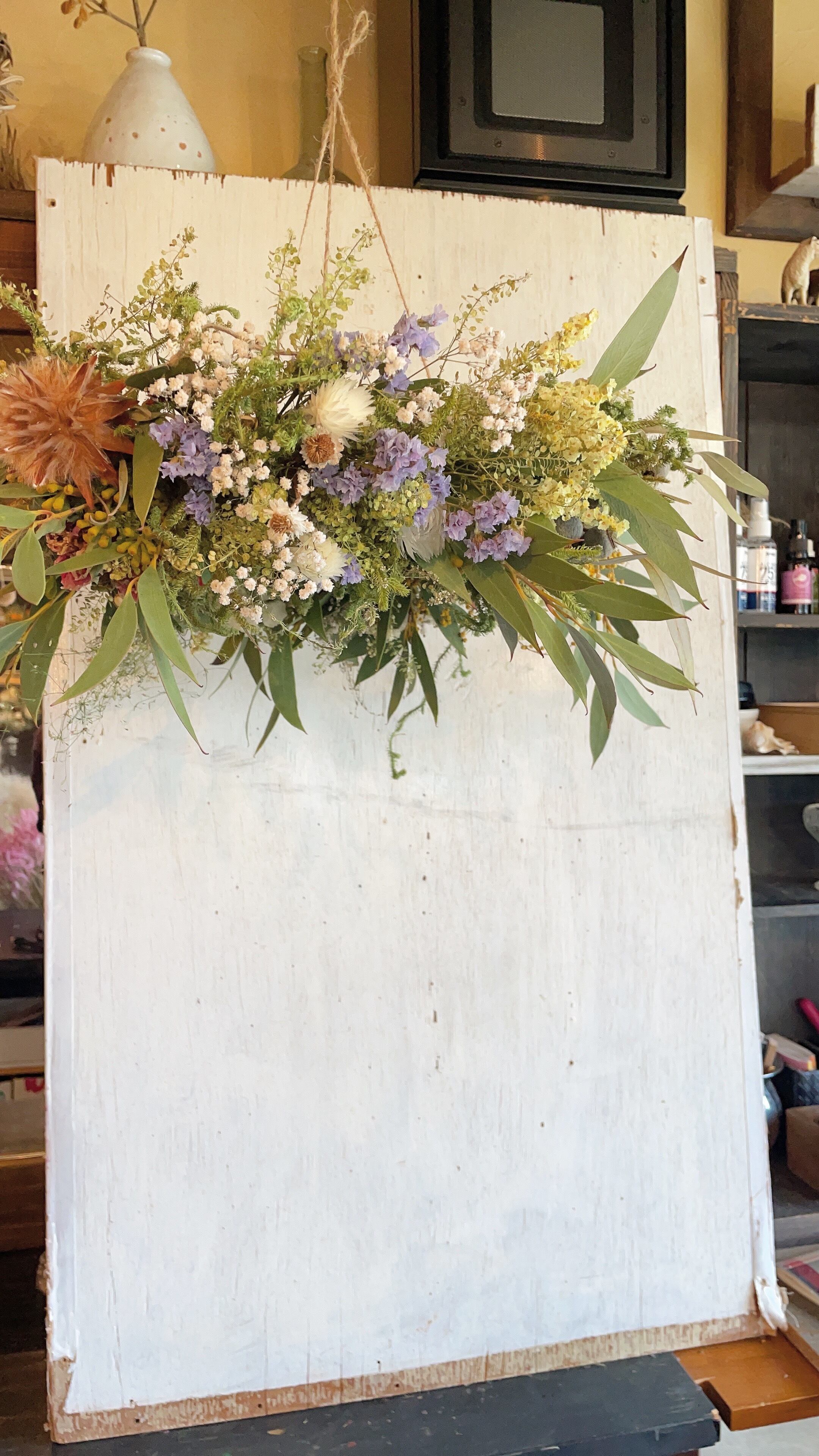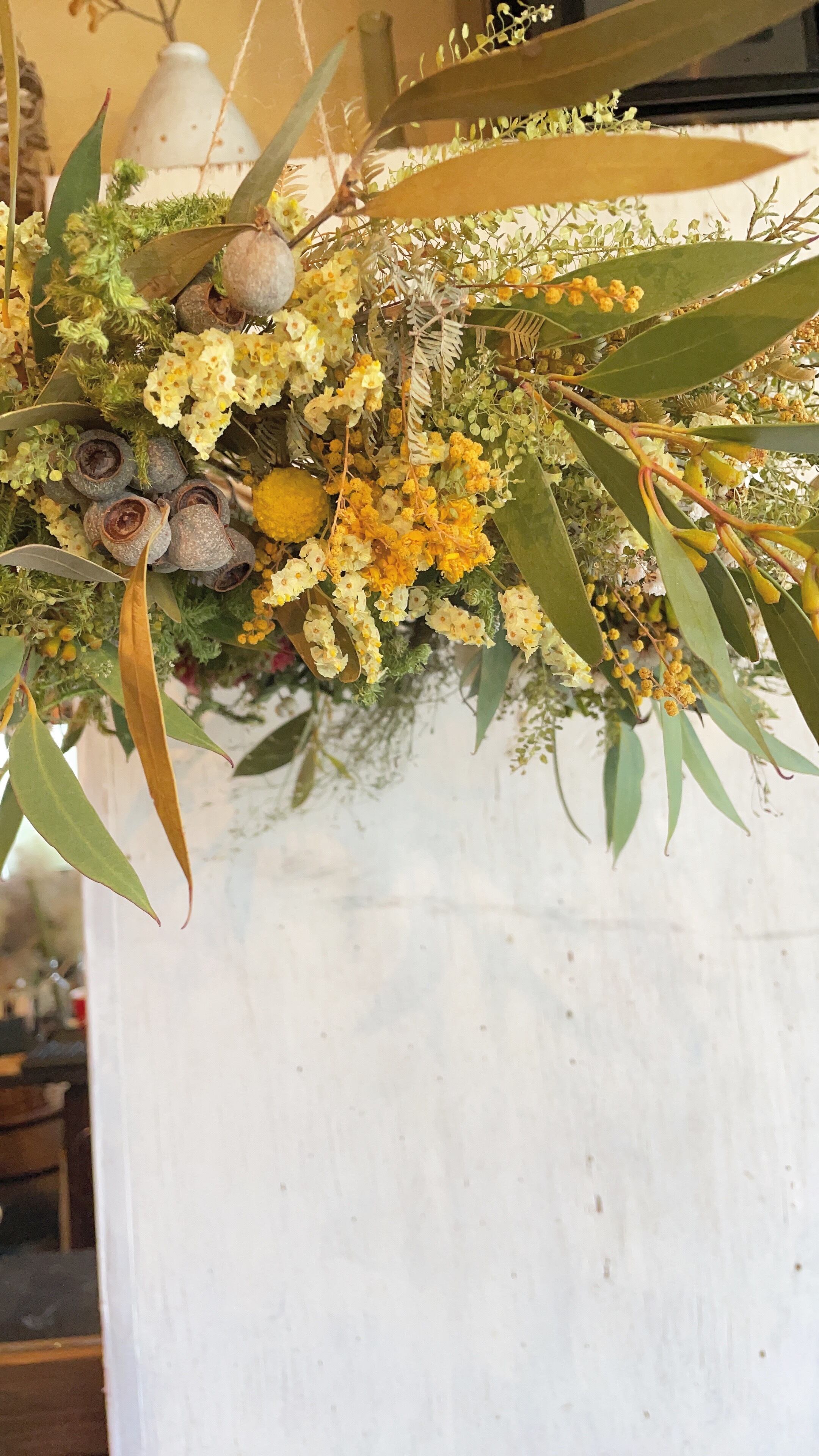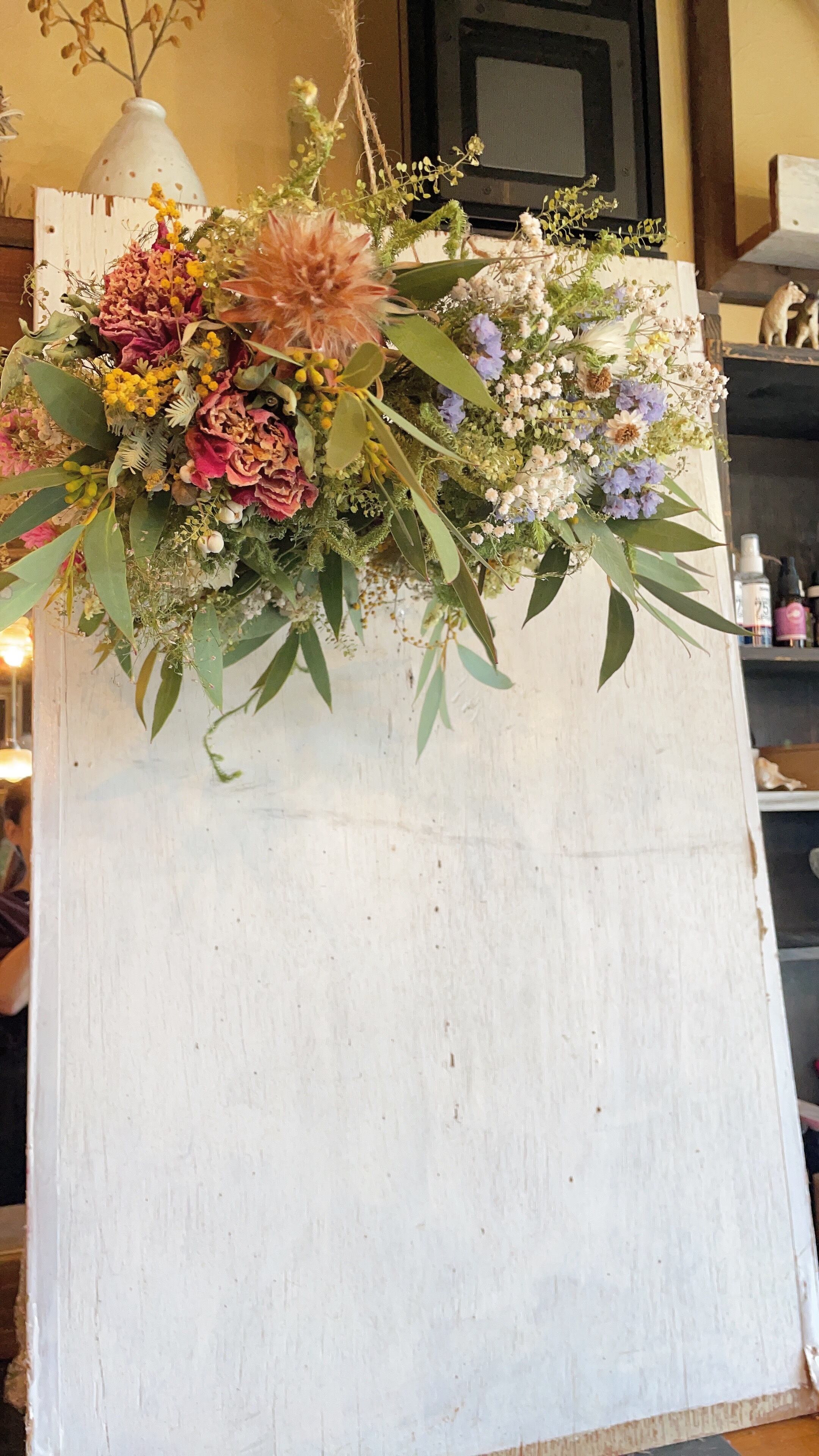 ユーカリベリーとローダンセ、芍薬ミモザの大きなフライングリース