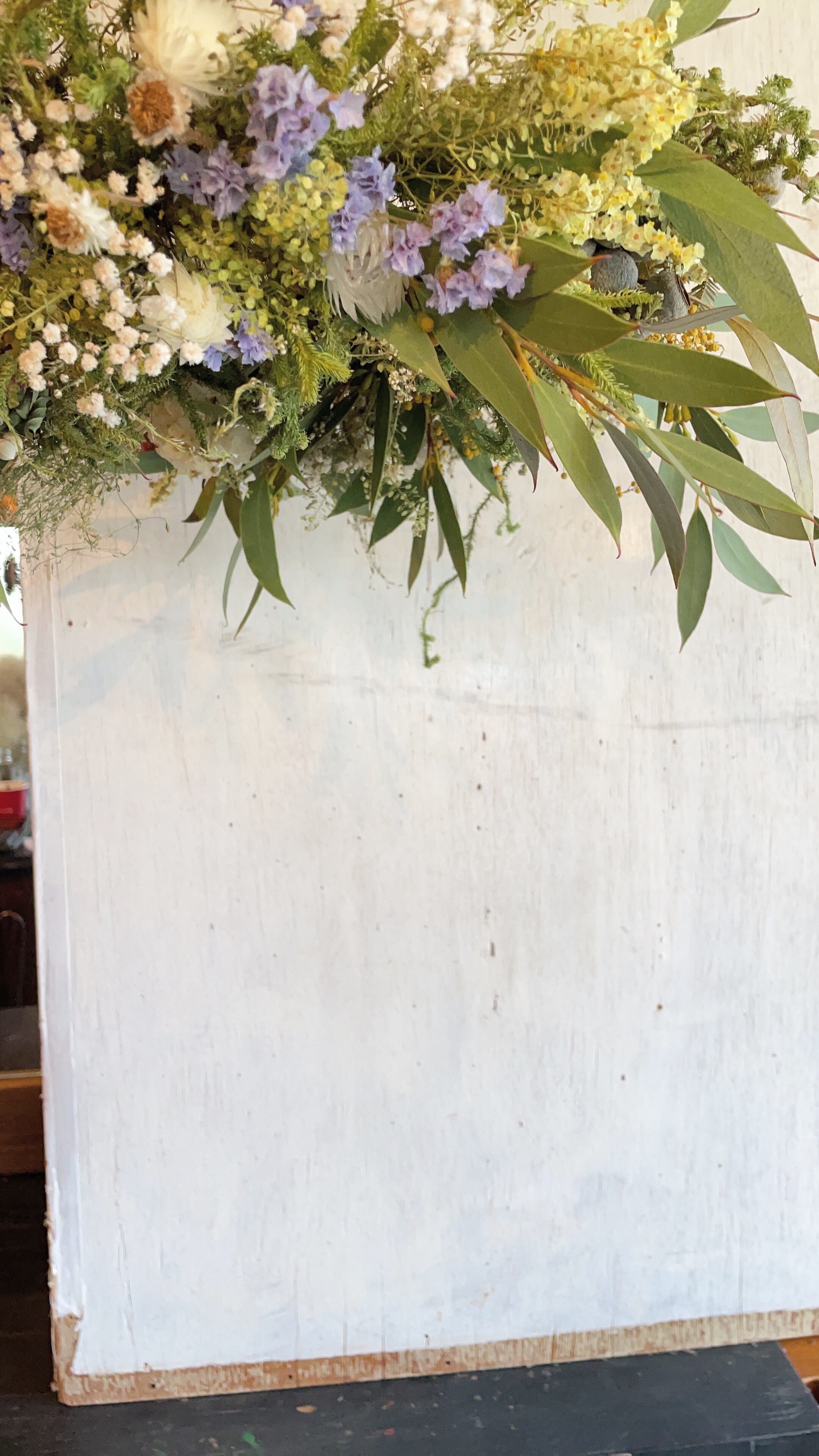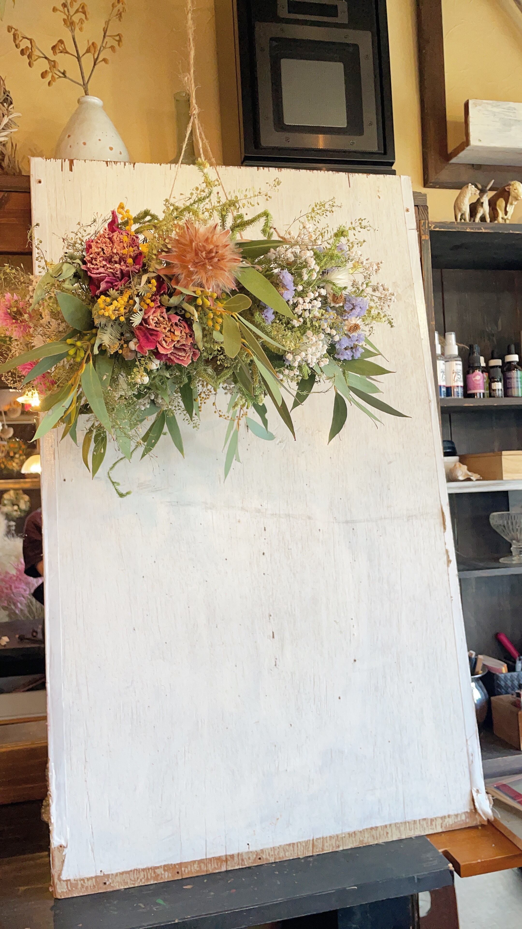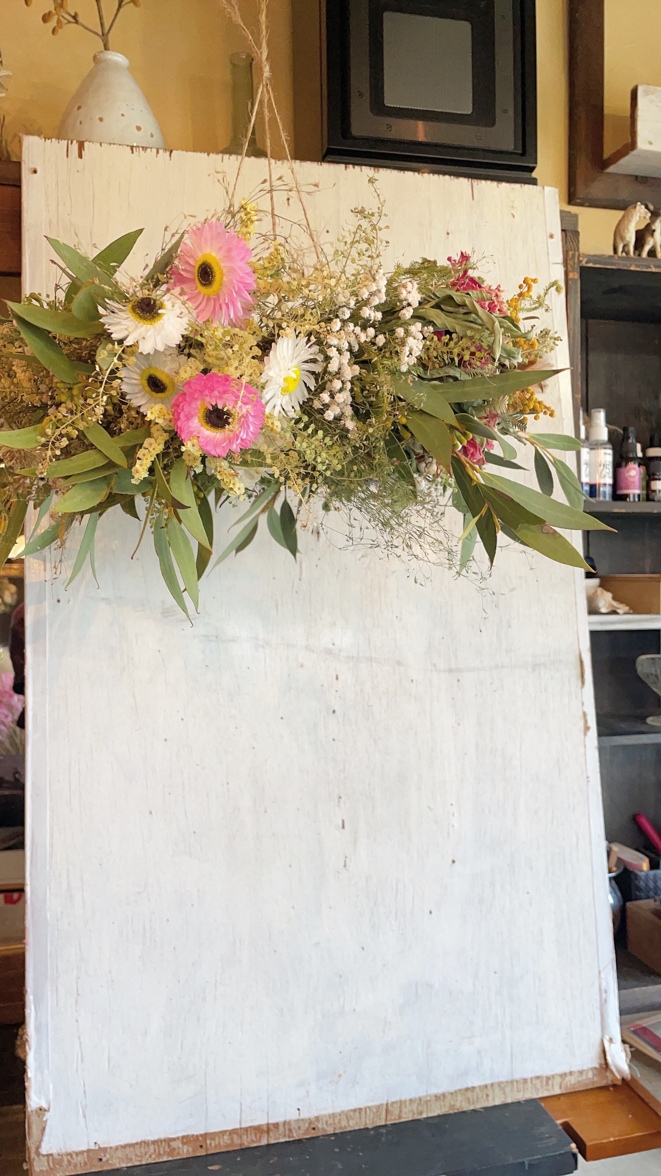 ユーカリベリーとローダンセ、芍薬ミモザの大きなフライングリース
