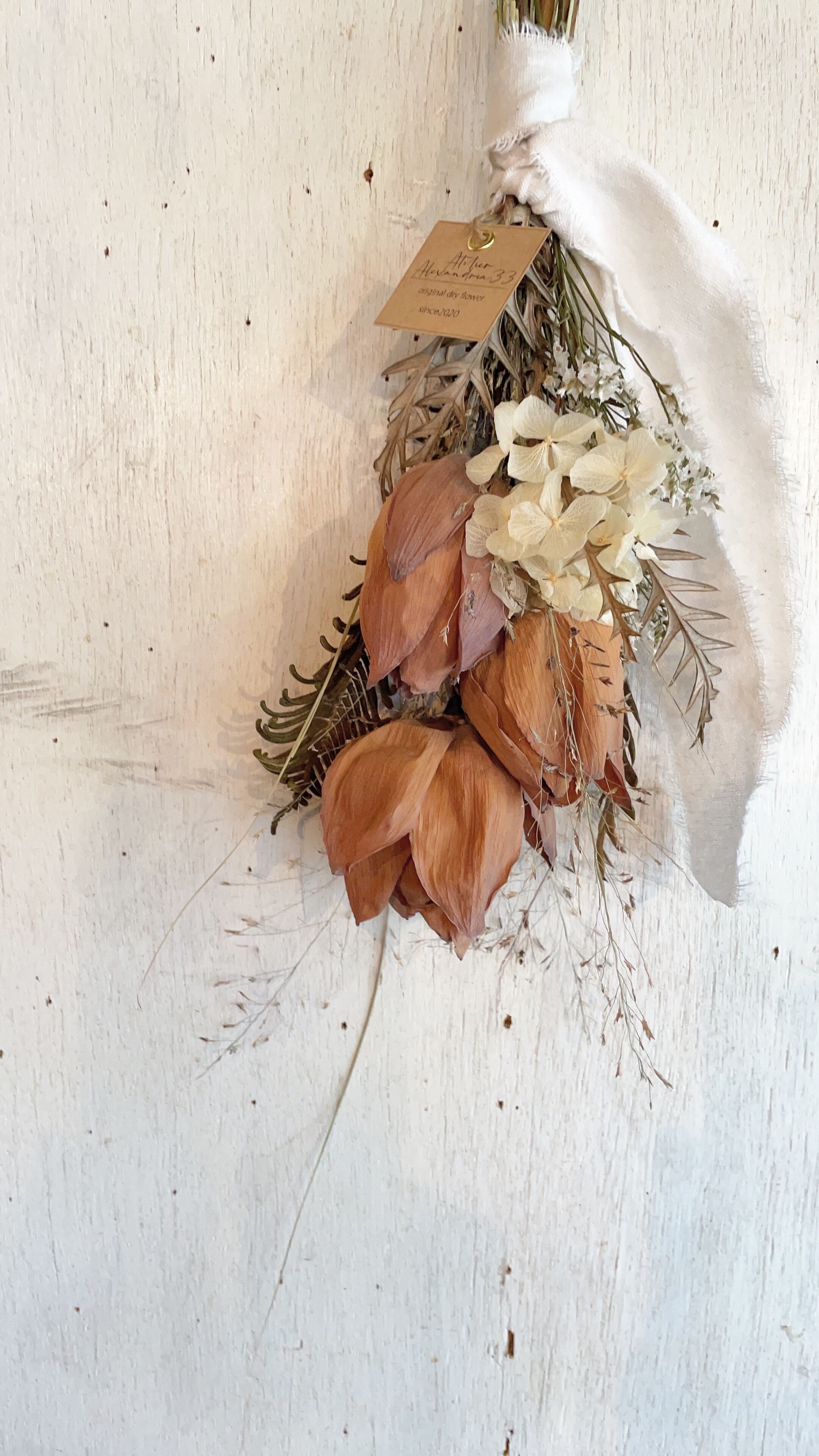珍しいハスの花のドライフラワーを束ねたスワッグ