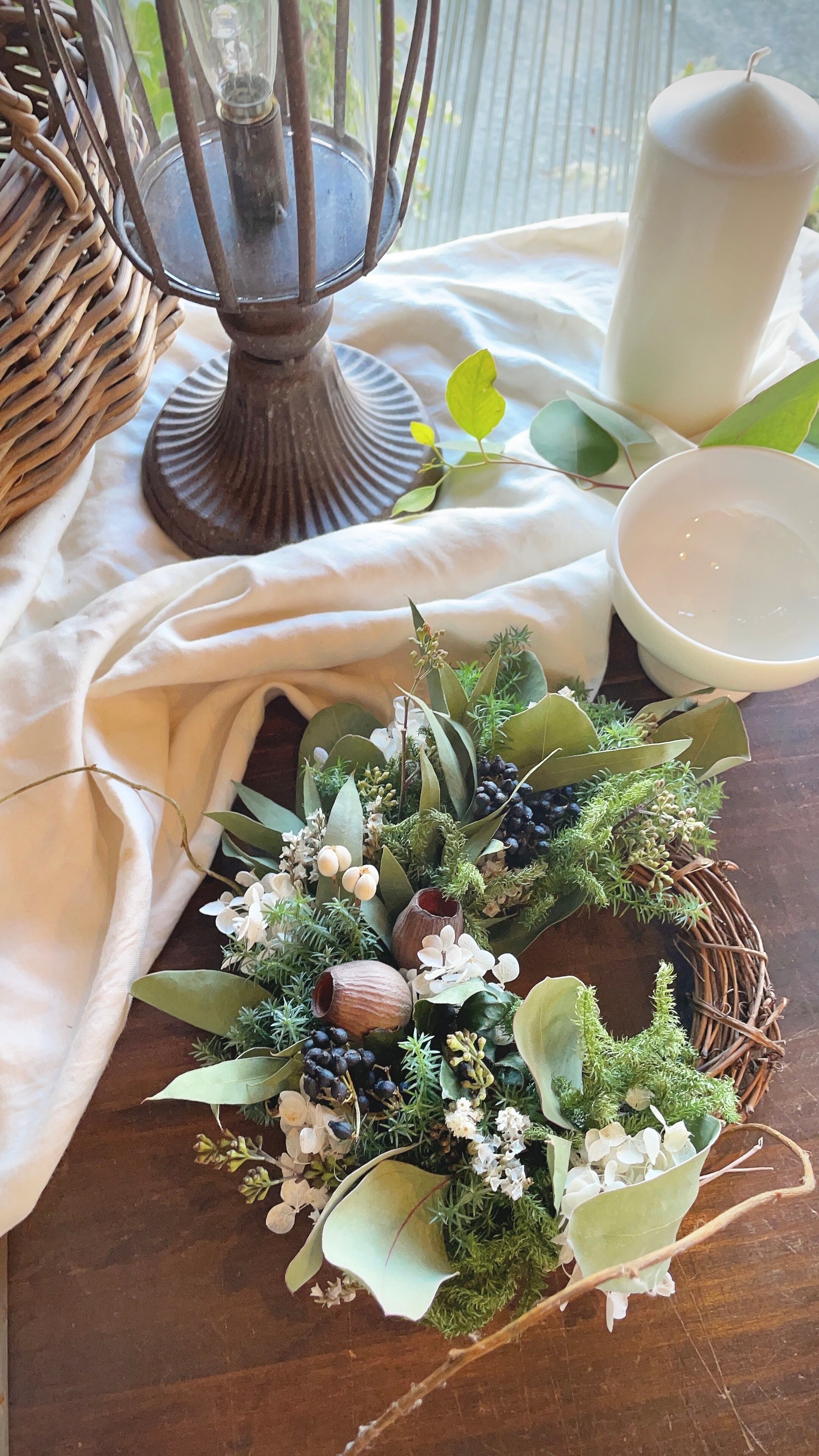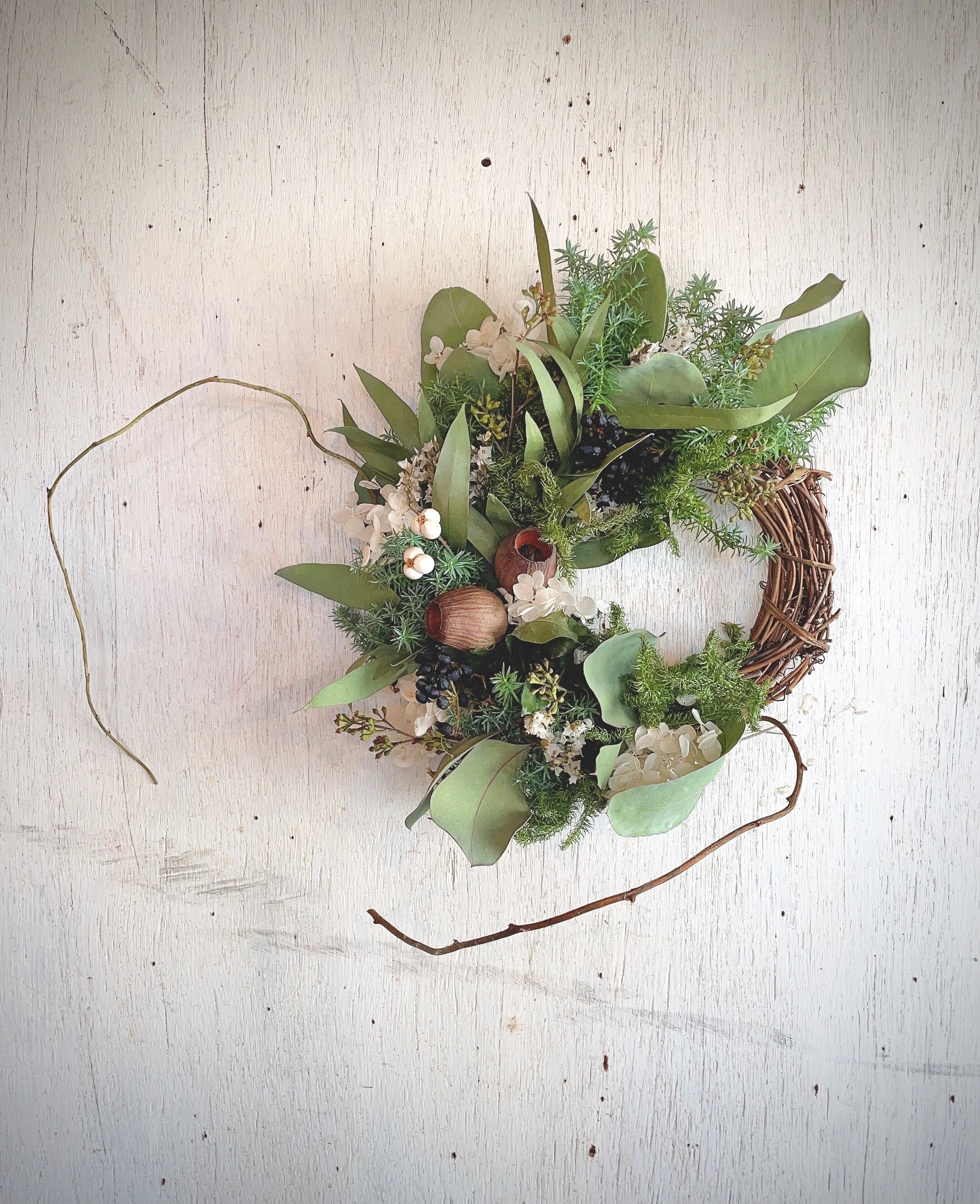 グリーンと木の実の動きあるハーフリース○ドライフラワーリース