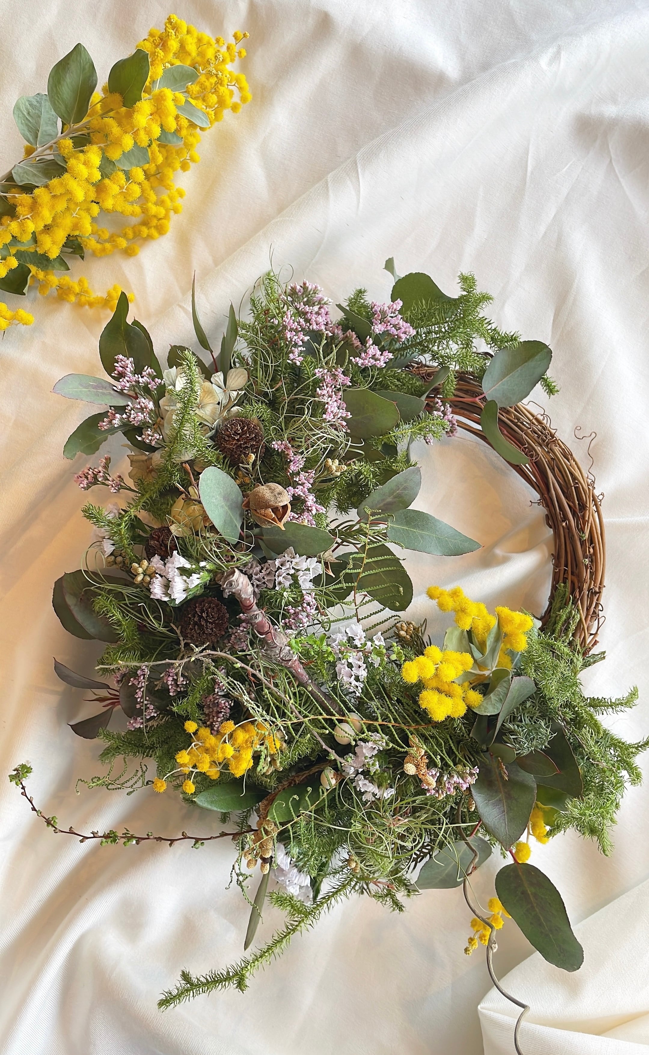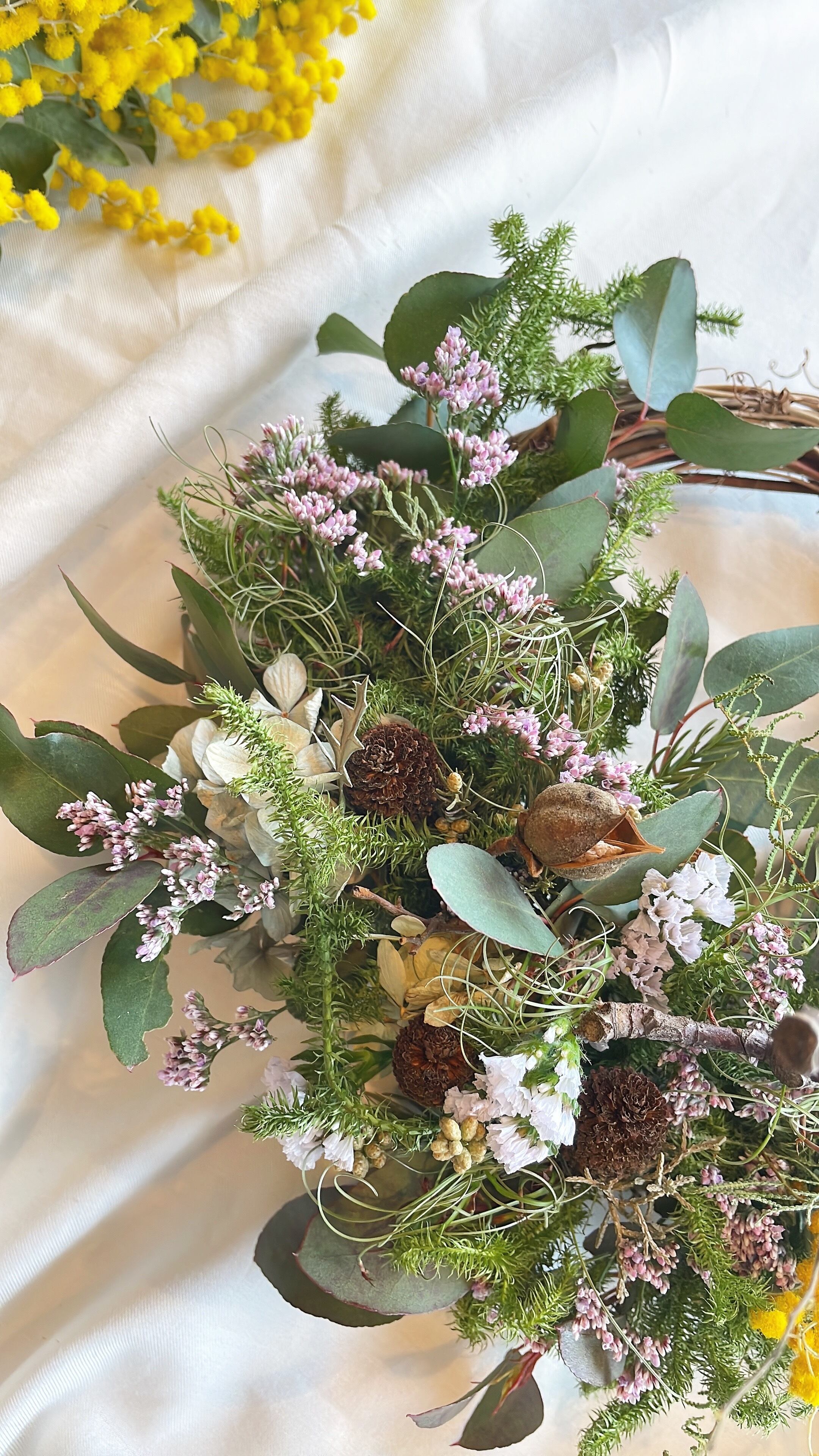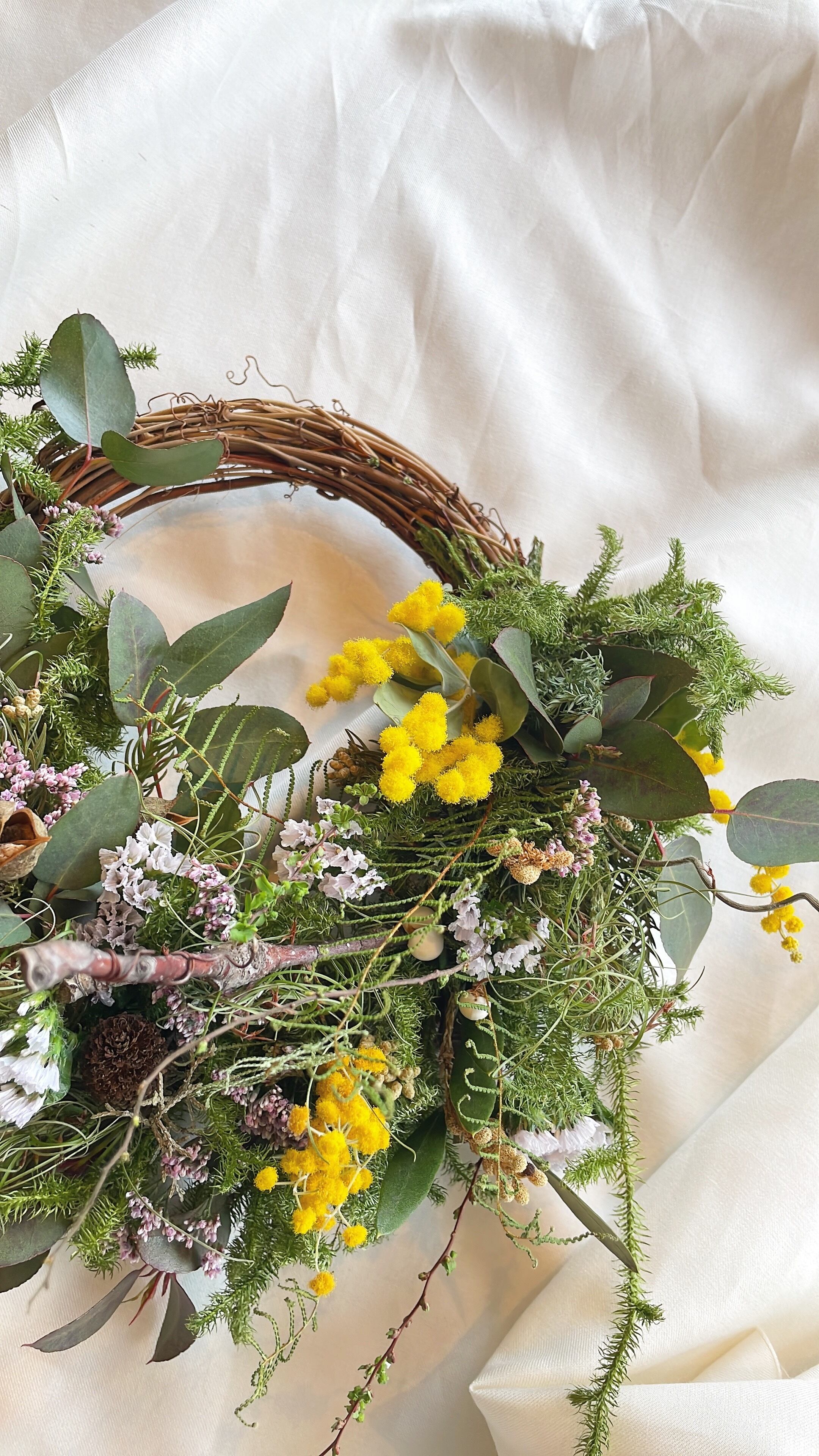 〜春の景色〜ミモザとハイブリッドスターチスの春待ちハーフリース○ドライフラワー