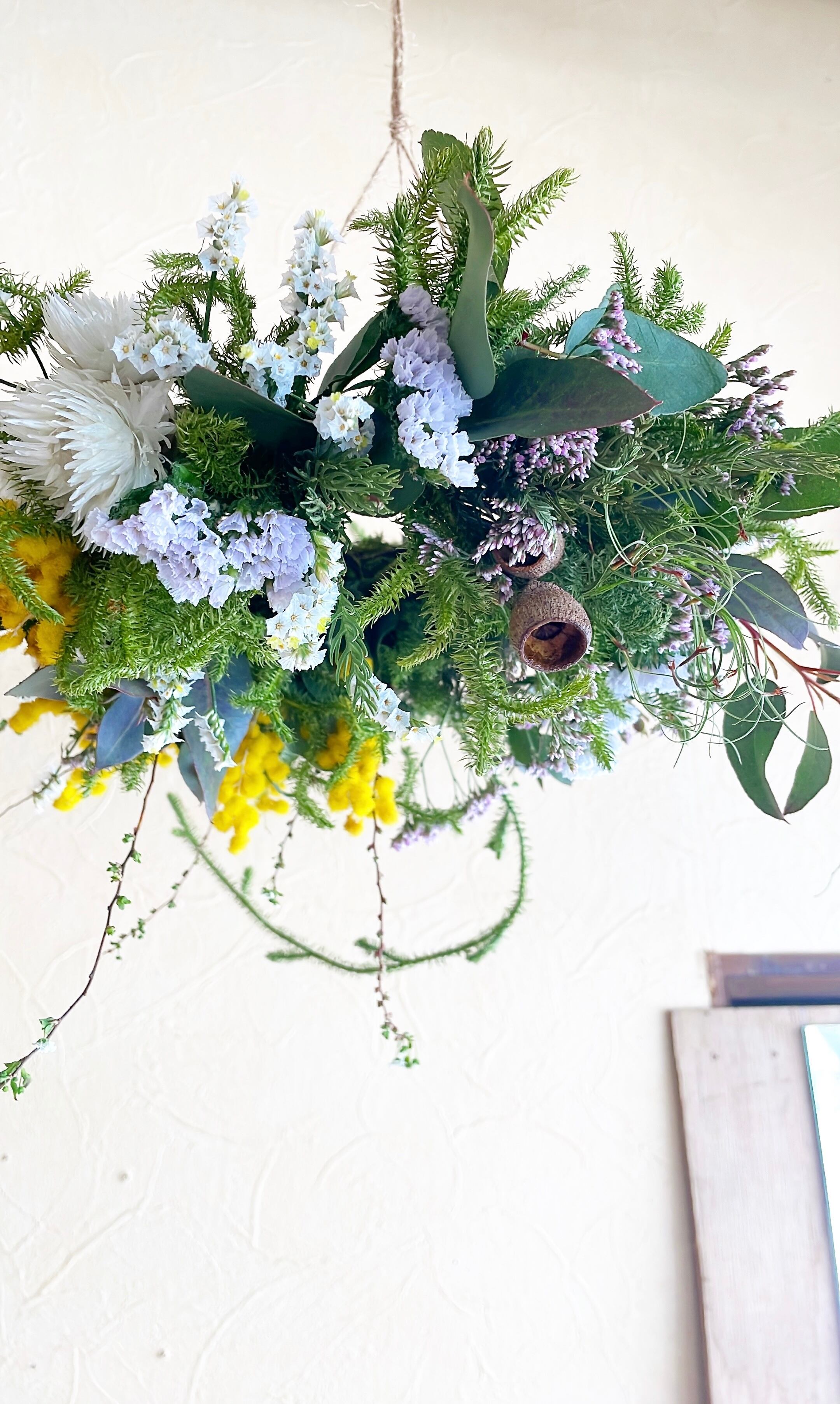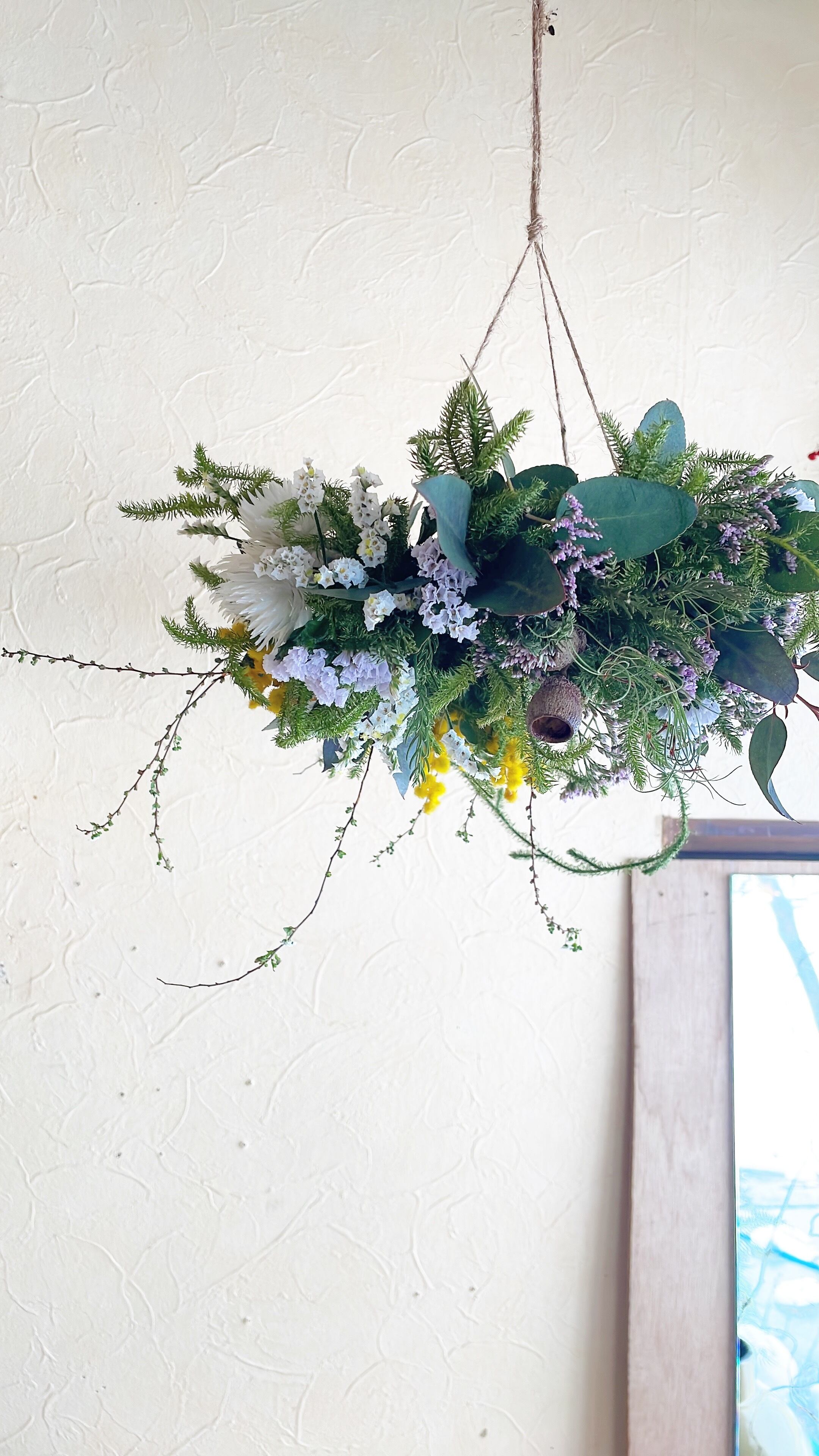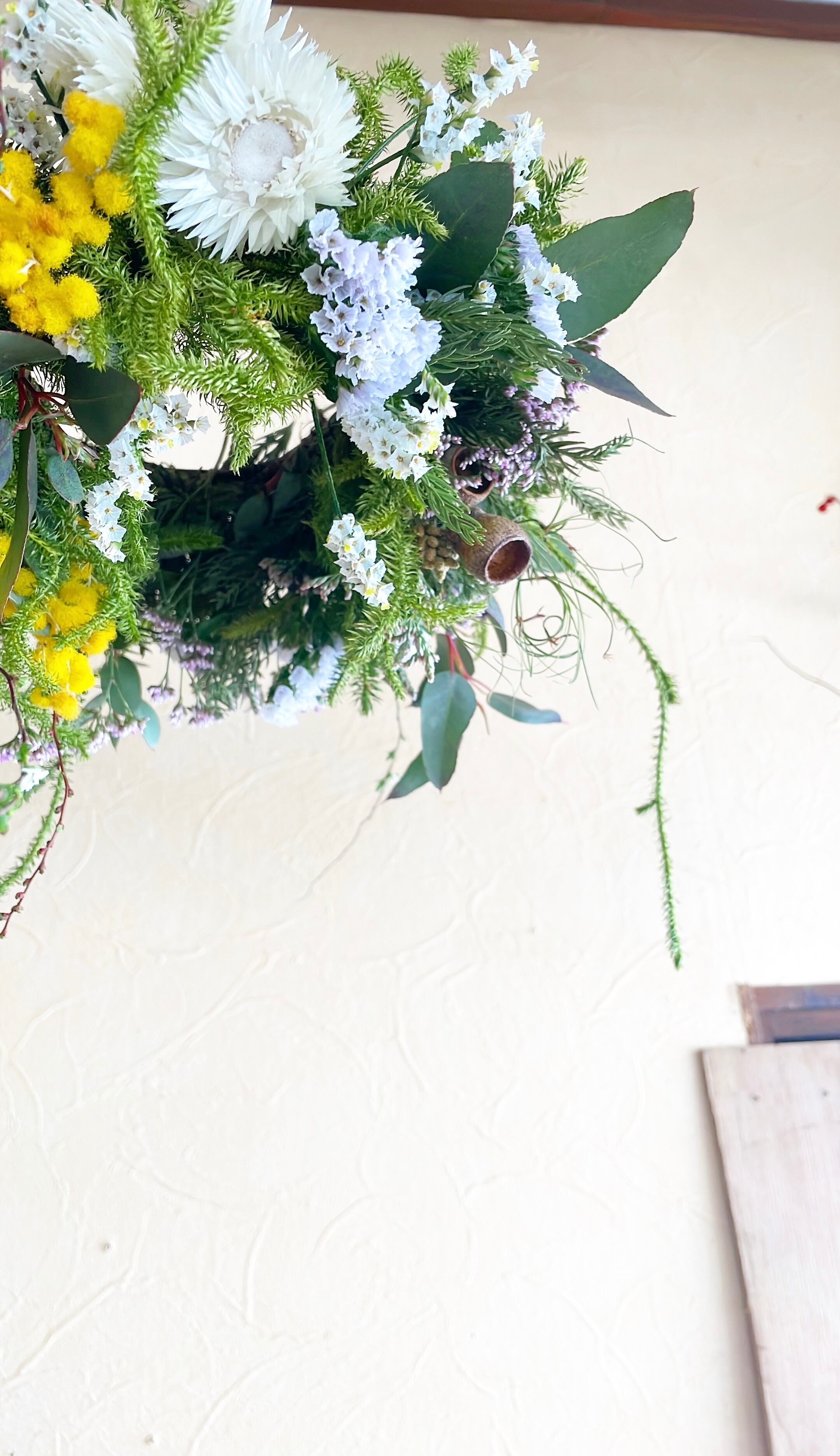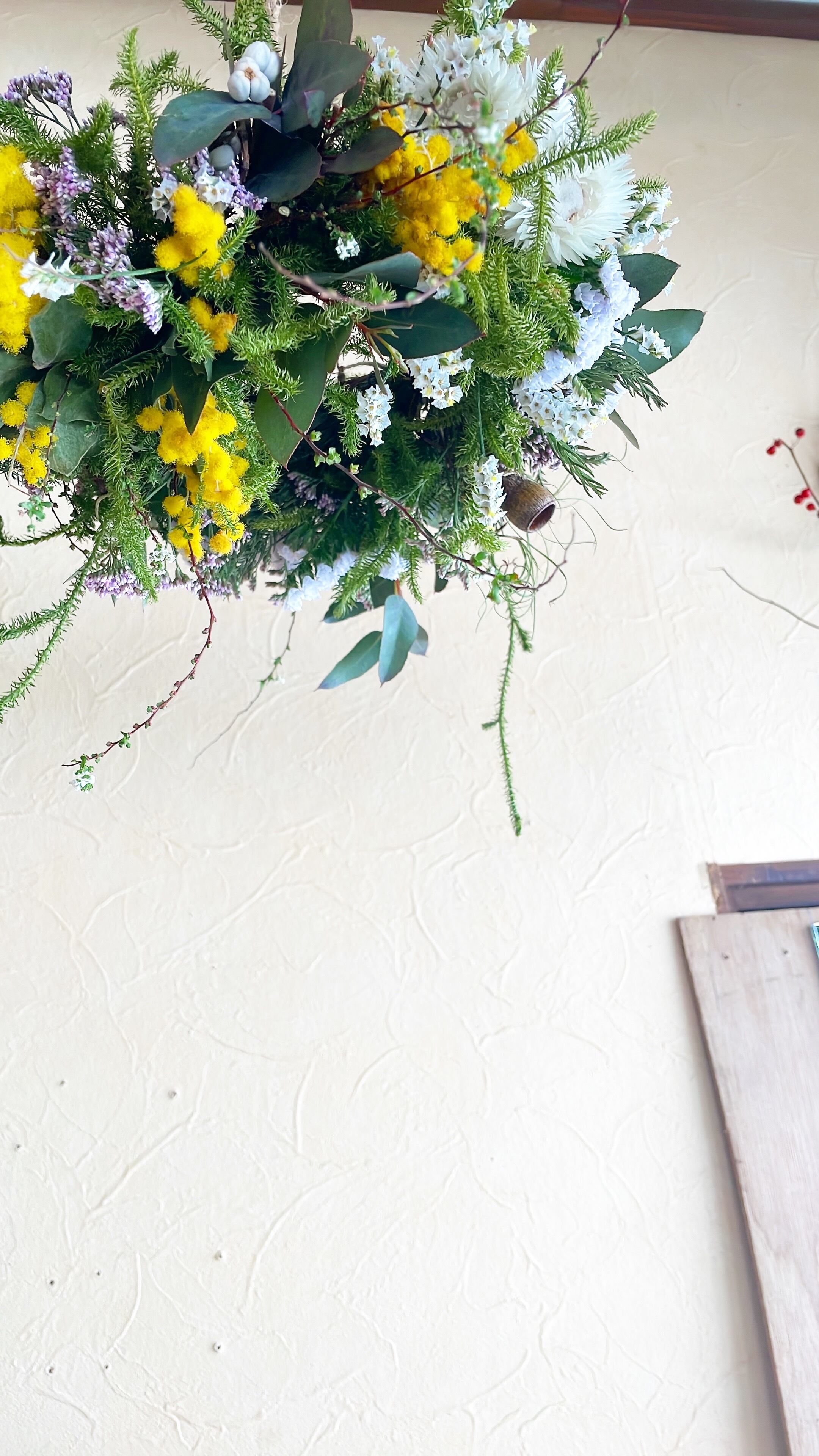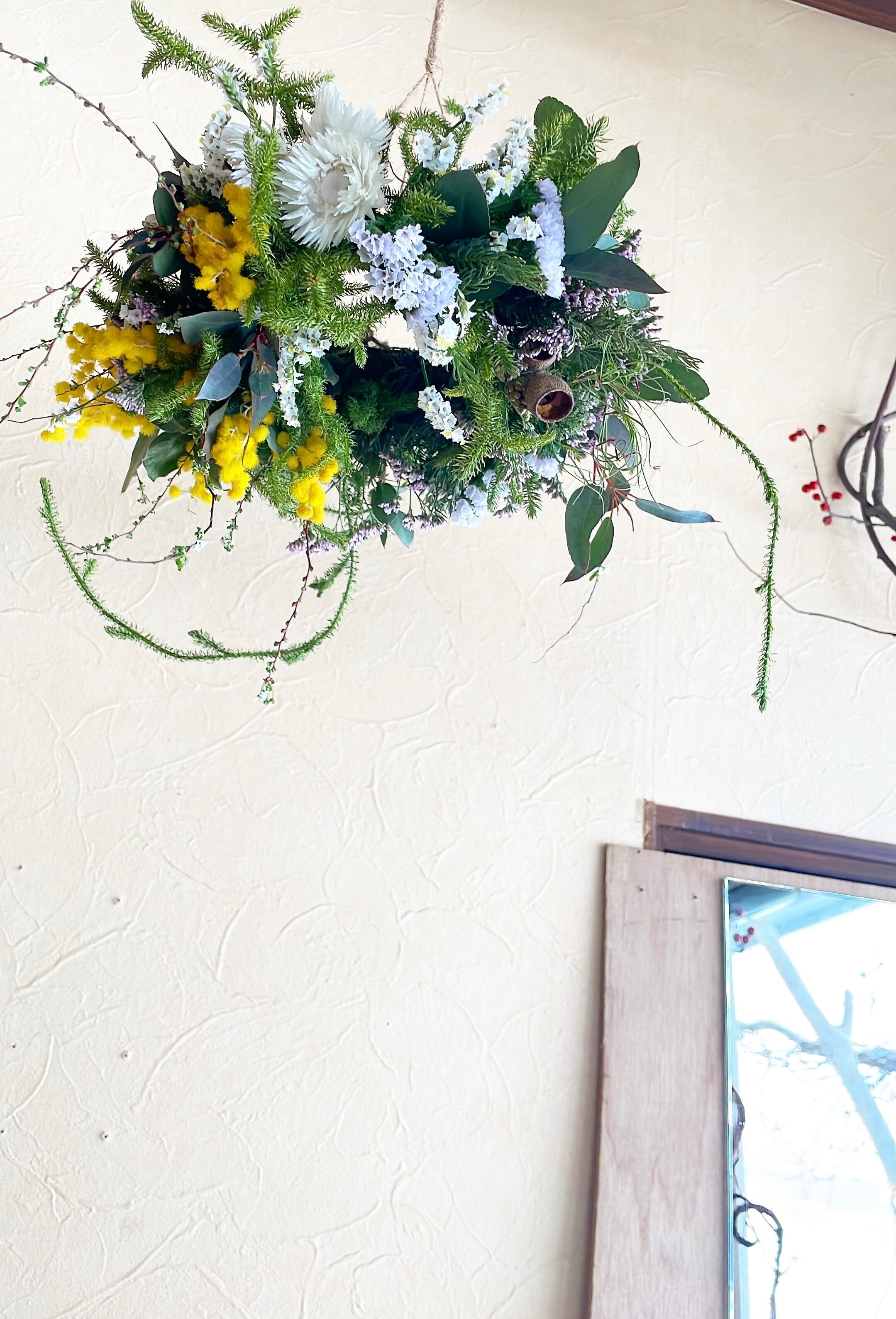 〜春の景色〜ミモザとハイブリッドスターチスの春待ちフライングリース○ドライフラワー