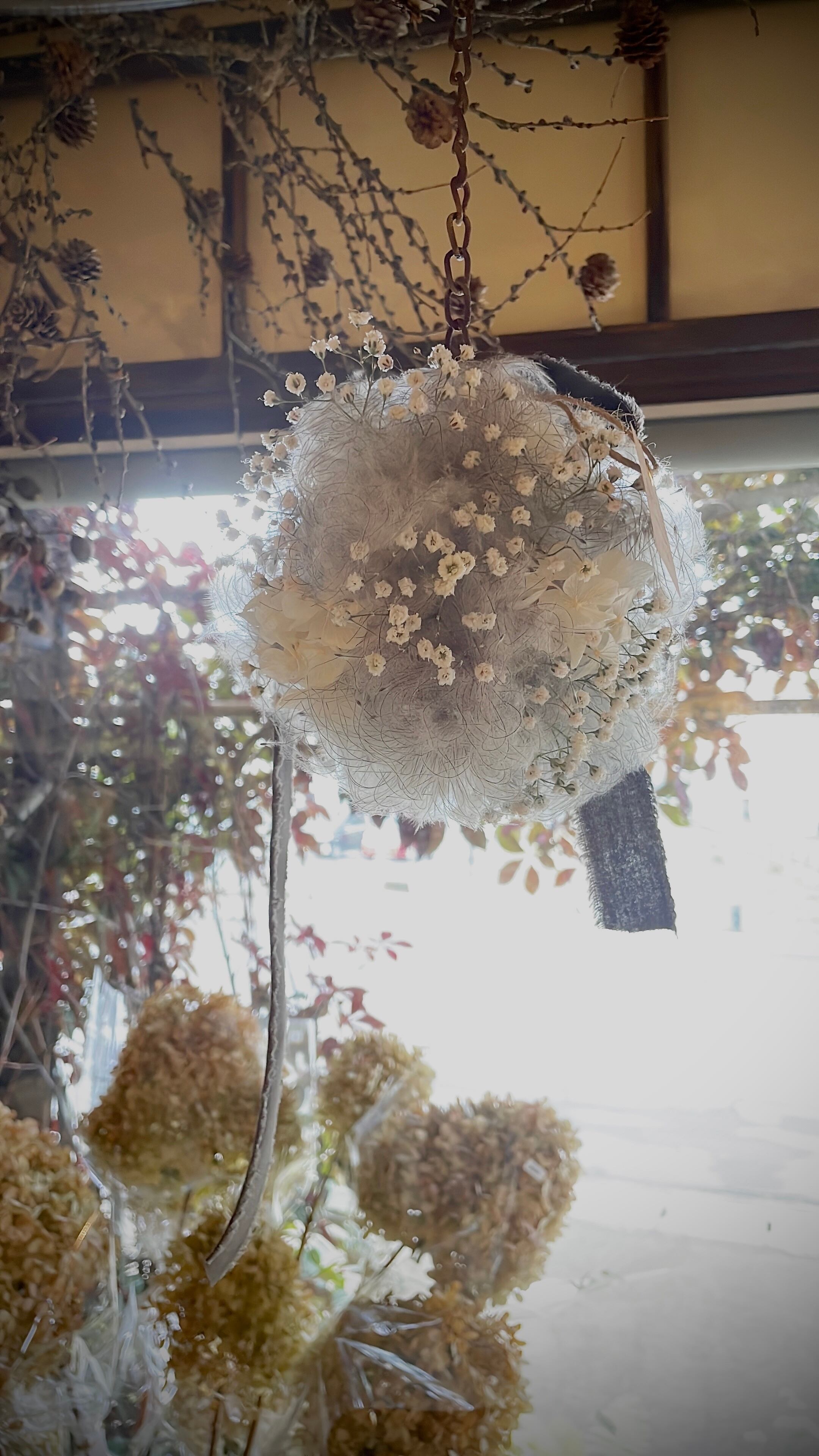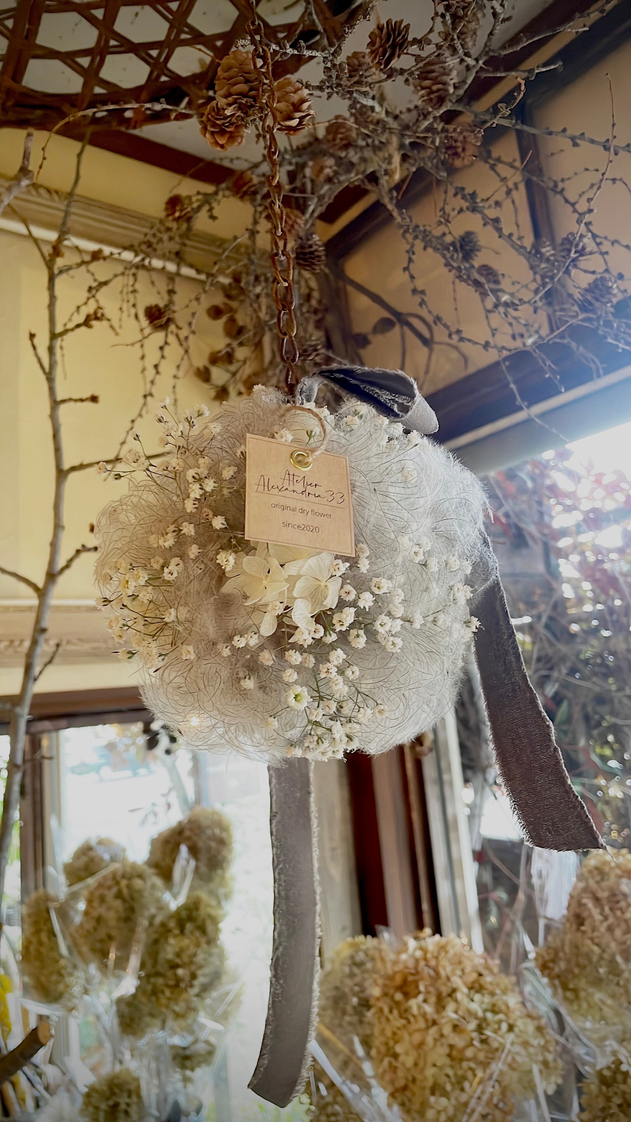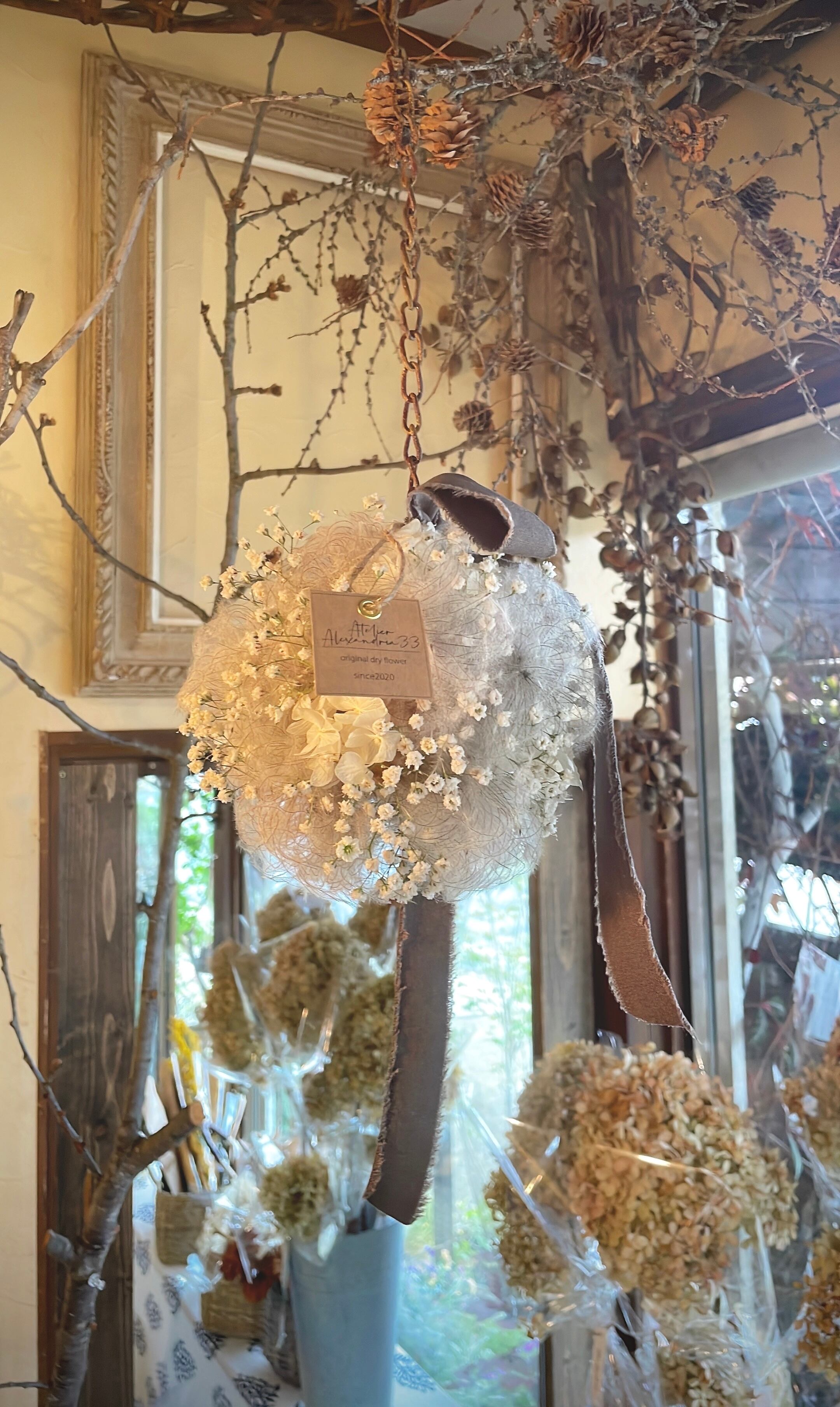 夏の光も優しく感じるオキナグサとかすみ草のフライングフラワー○ドライフラワーリース