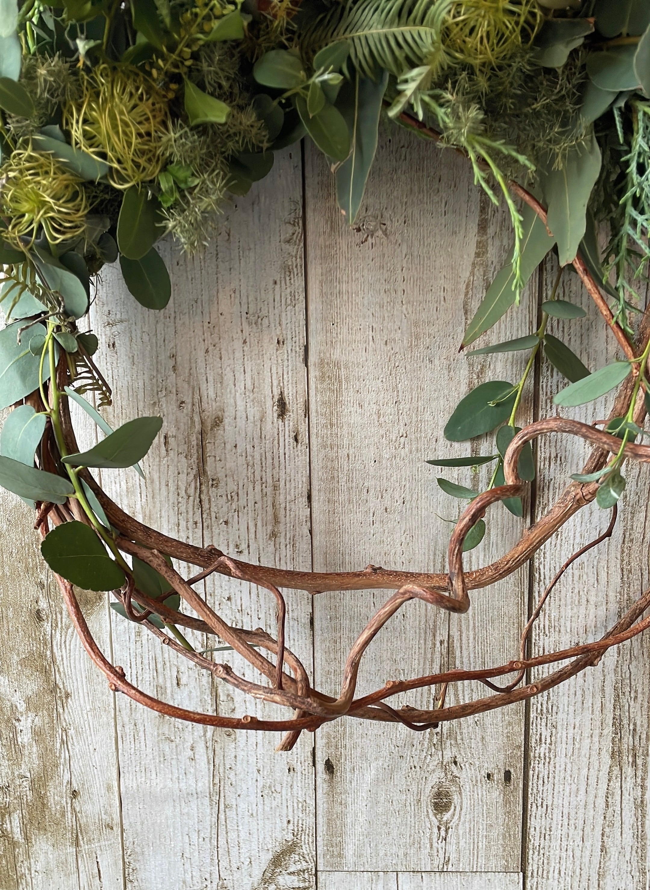山蔓に動きあるユーカリと針葉樹のグリーンリース