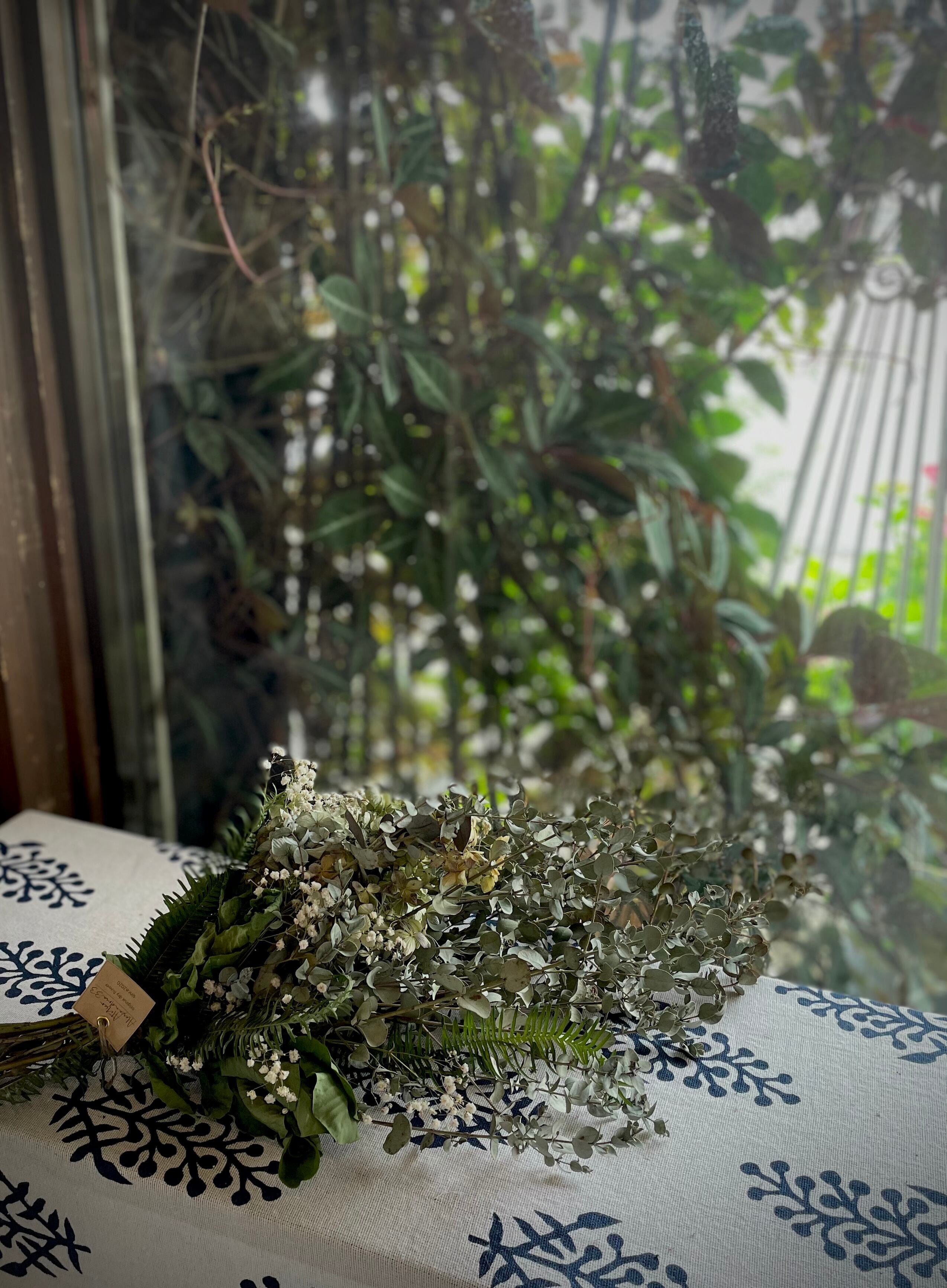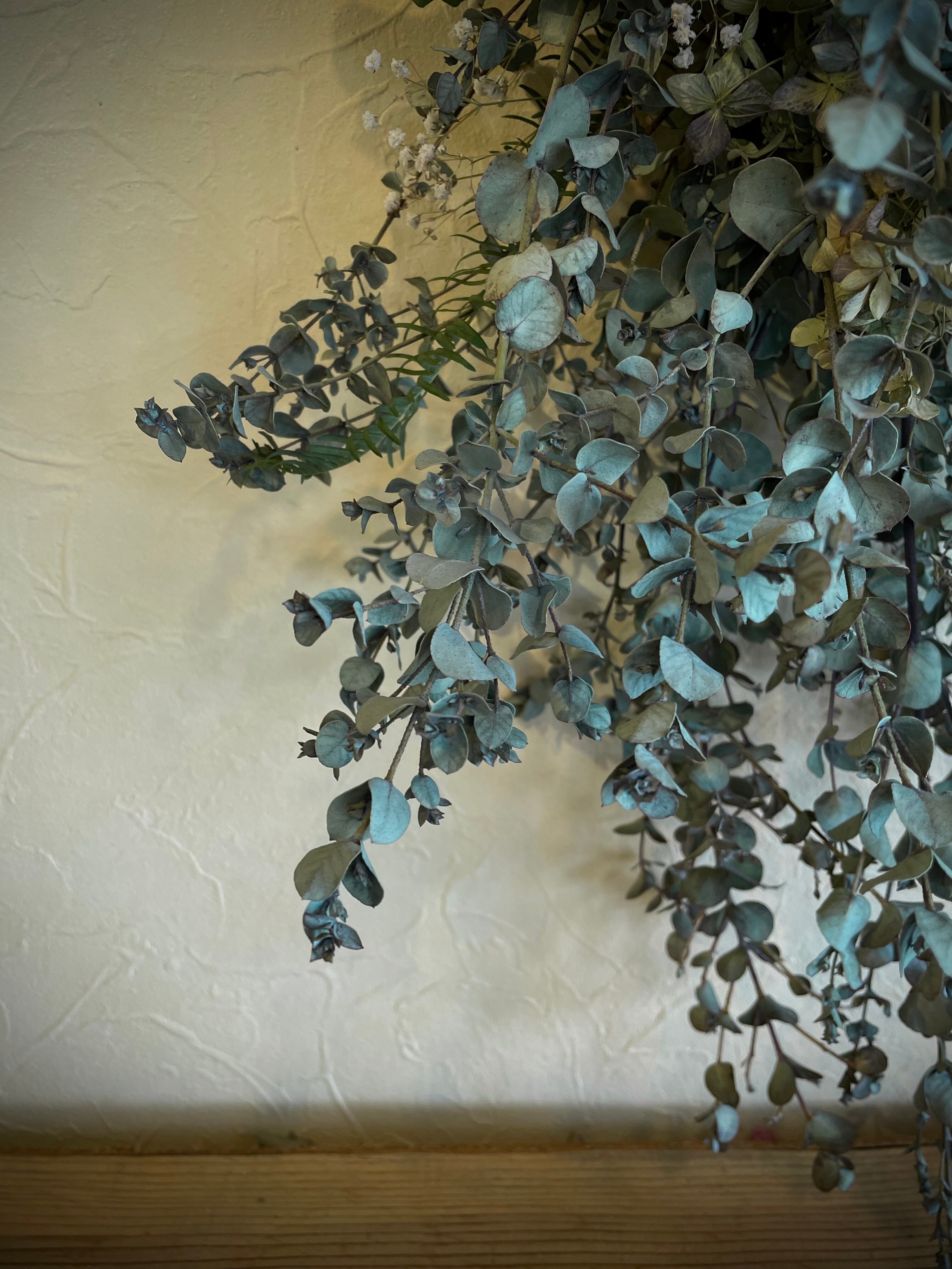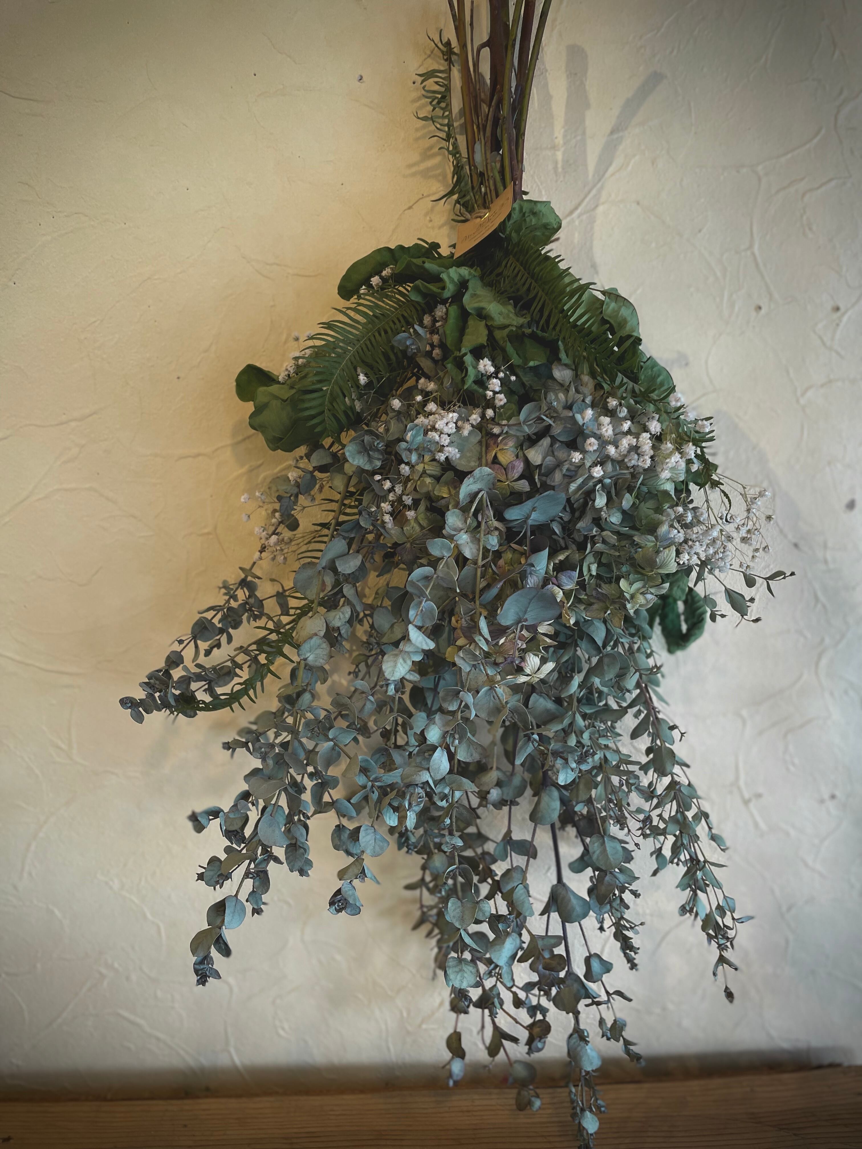 ユーカリグリーンとアンティークあじさいの物静かなスワッグ○ドライフラワースワッグ