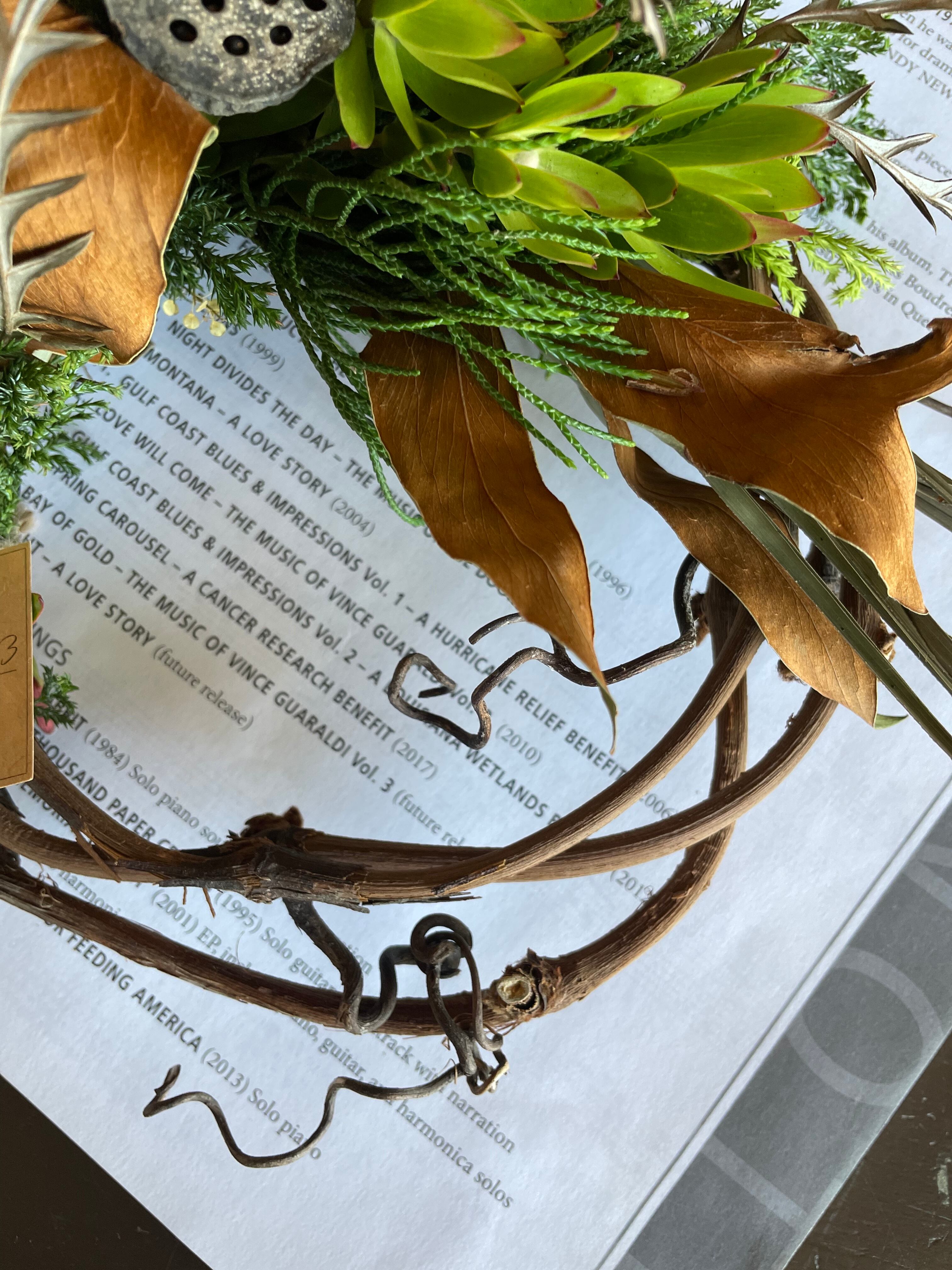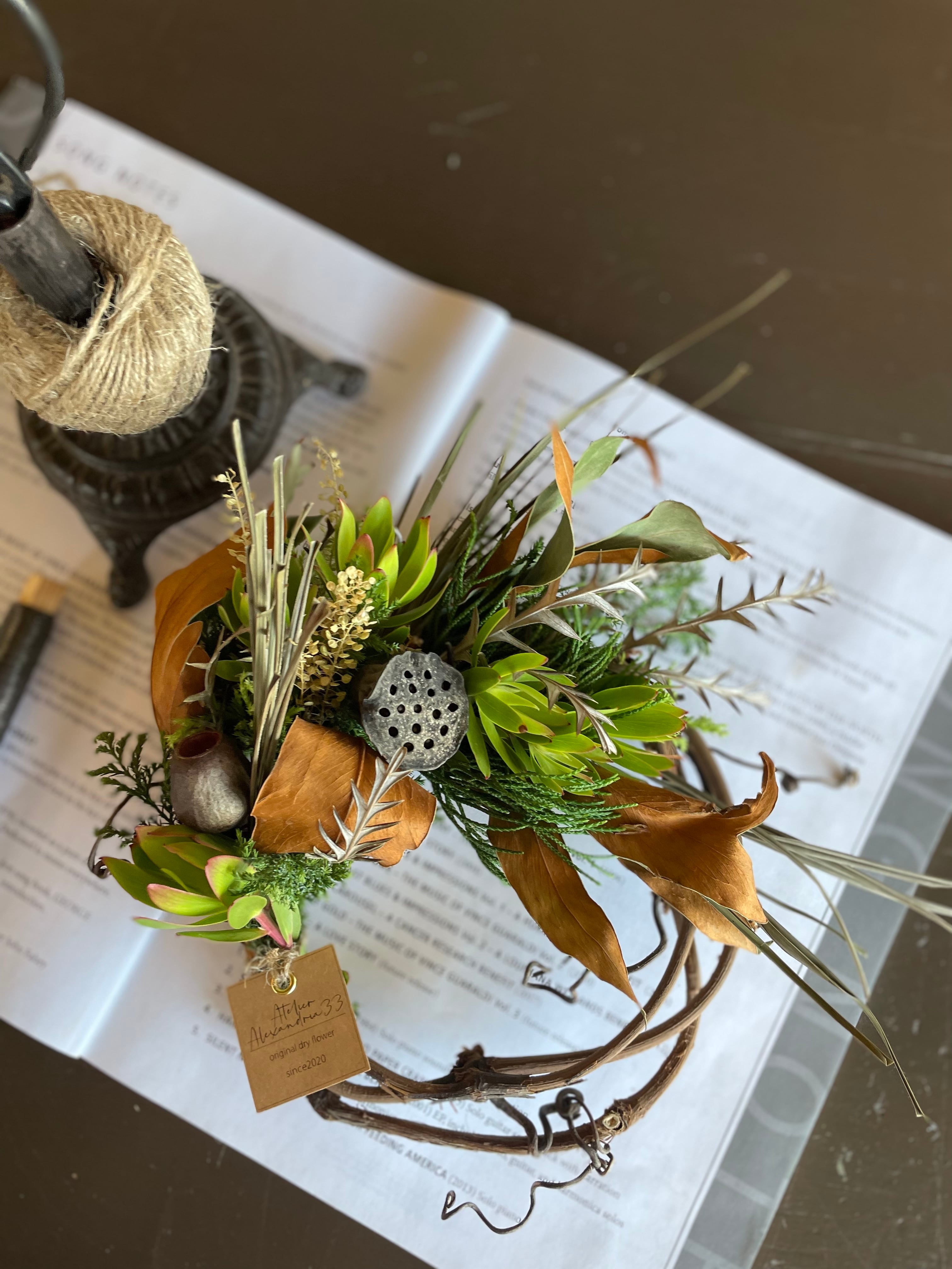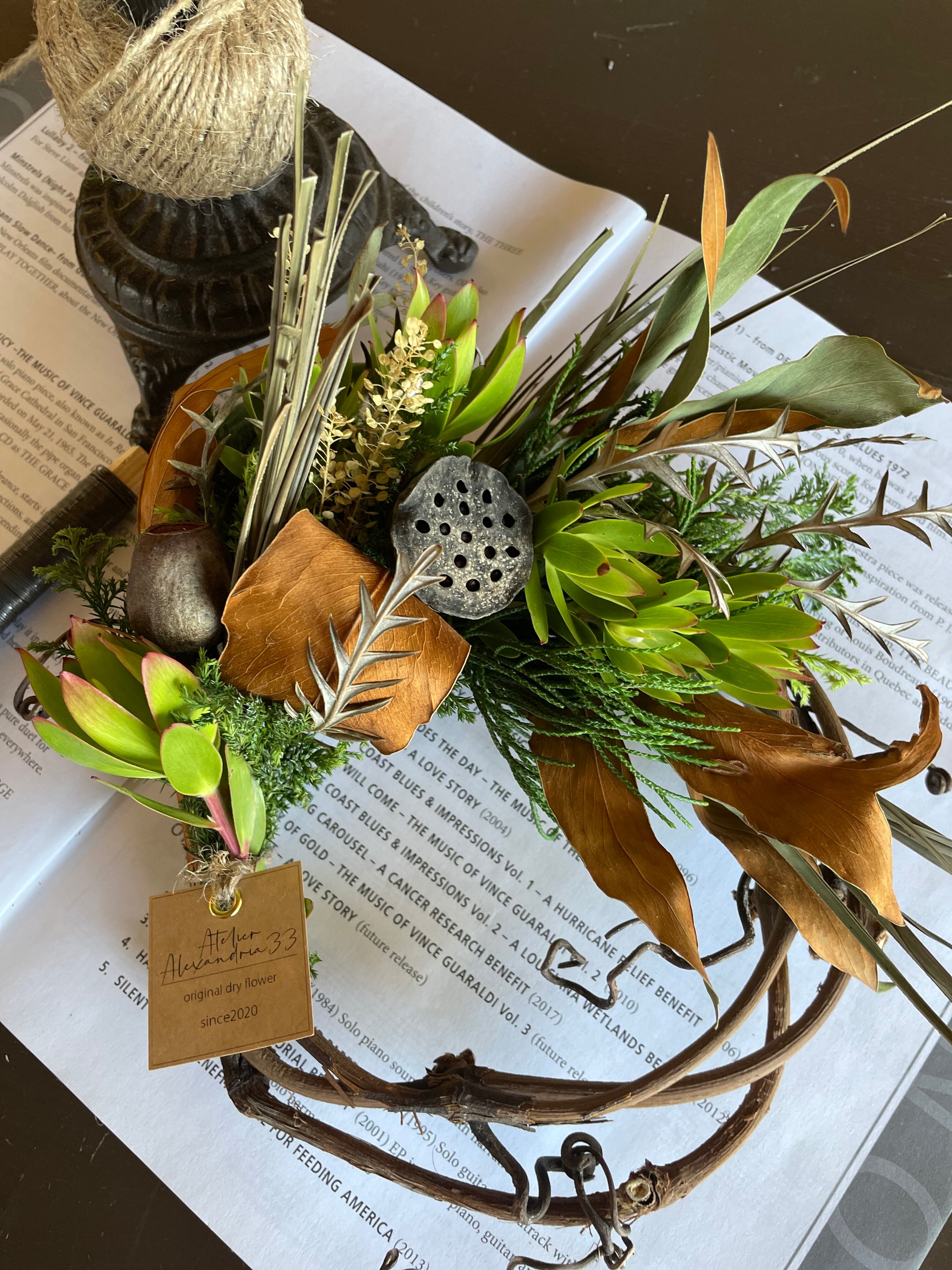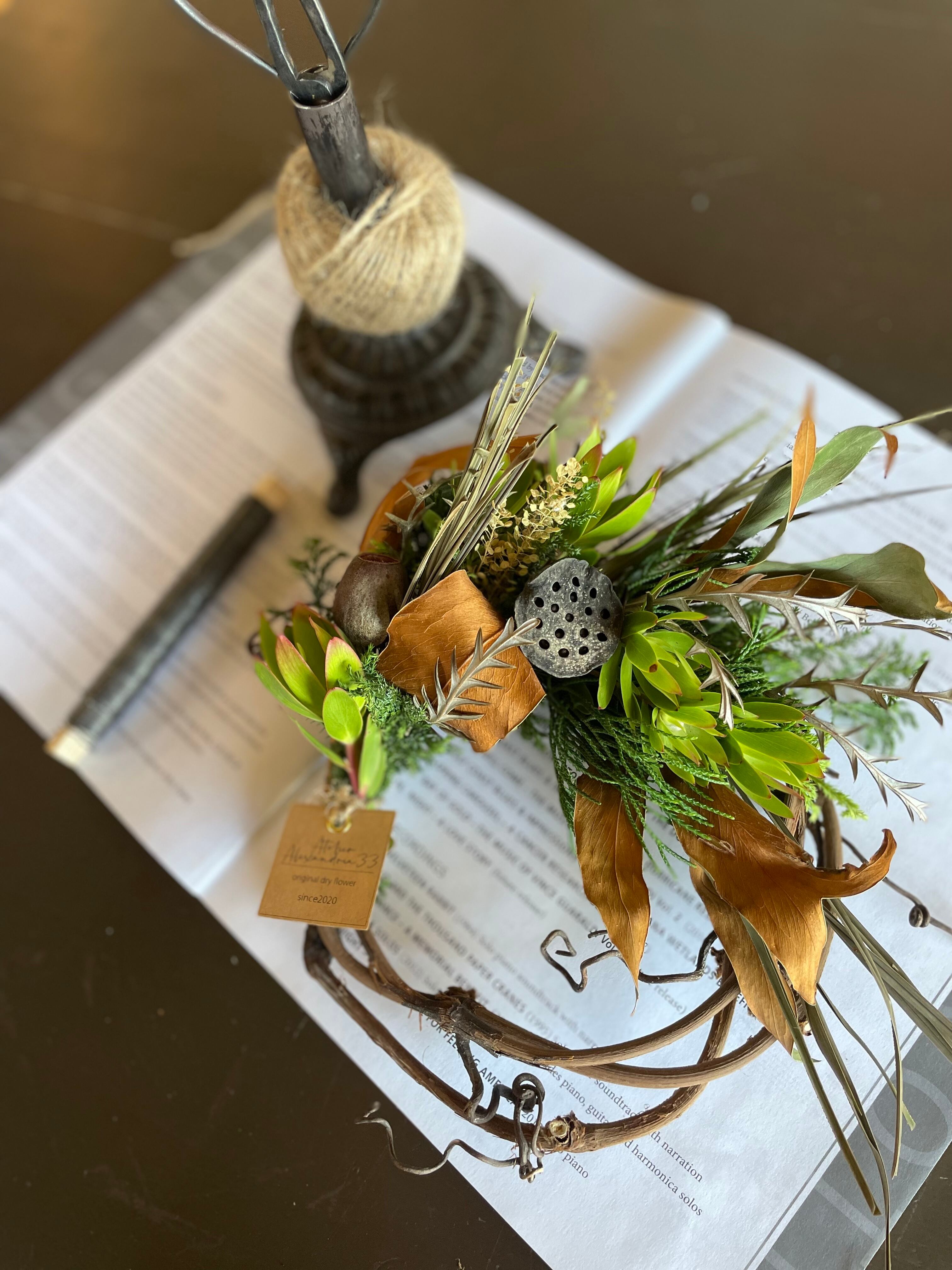 山葡萄蔓に緑豊かなナチュラルハーフリース○ドライフラワーリース