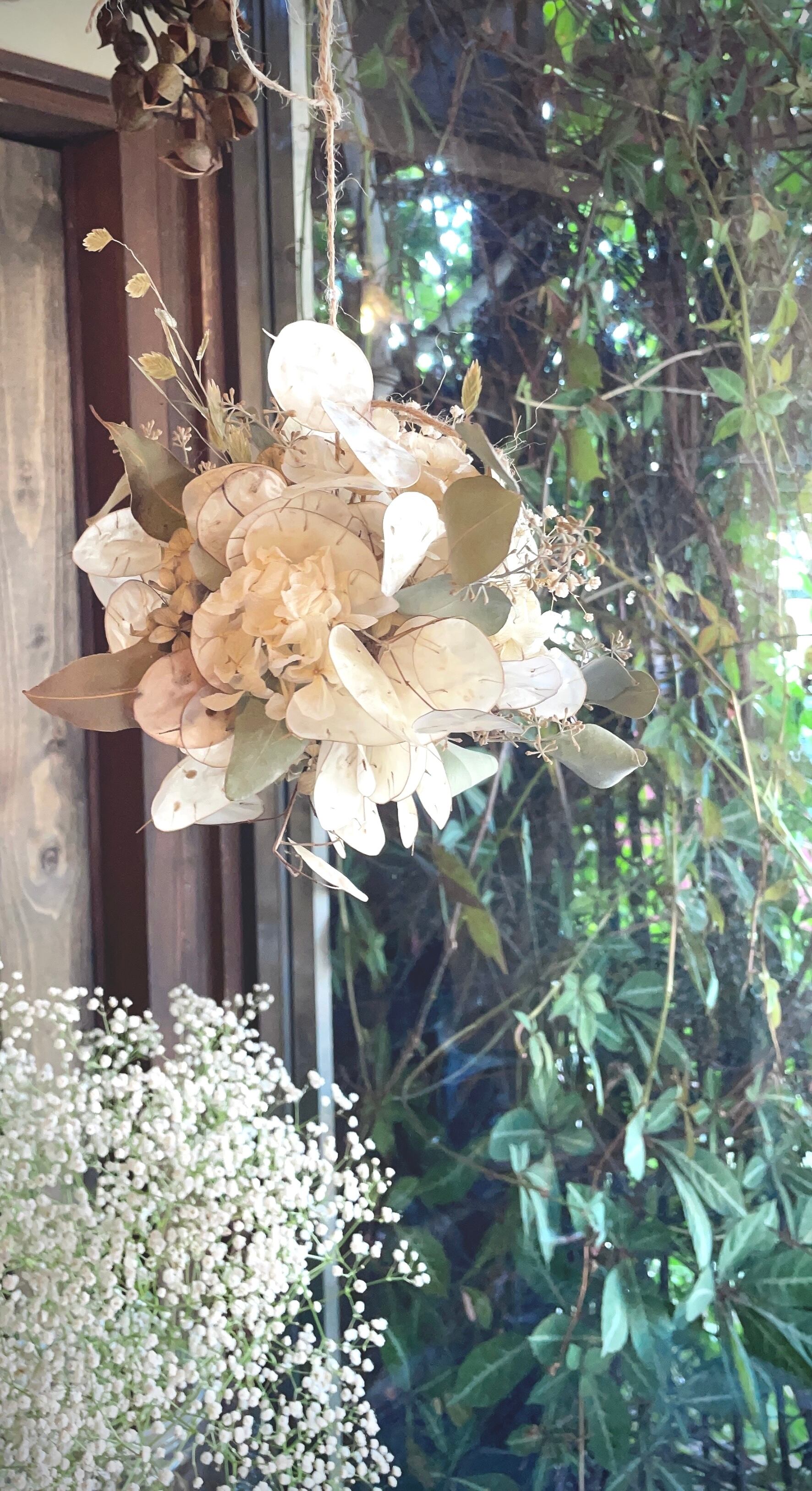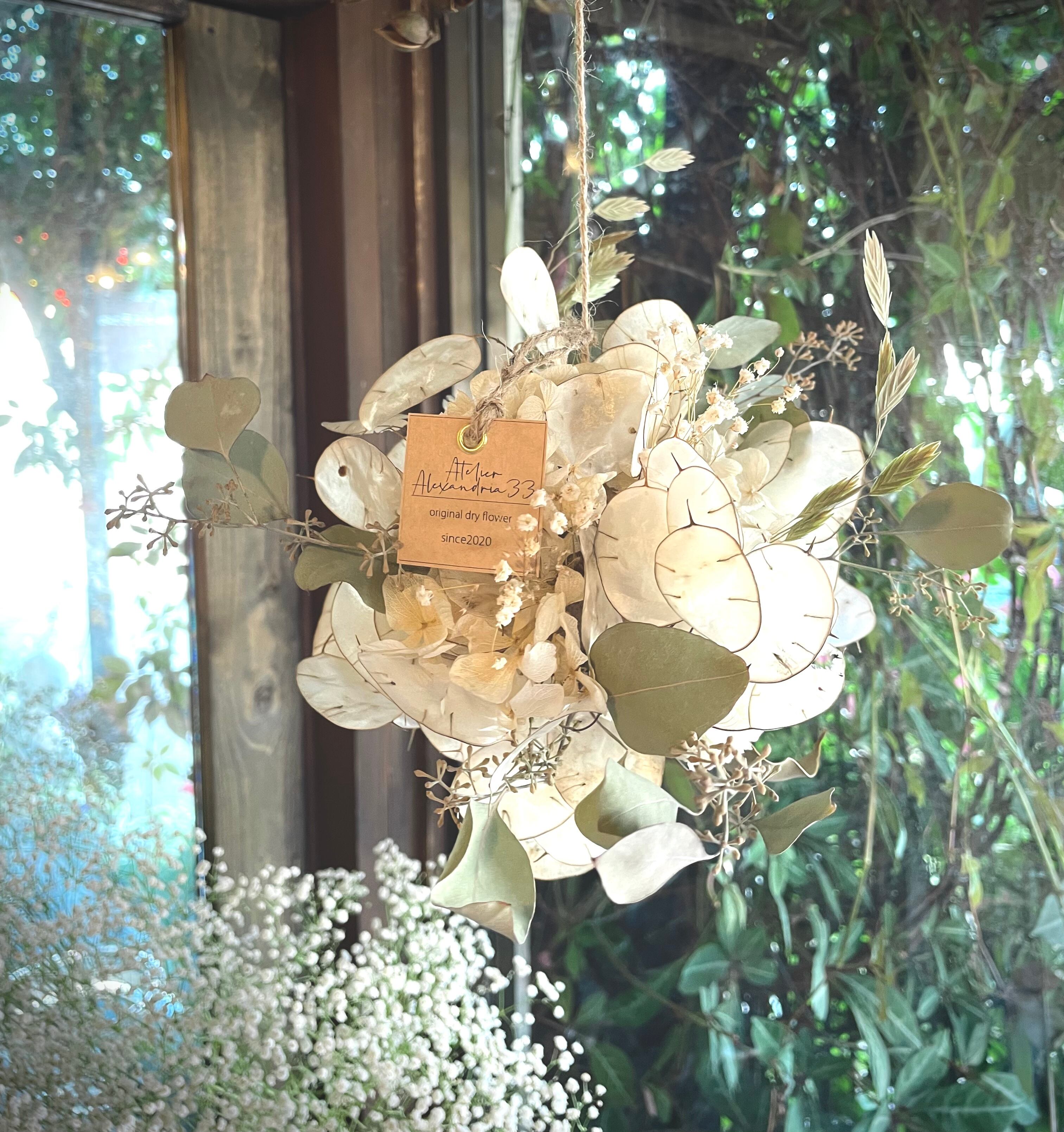 秋の風に揺れる、ルナリアのフライングフラワーボールドライフラワー。美しい花々が軽やかに舞っているようなデザインで、秋の風景を感じさせてくれます。