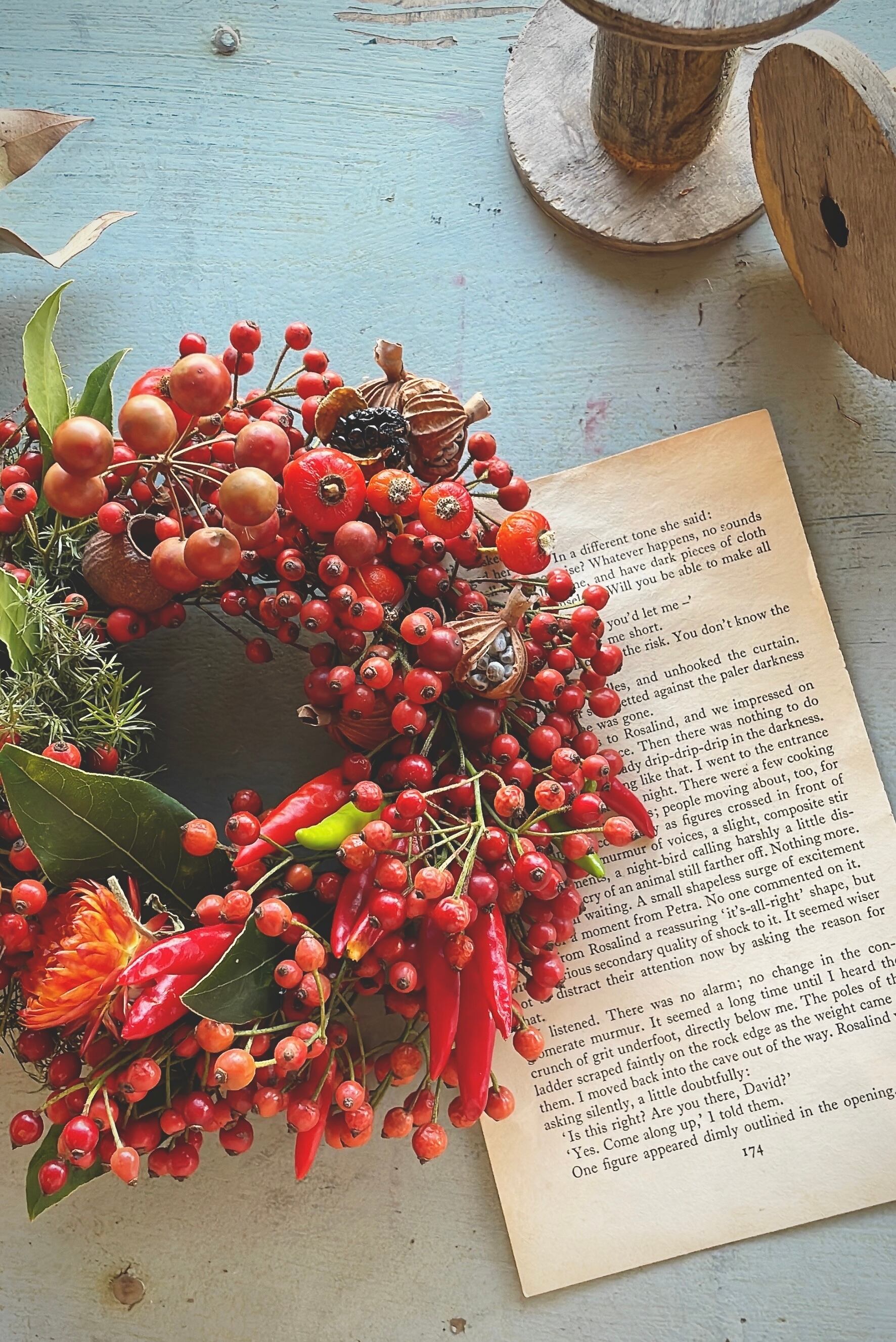 秋から冬へ…真っ赤な実ローズヒップと月桂樹のアレンジリース