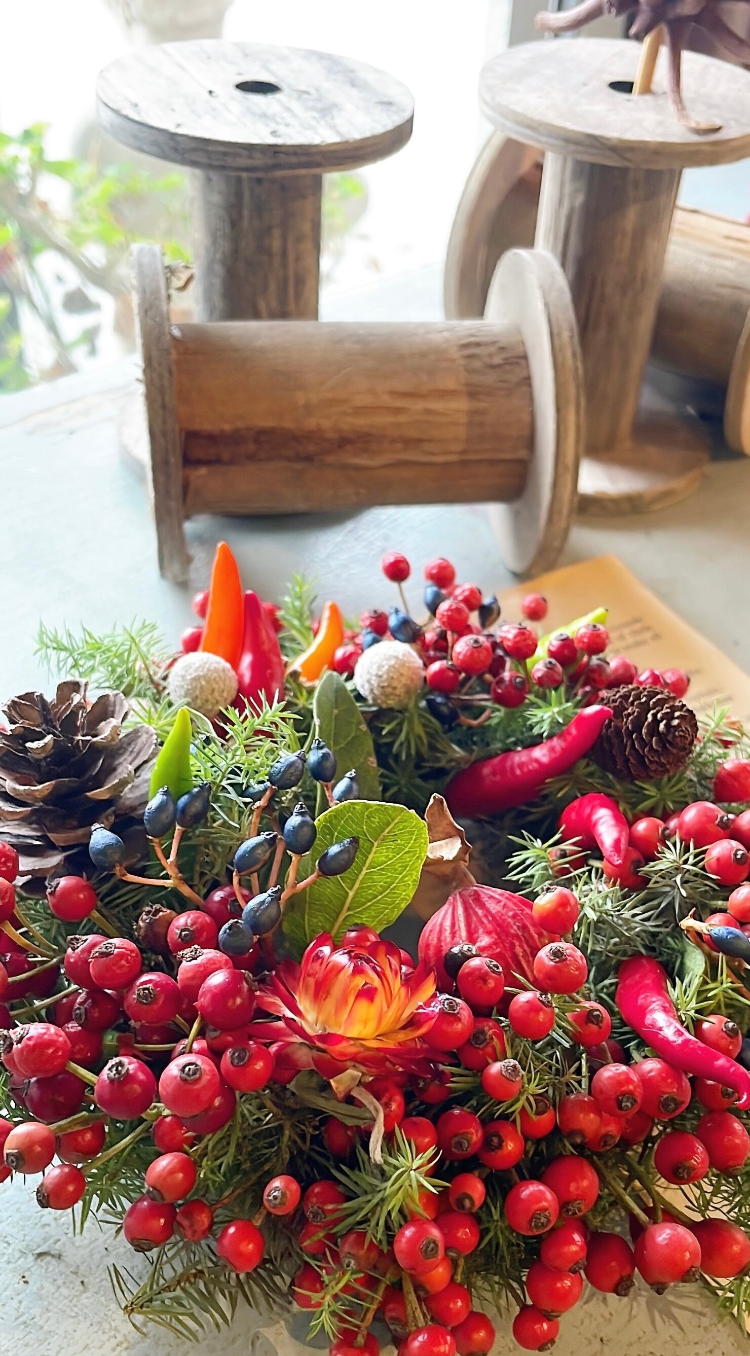 赤いベリーを集めたリースです。