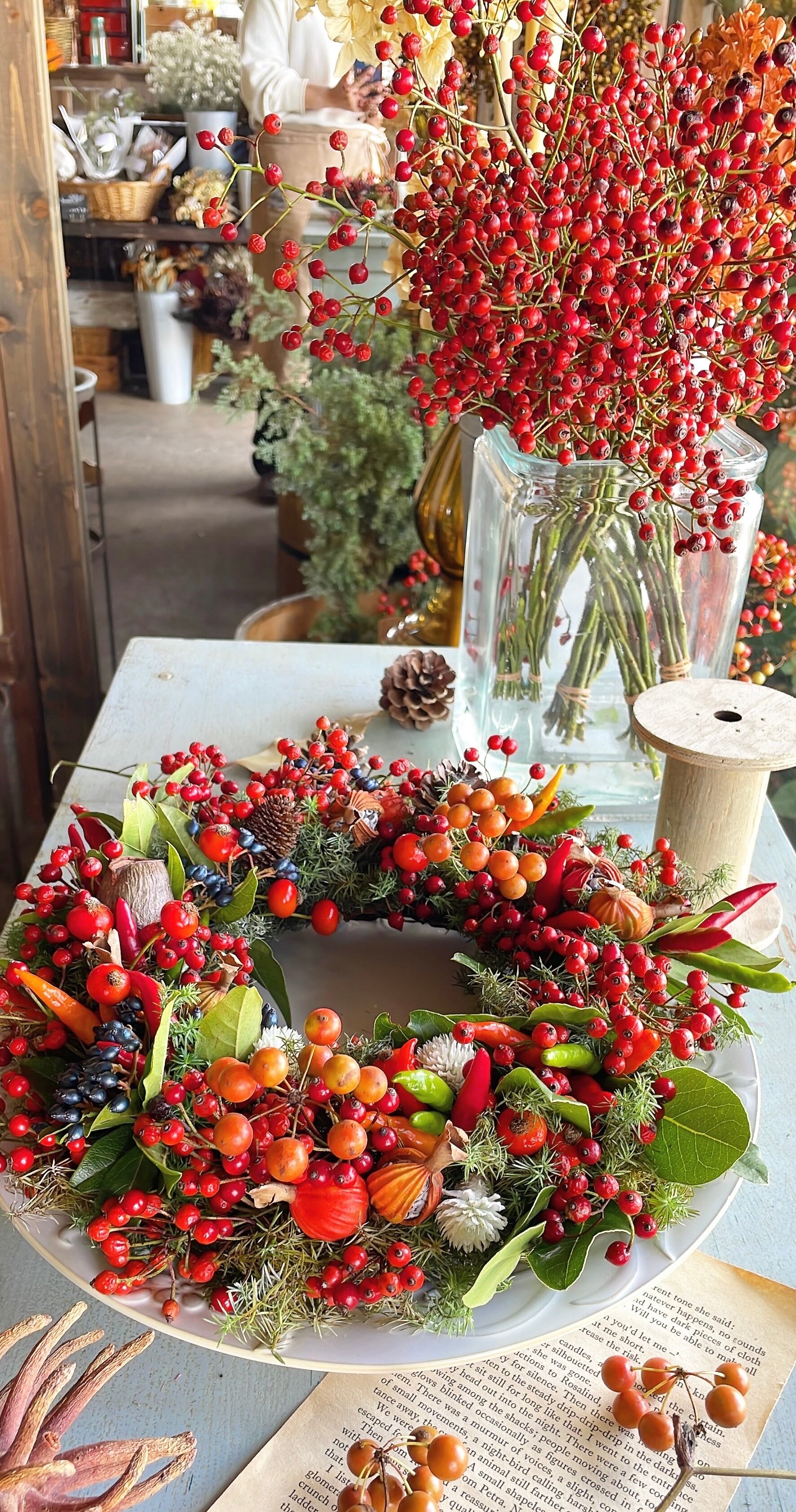 リースの中には、秋の風情を感じさせるオーガニックな素材を使用し、手作り感溢れる仕上がりとなっています。