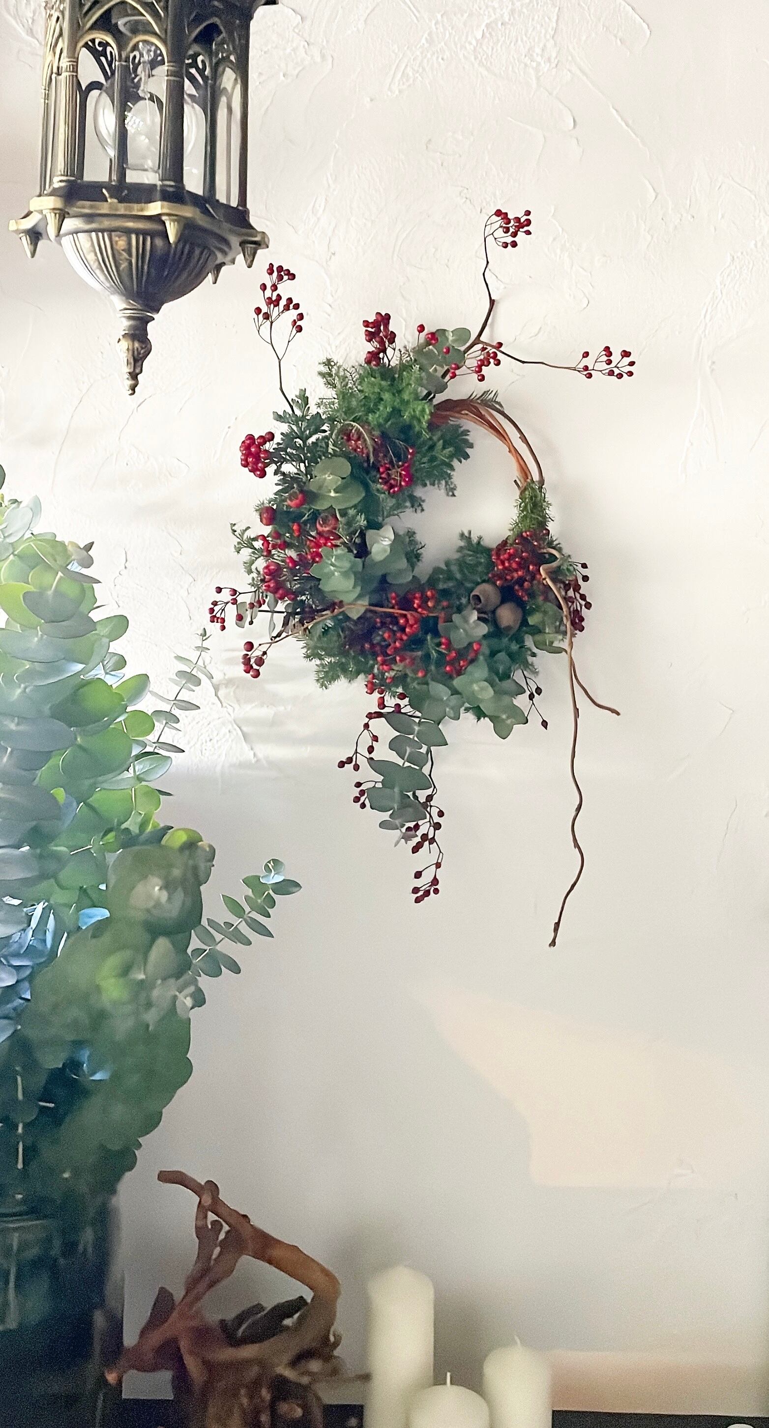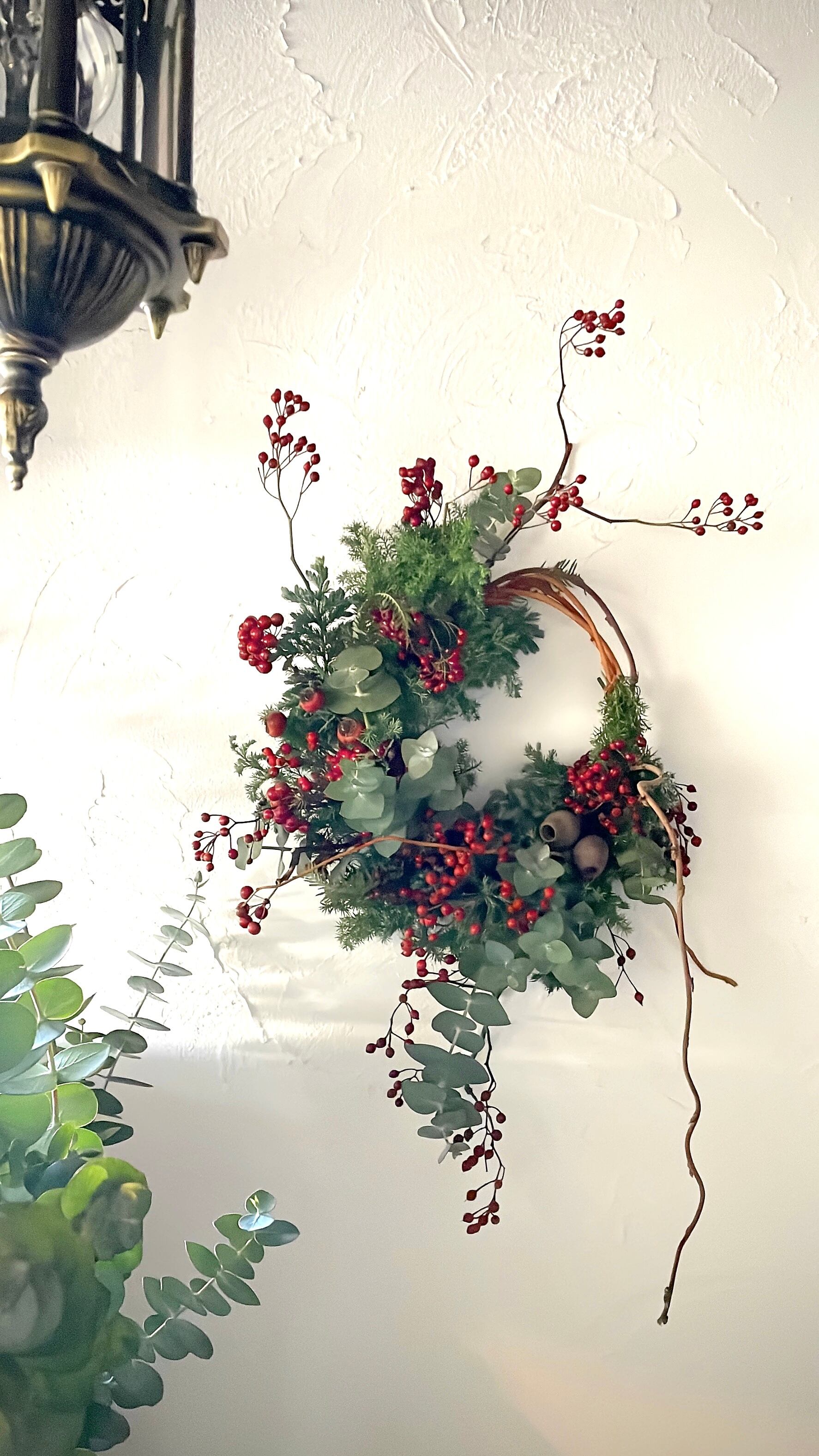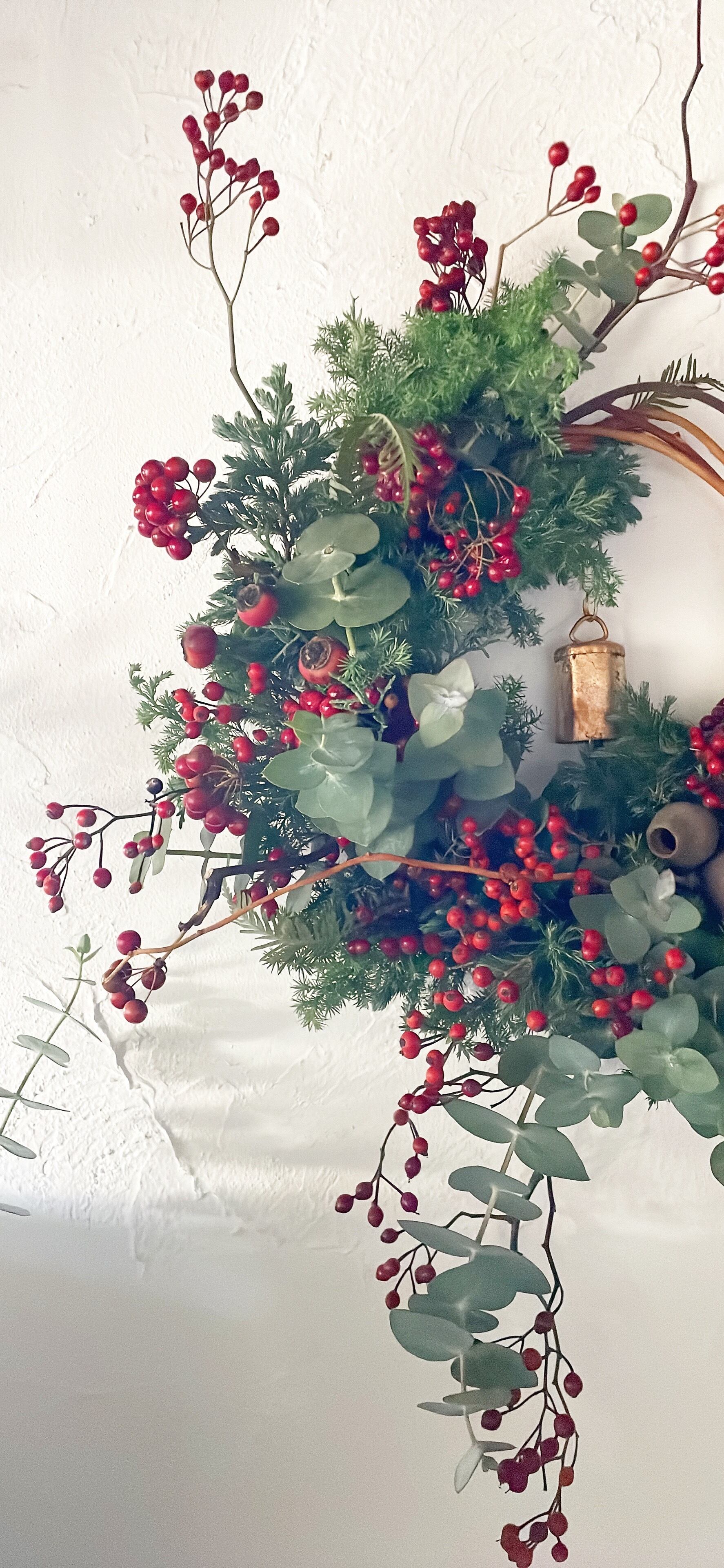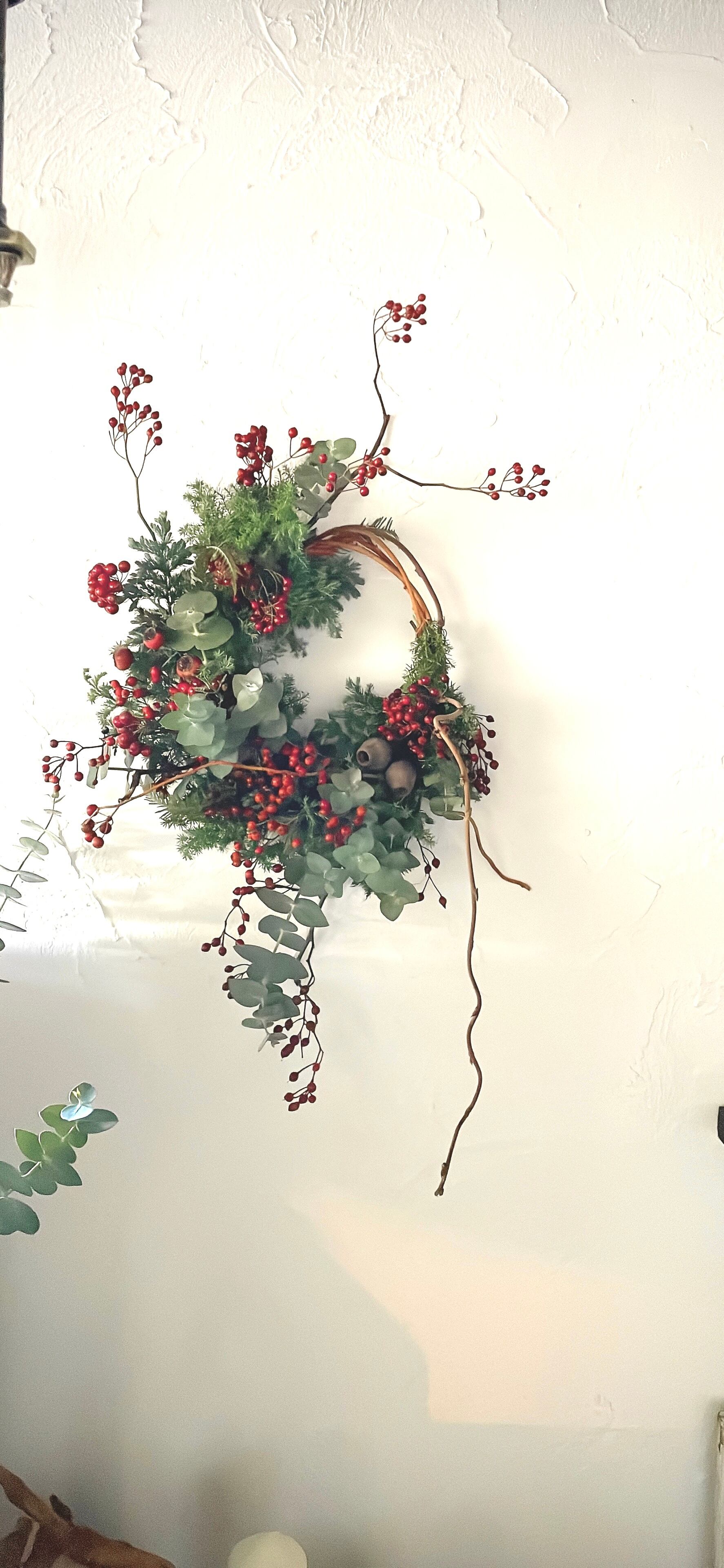 伸びやかに壁面を彩る野薔薇のクリスマスリース○ベル付き