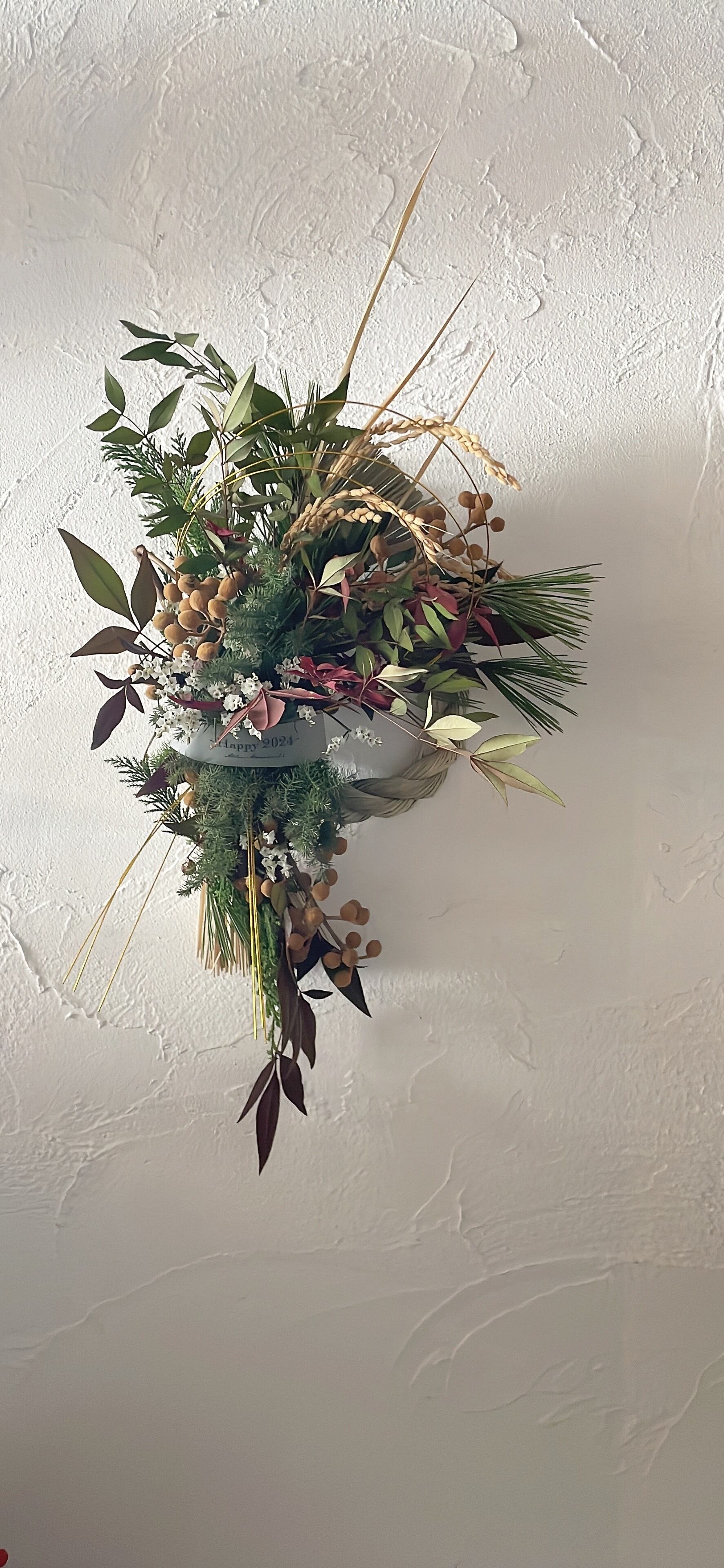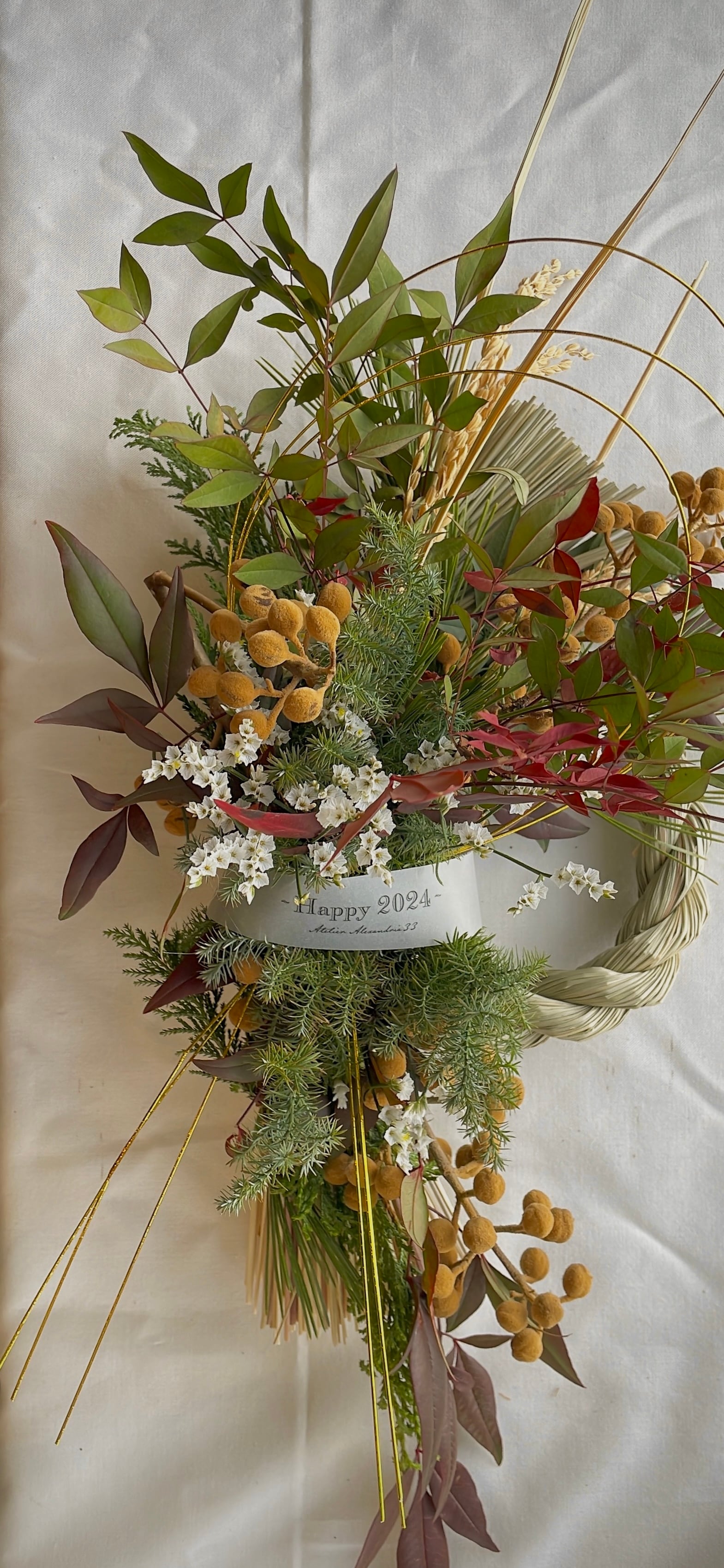 このスワッグは平和と安全、金運を意味する花材を加えております。