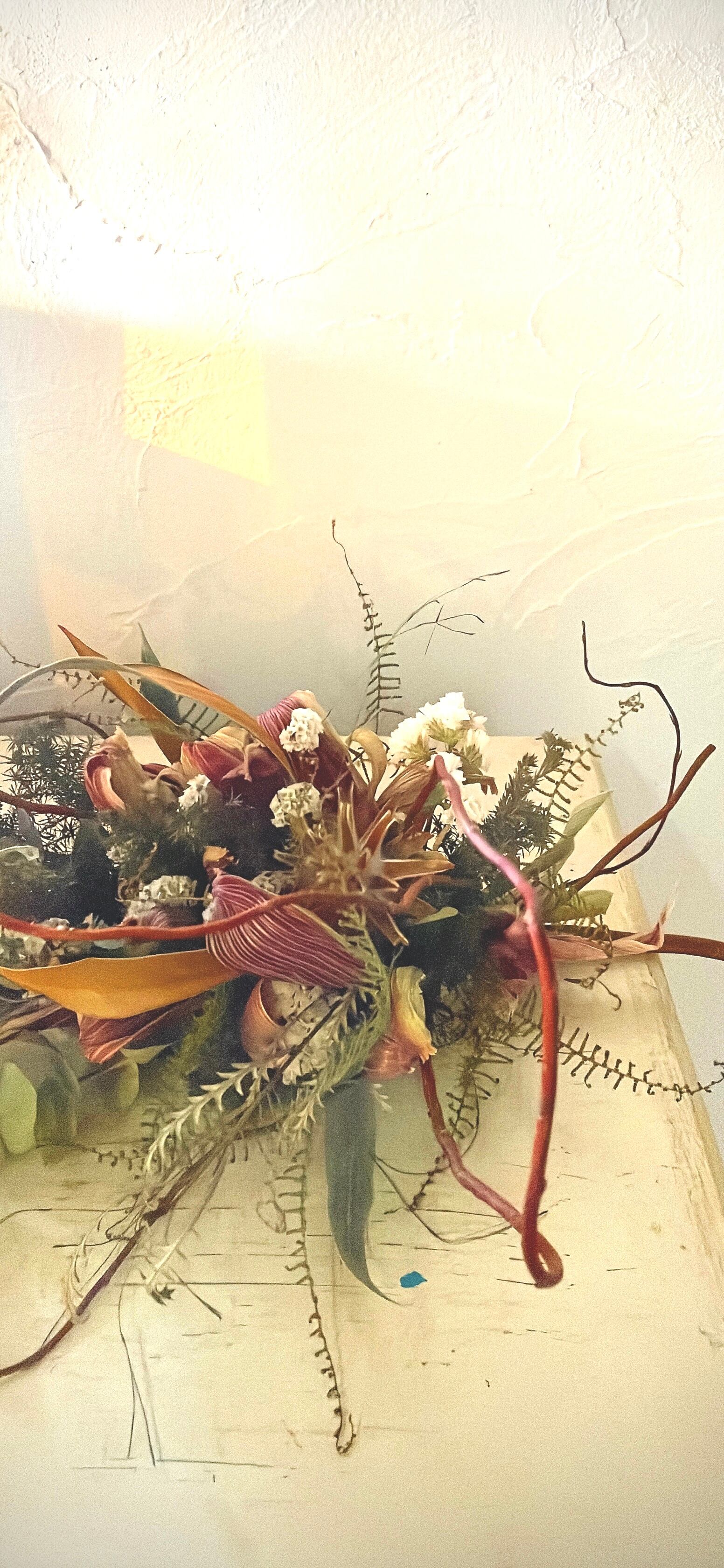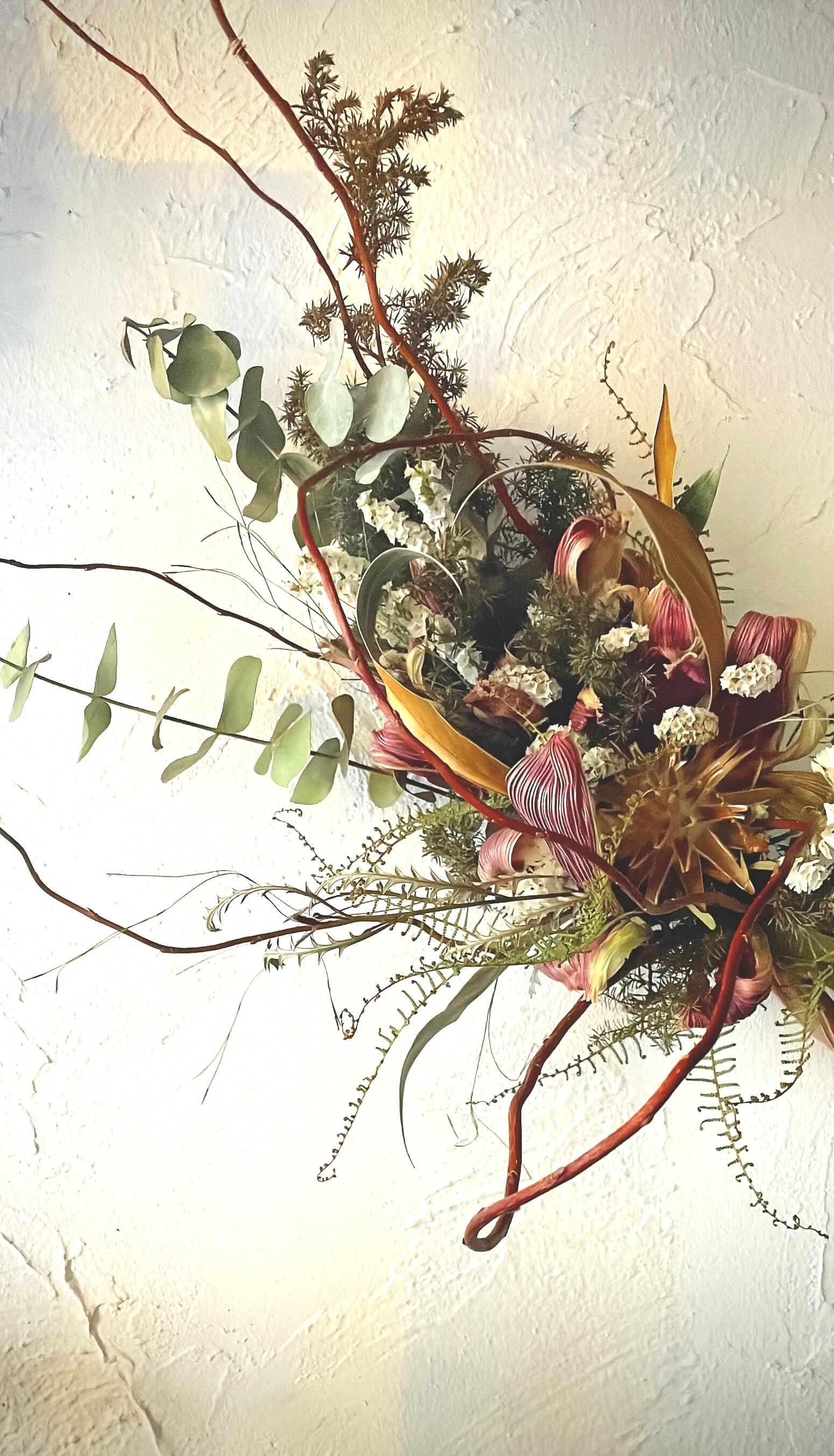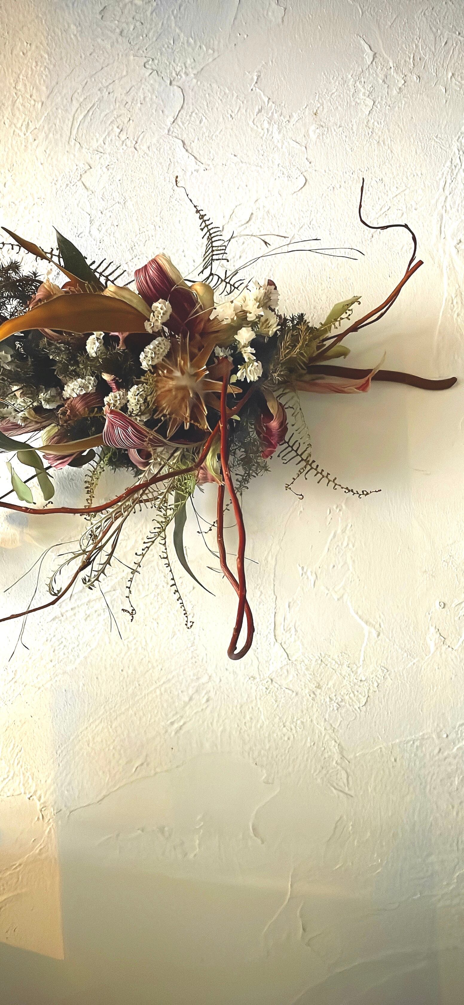 動きあるボルドーカラーの大和ルージュ壁掛けアレンジ