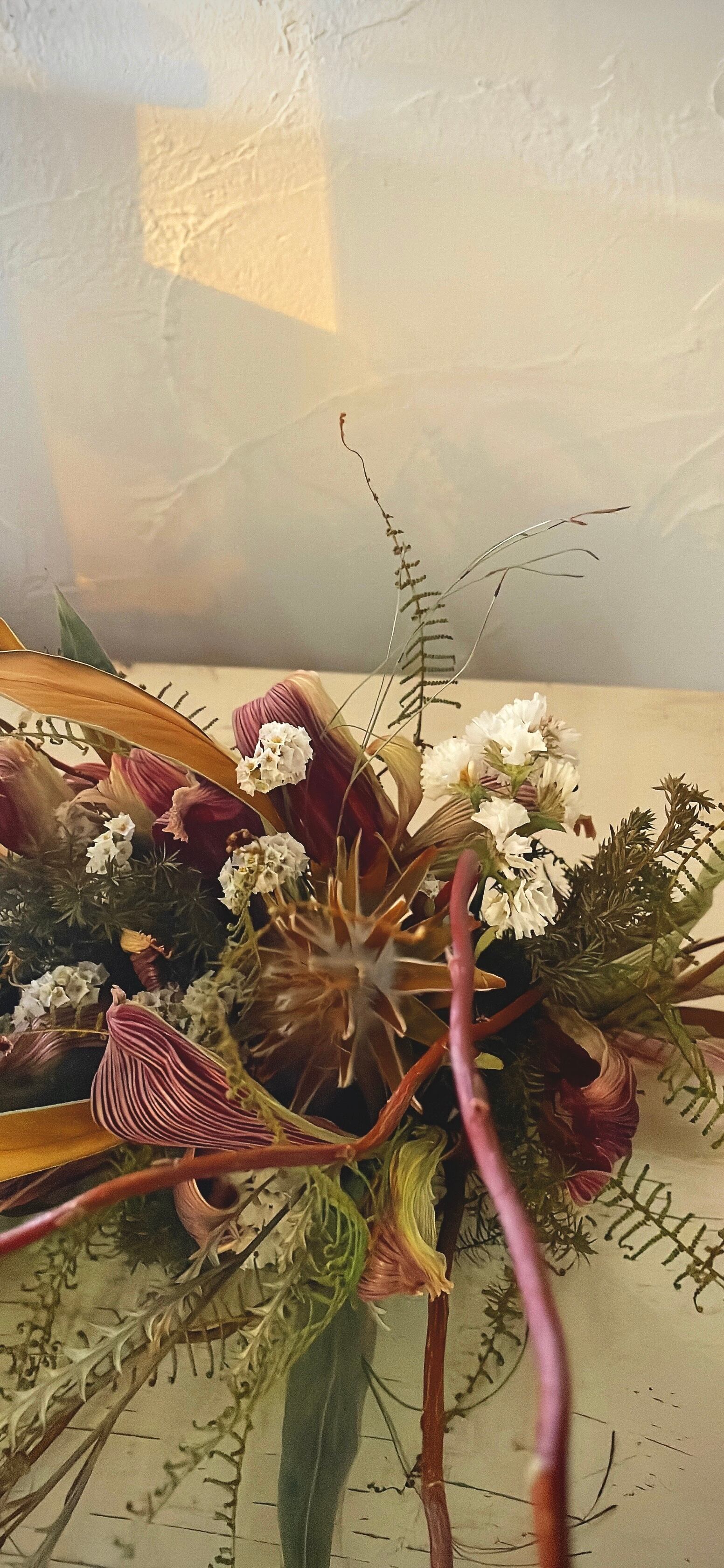 豪華でありながら繊細なボルドーカラーの大和ルージュ壁掛けアレンジ。