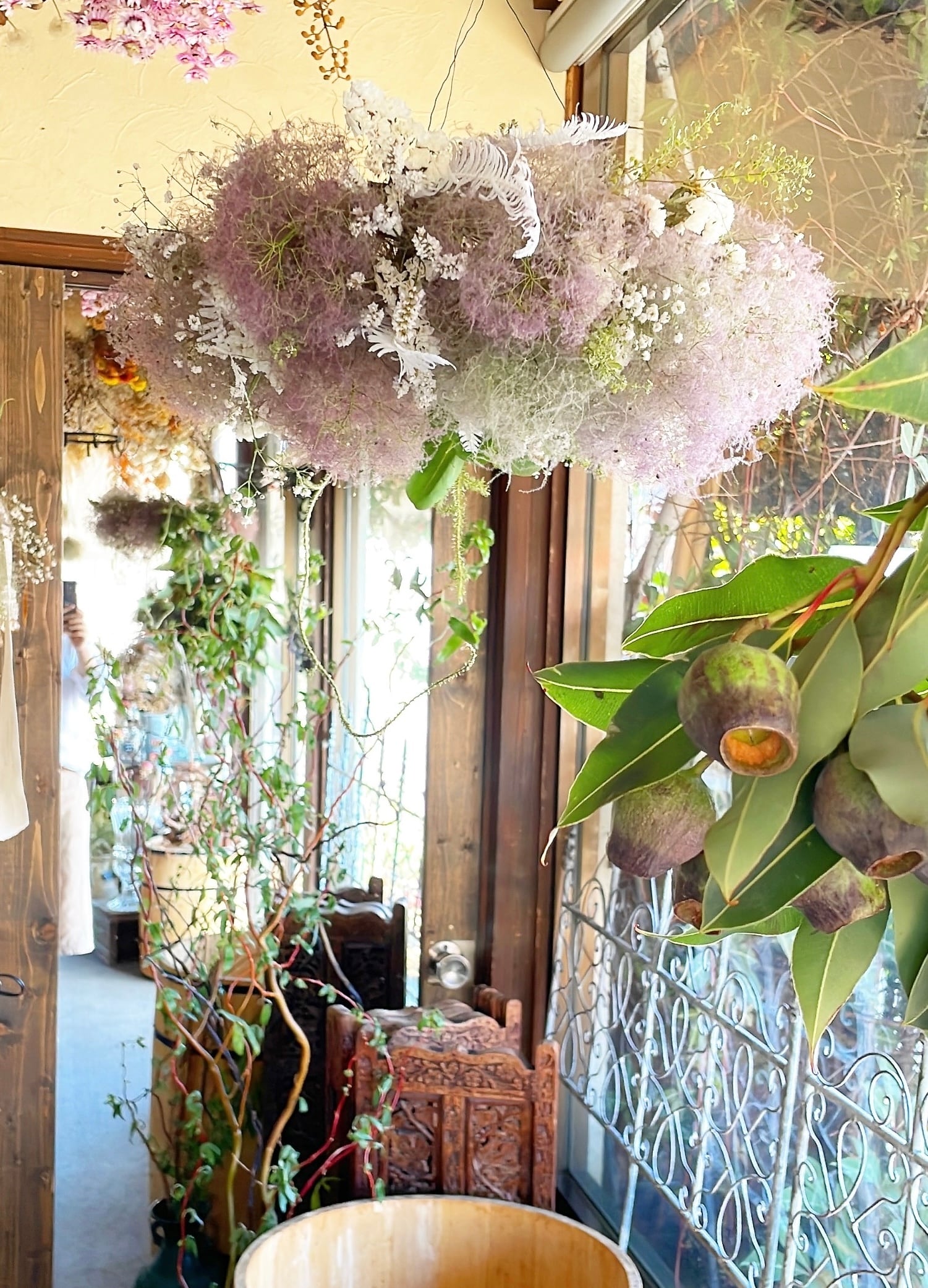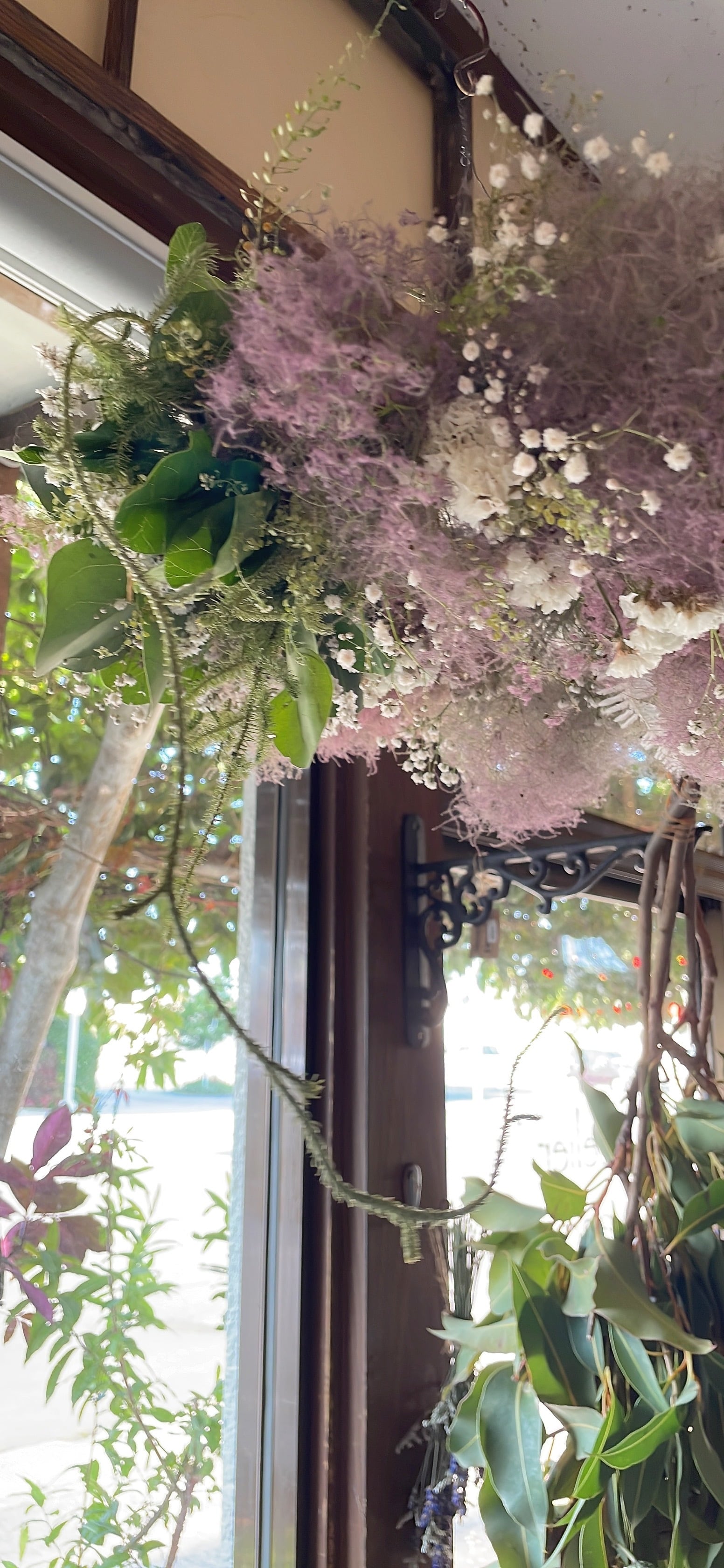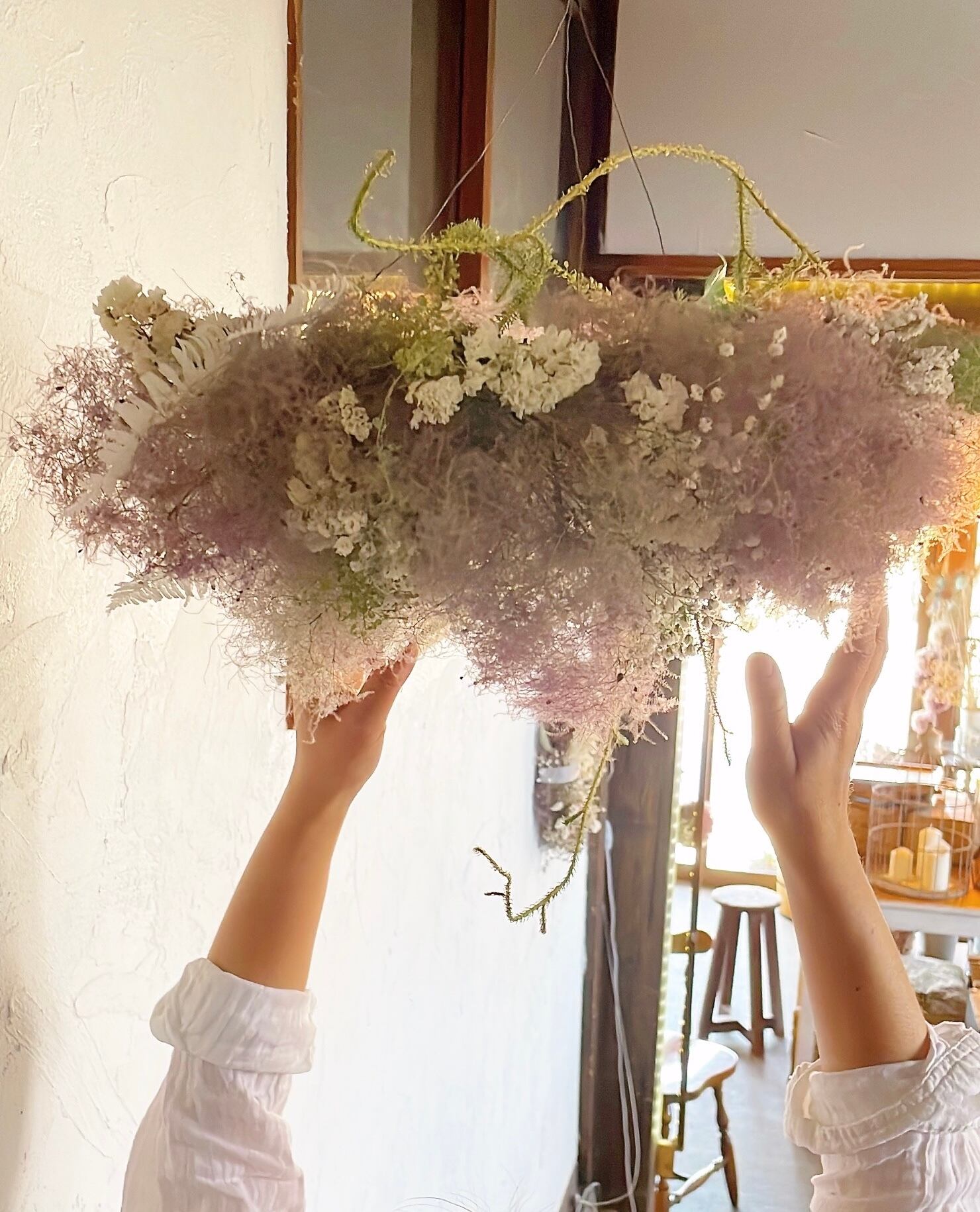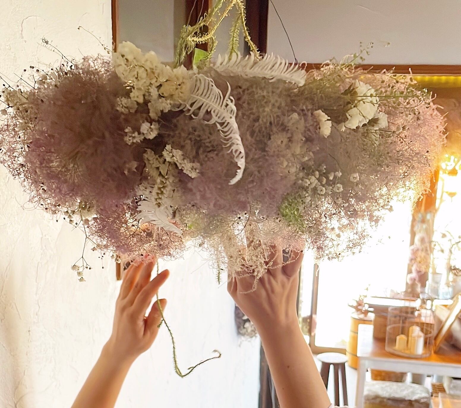 画像には写すことが難しいのですが、リース中心部分にも花々が紡がれておりますので、真下からの眺めも素敵です。