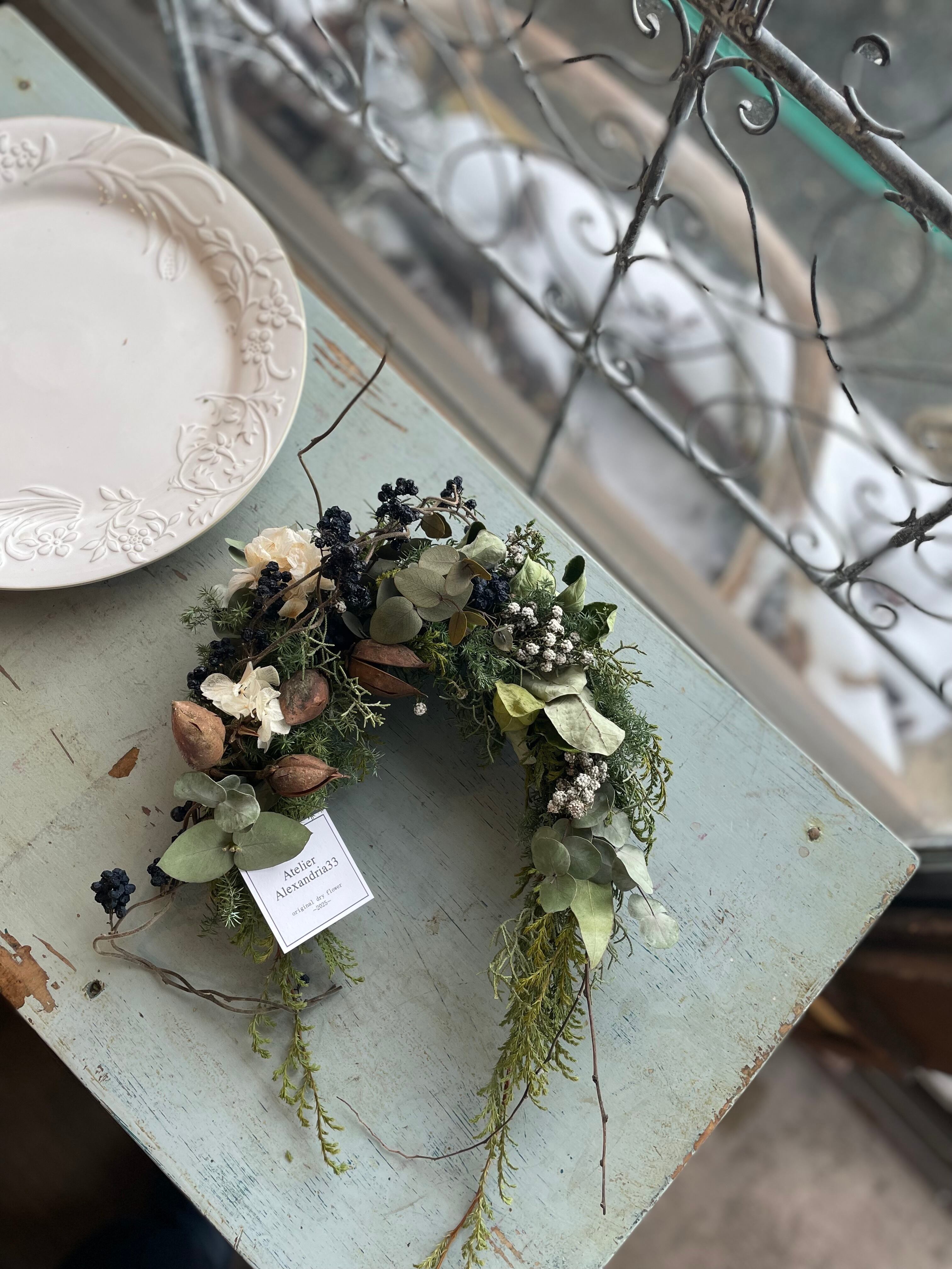 - 素材: ドライフラワー(白あじさい、葡萄の実)
