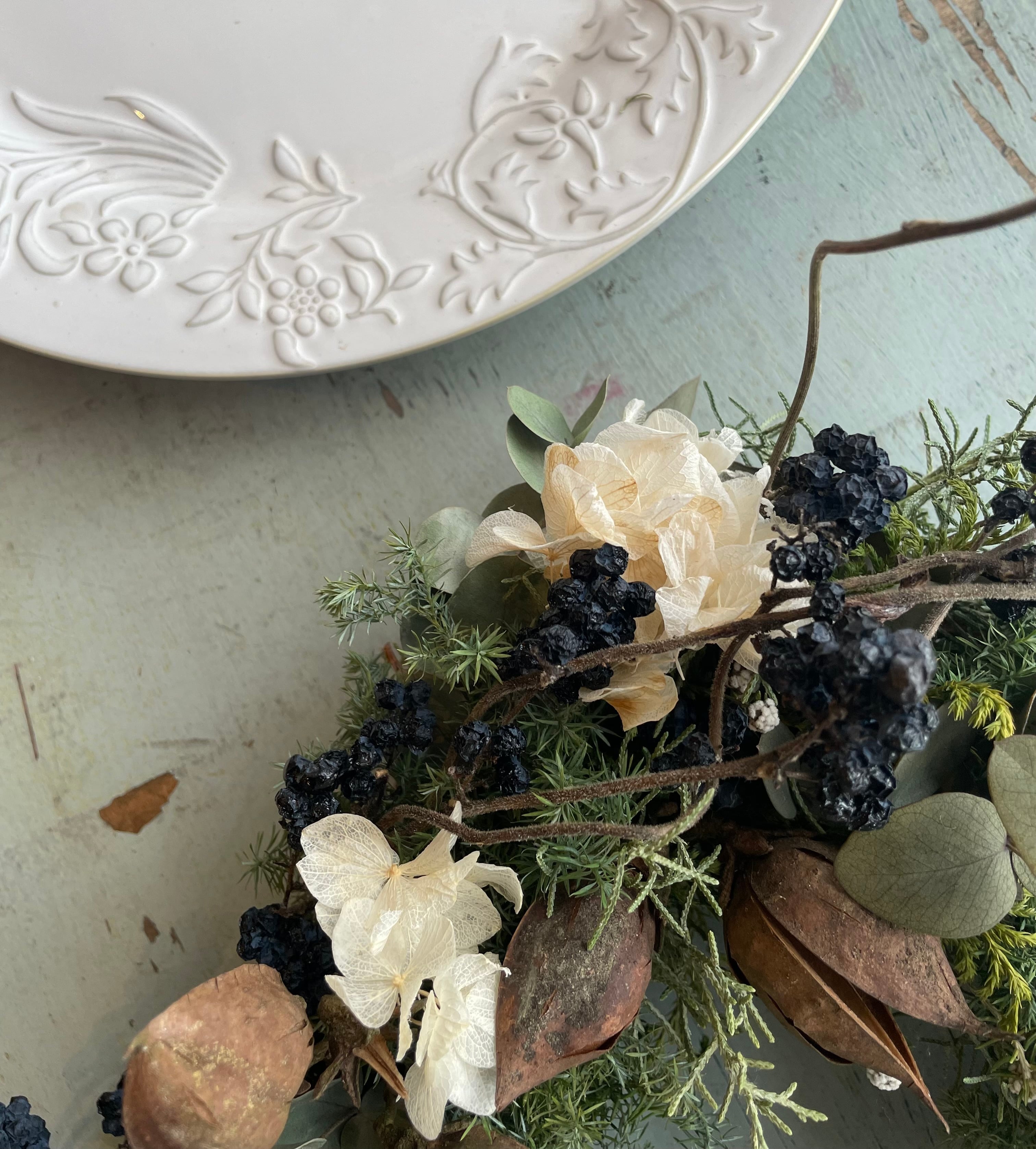 白あじさいの繊細な花と、豊かな葡萄の実が一体となり、リース全体にナチュラルな魅力を引き立てています。お部屋に飾るだけで、心が和む、リラックスできる空間を演出します。