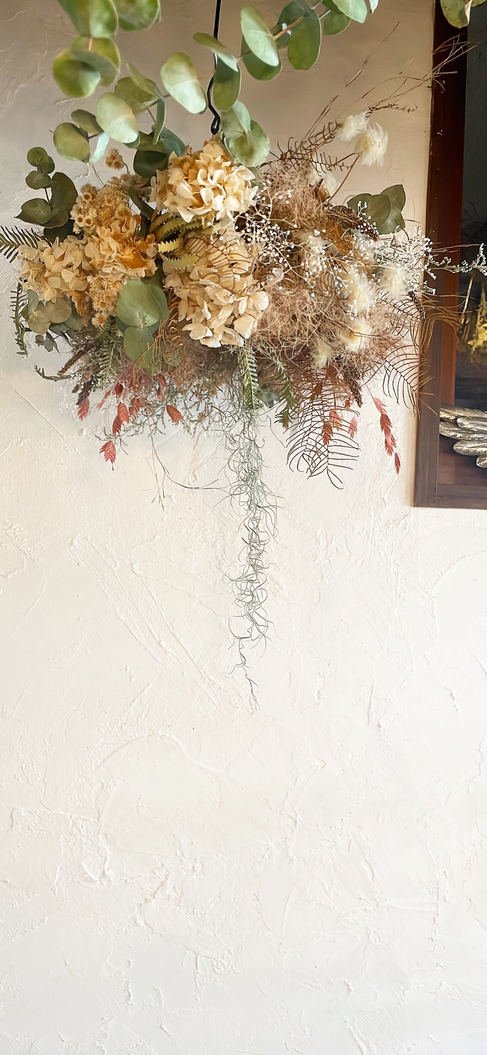 スモークツリーとアンティークあじさいの大きなフライングリース⚪︎ドライフラワーリース