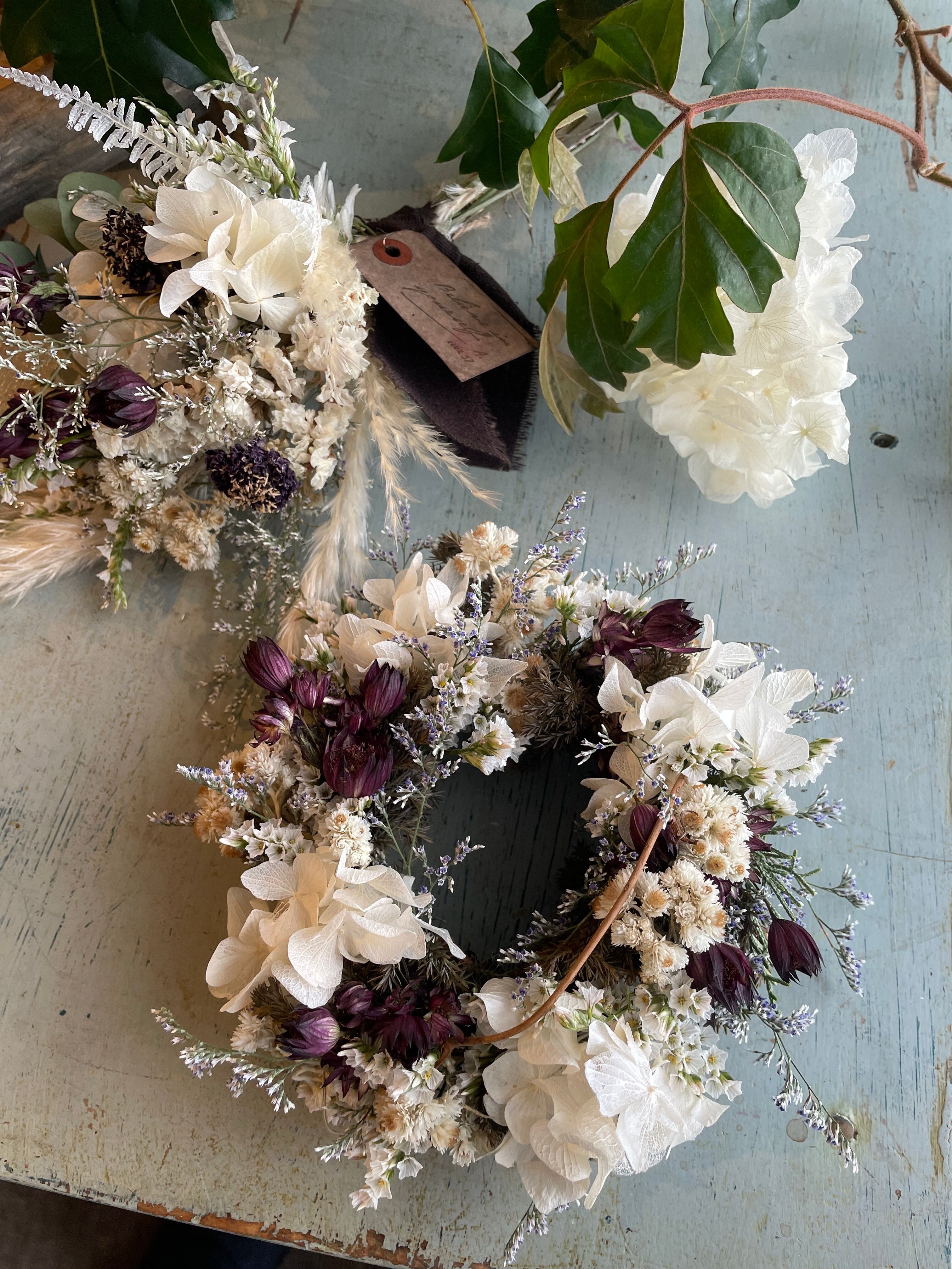 白いあじさいとアストランチアの手のひらにのる程のリース