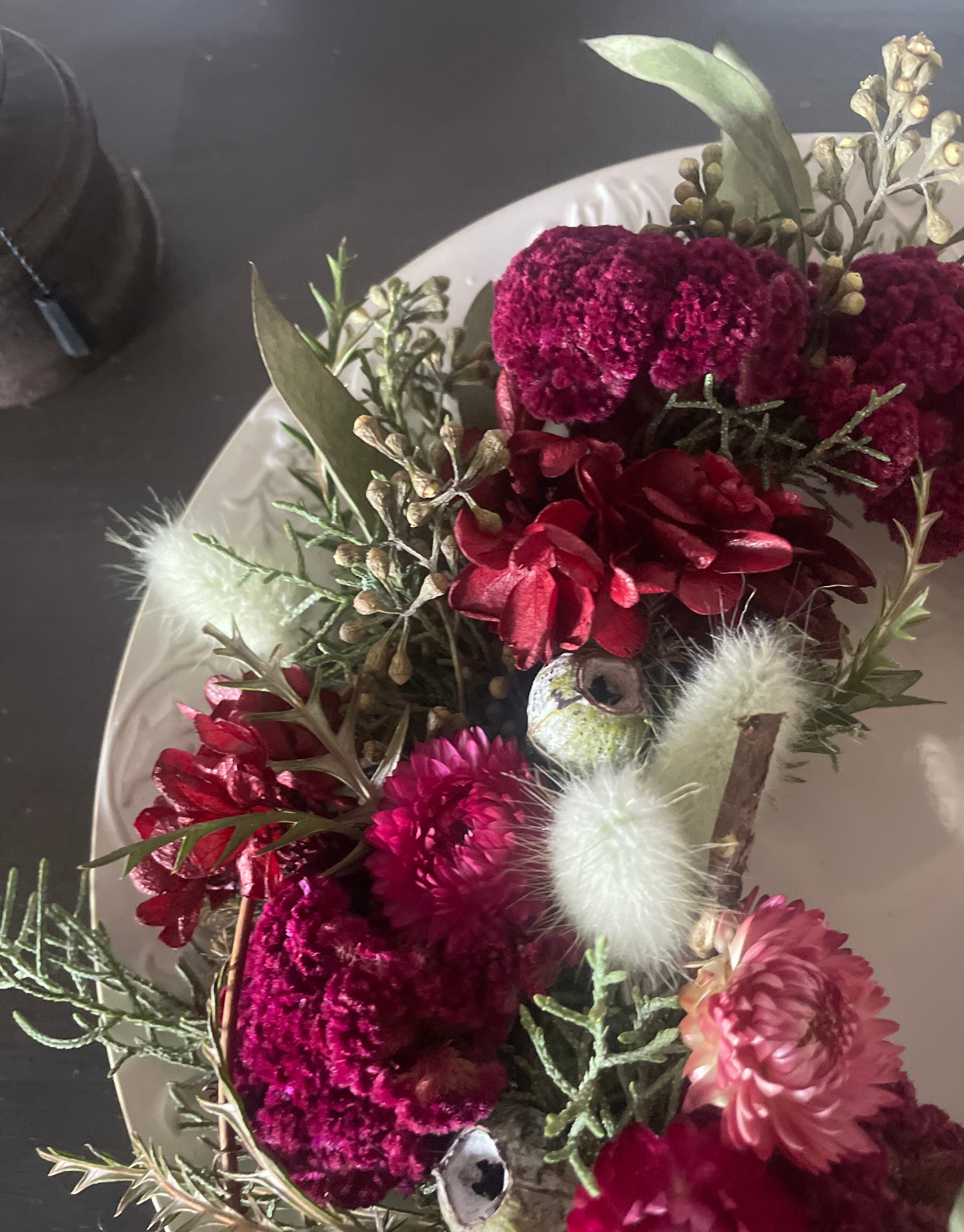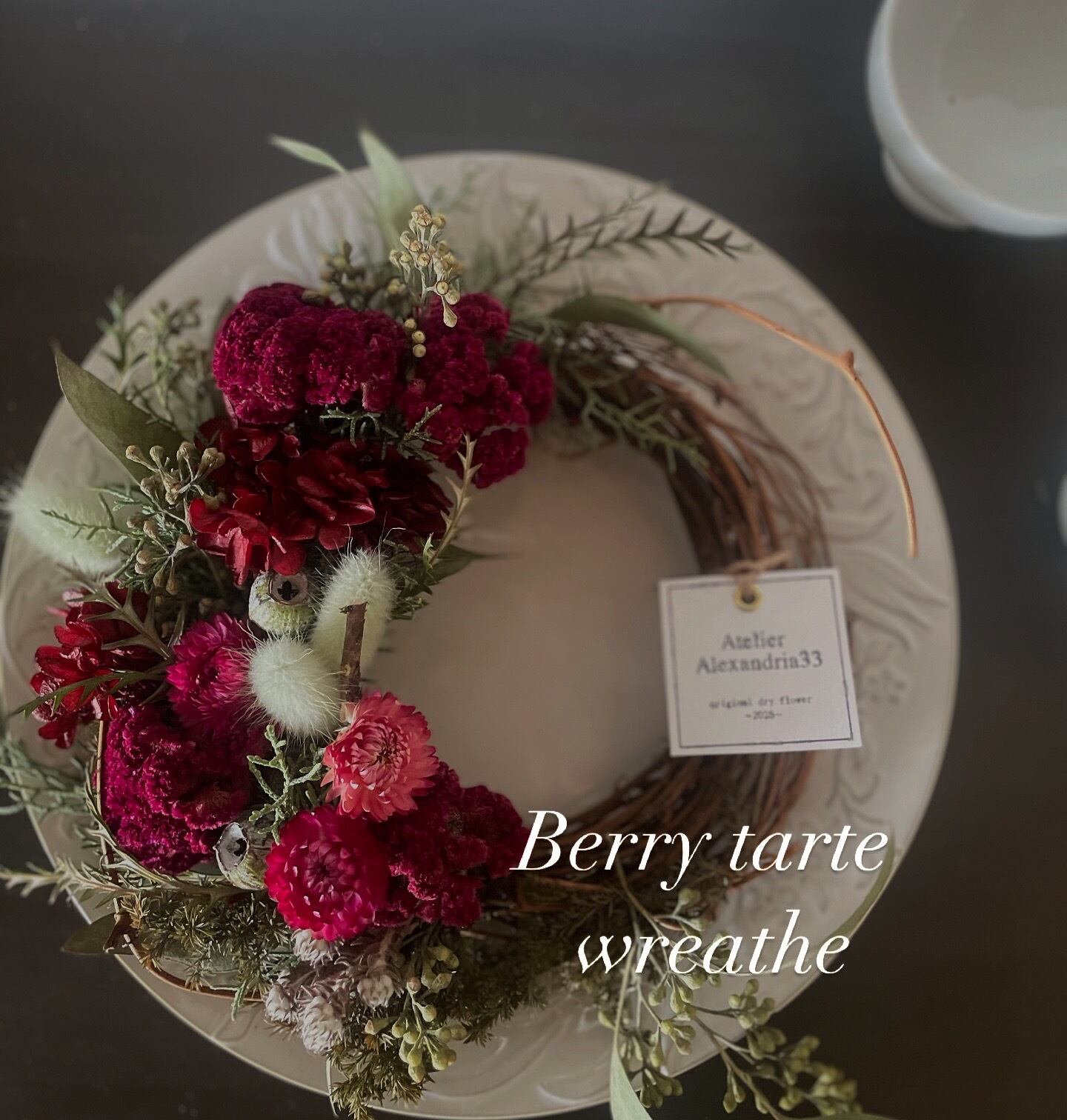 鮮やかな赤の彩りは、まるで本物のベリーを用いたかのように繊細であり、自然の美しさを大切にデザインされています。ドライフラワーの質感があたたかみを添え、さらに特別な雰囲気を演出します。