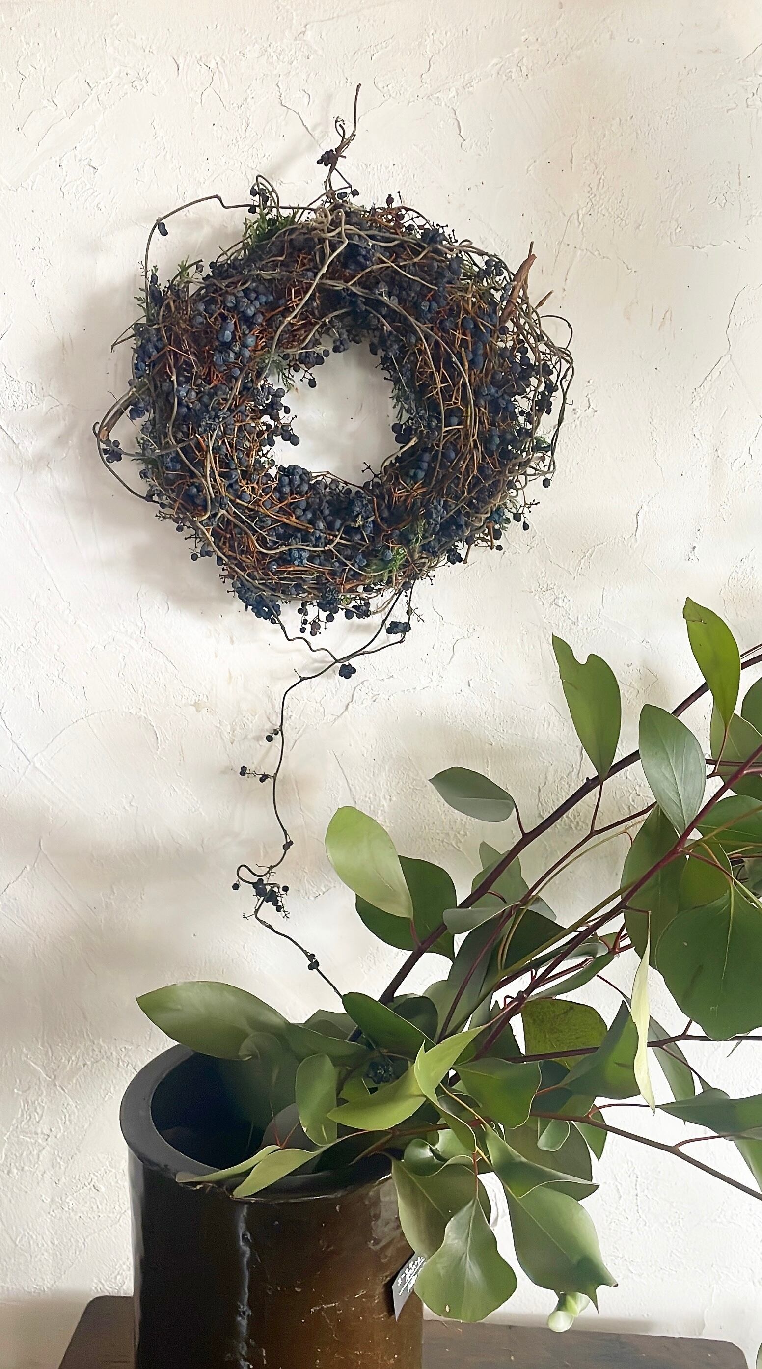 魅力的なヘンリー蔓と葡萄の実をふんだんに使った牧歌的なフレンチスタイルのワイルドリースです。このリースは自然の素材を活かし、豊かな色合いと質感で空間を彩ります。