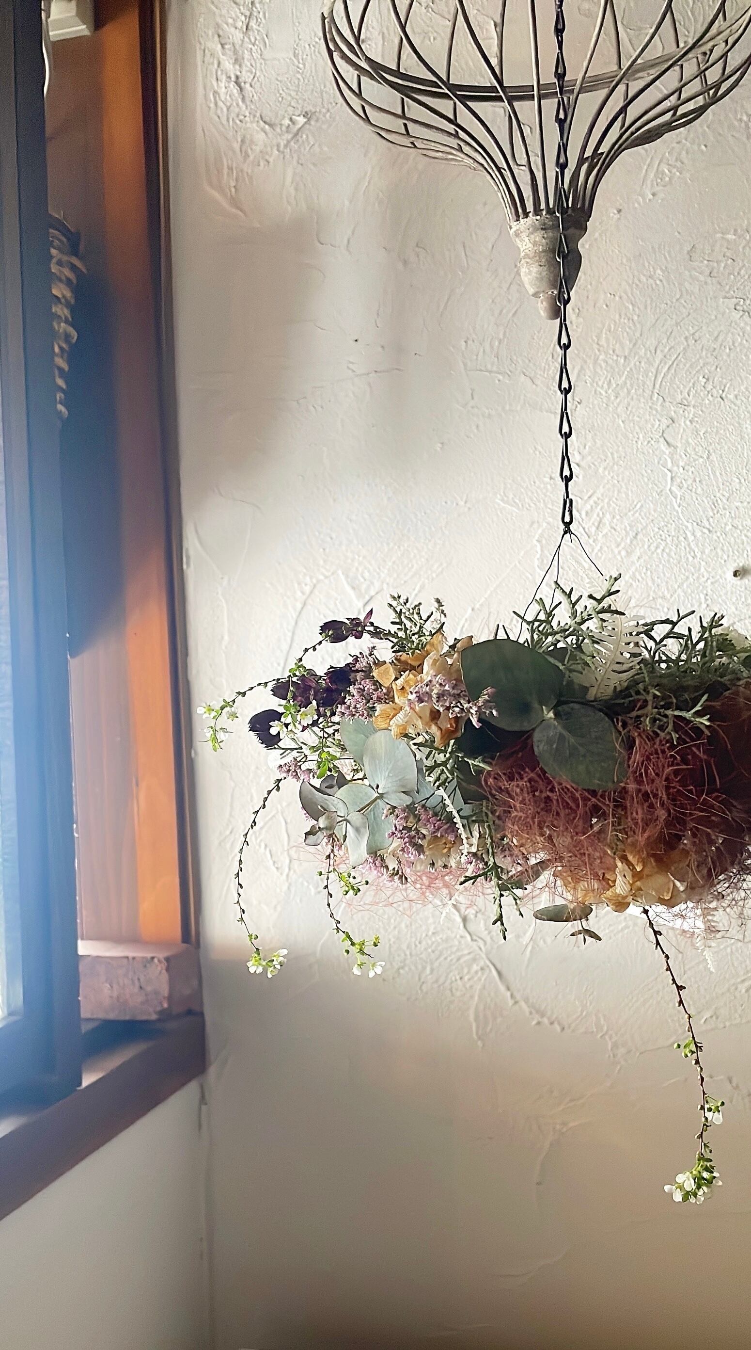 スモークツリーのふんわりとした質感とホワイトあじさいの清楚な美しさを融合させた、この空中に飾るリースは、あなたの空間をより魅力的に演出します。華やかさと優雅さを兼ね備え、どんな場所でも心地良い雰囲気を引き立てます。